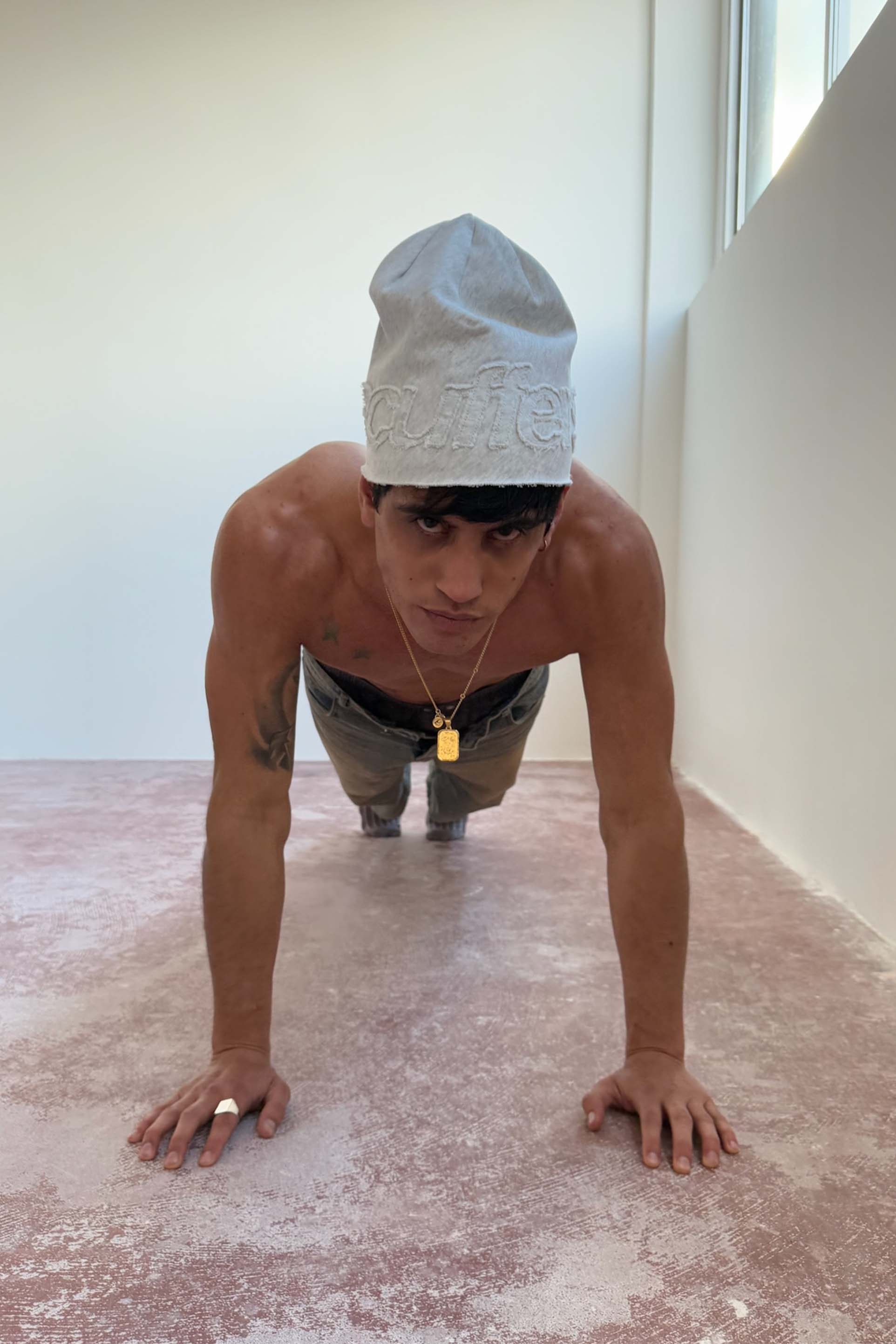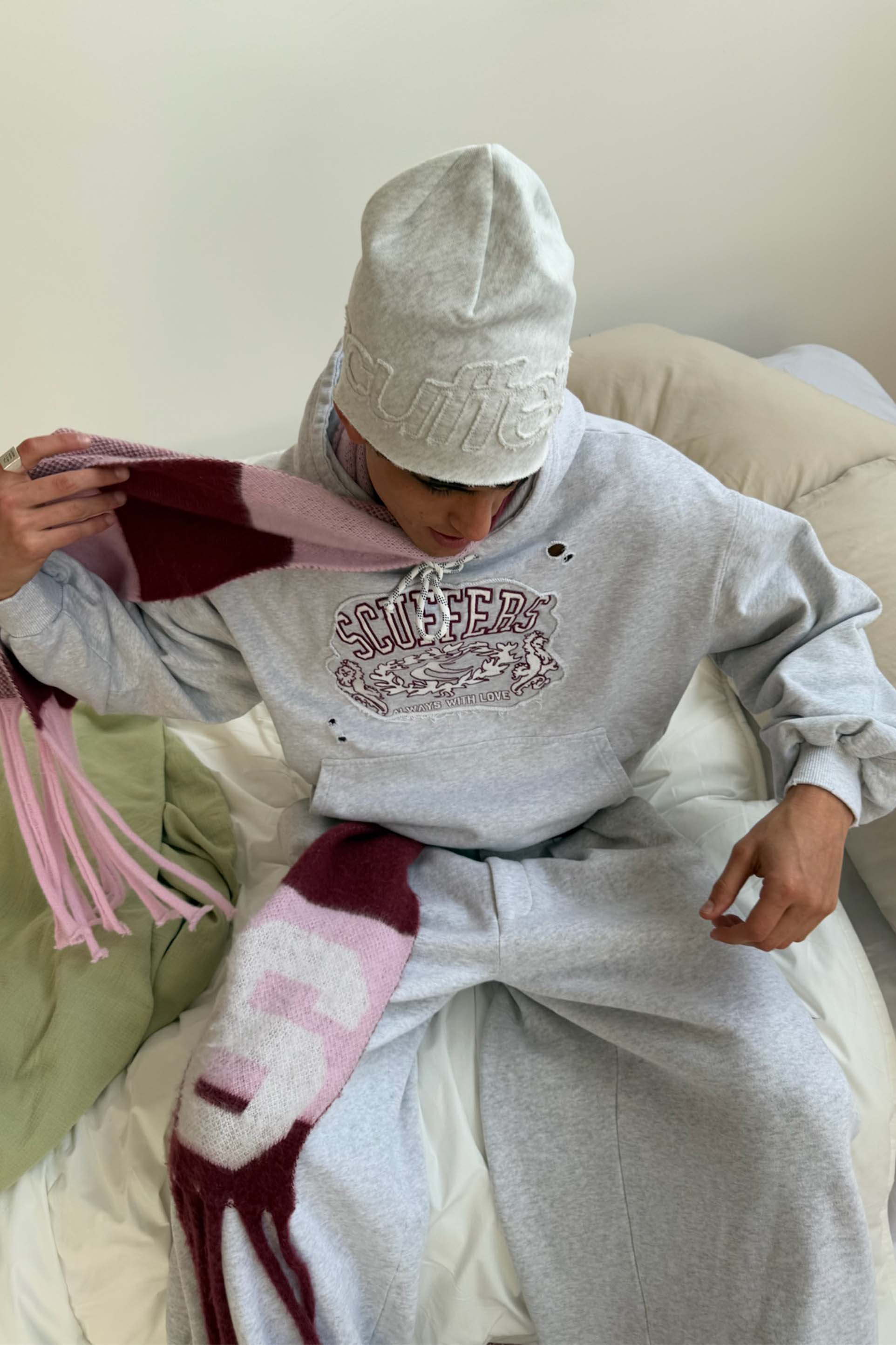 Grey Logo Beanie – Stretch cotton knit with tonal terry-texture Scuffers logo embroidery across front. Seamless crown construction with soft finish. Lightweight and fitted shape.