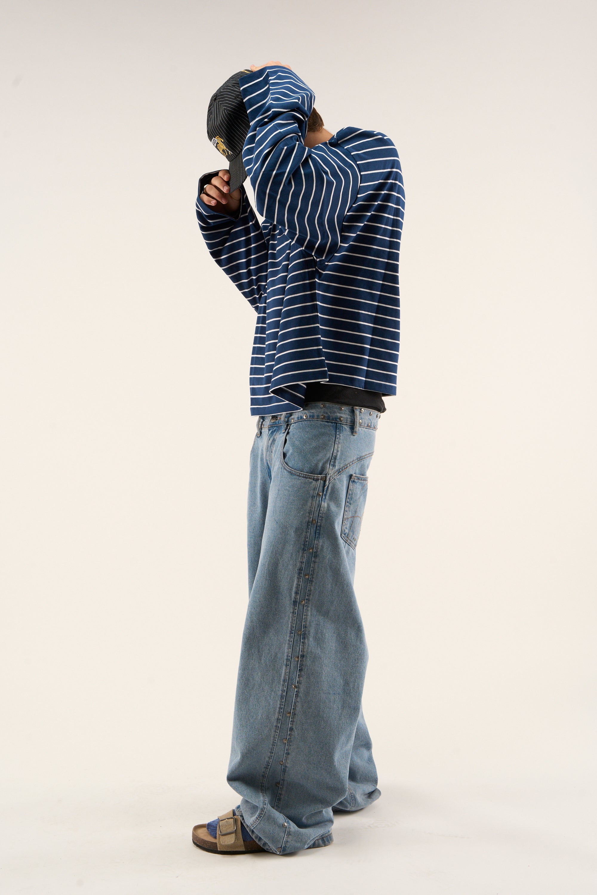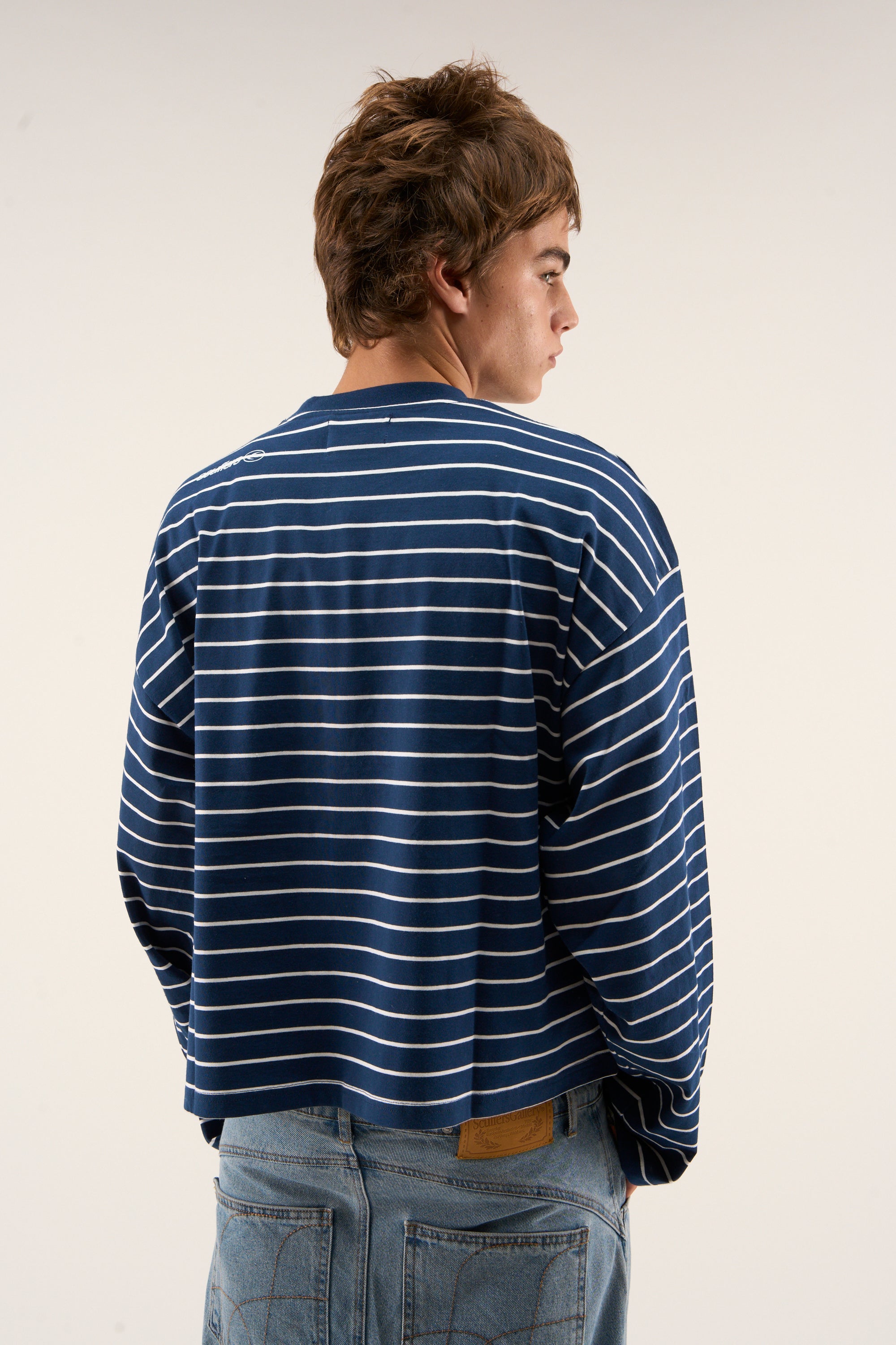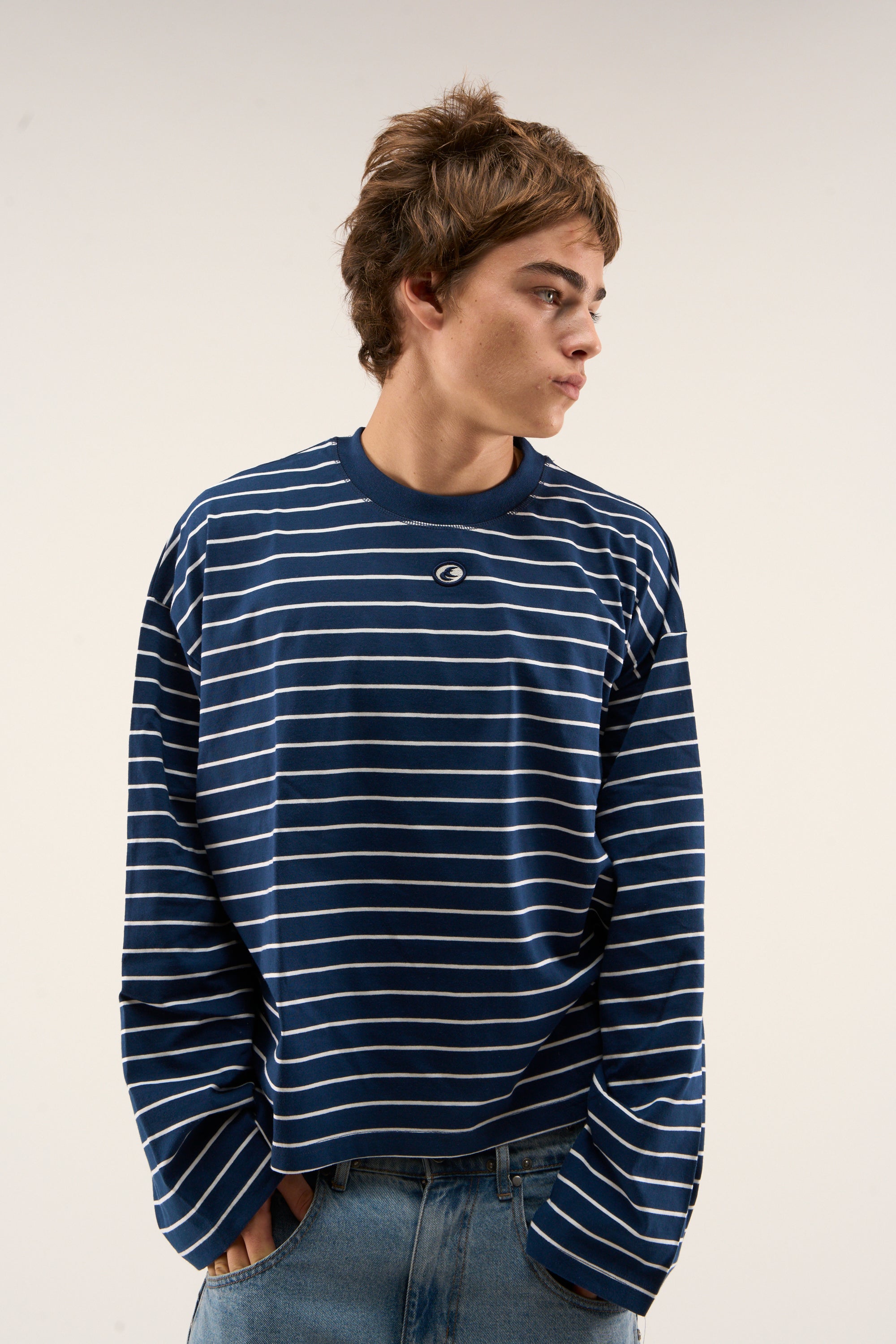 Striped Long-Sleeve T-Shirt in Navy with white horizontal stripes. Made from soft cotton for lightweight comfort. Features an embroidered logo on the chest and subtle branding on the back shoulder. Relaxed fit with ribbed crew neckline and dropped shoulders for a casual silhouette.