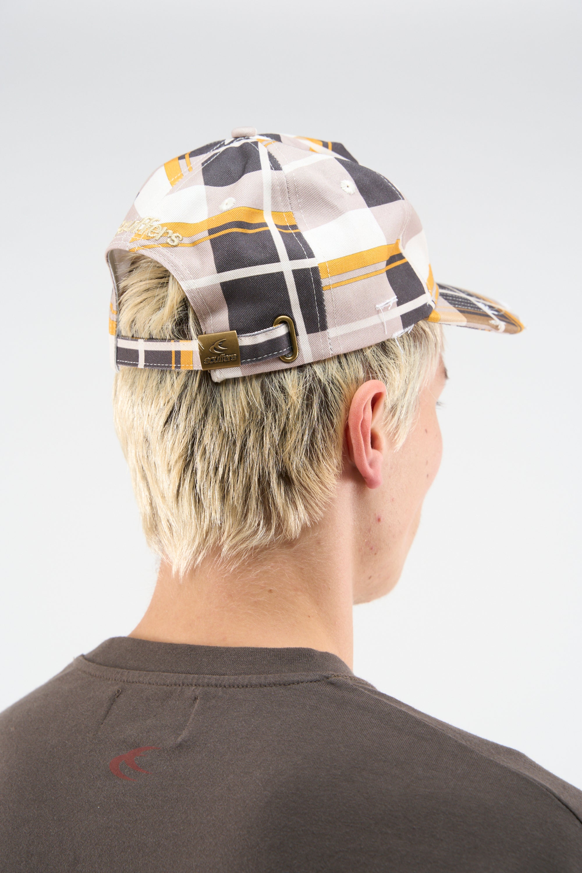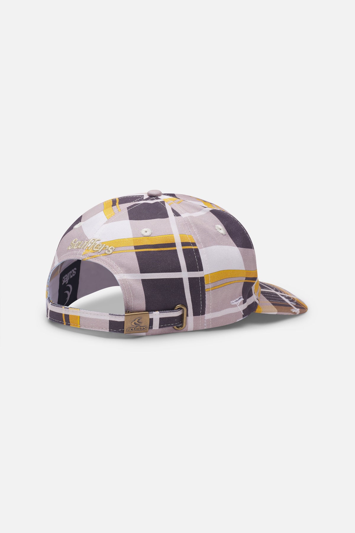 Yellow Check Cap made from cotton twill with an all-over plaid print in yellow, navy, and taupe. Features curved brim with light distressing, embroidered Scuffers logo at front and back, and metal eyelets for ventilation. Adjustable back strap with branded metal buckle.