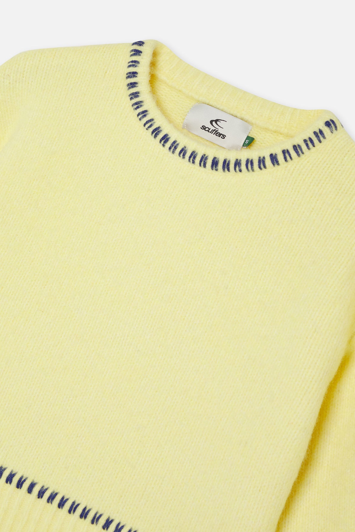 Yellow Sweater made from a brushed wool blend with a soft, textured finish. Features a relaxed fit, contrast blue stitch detailing at the collar, cuffs, and hem. Ribbed trim and Scuffers Studios label patch at back neck.
