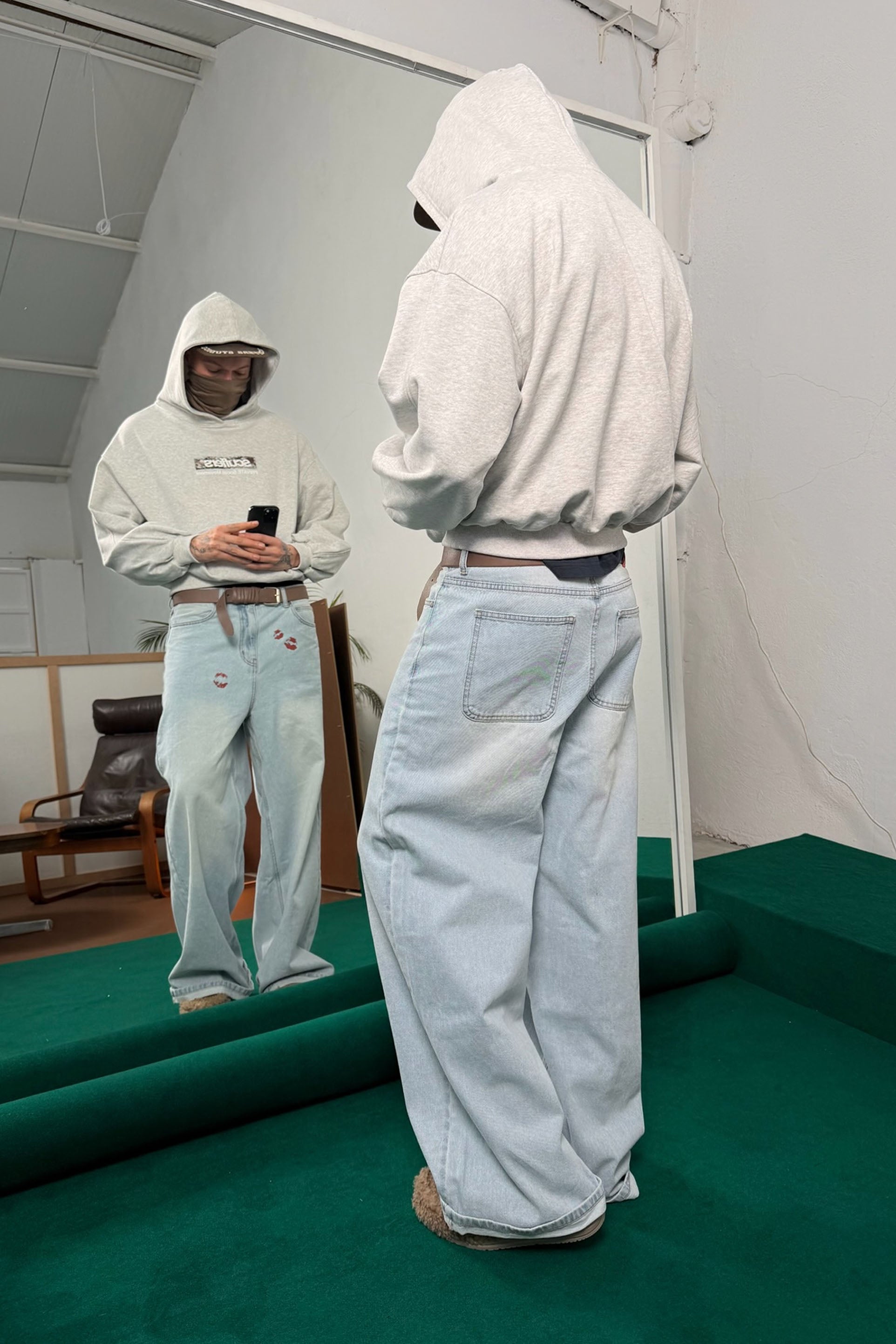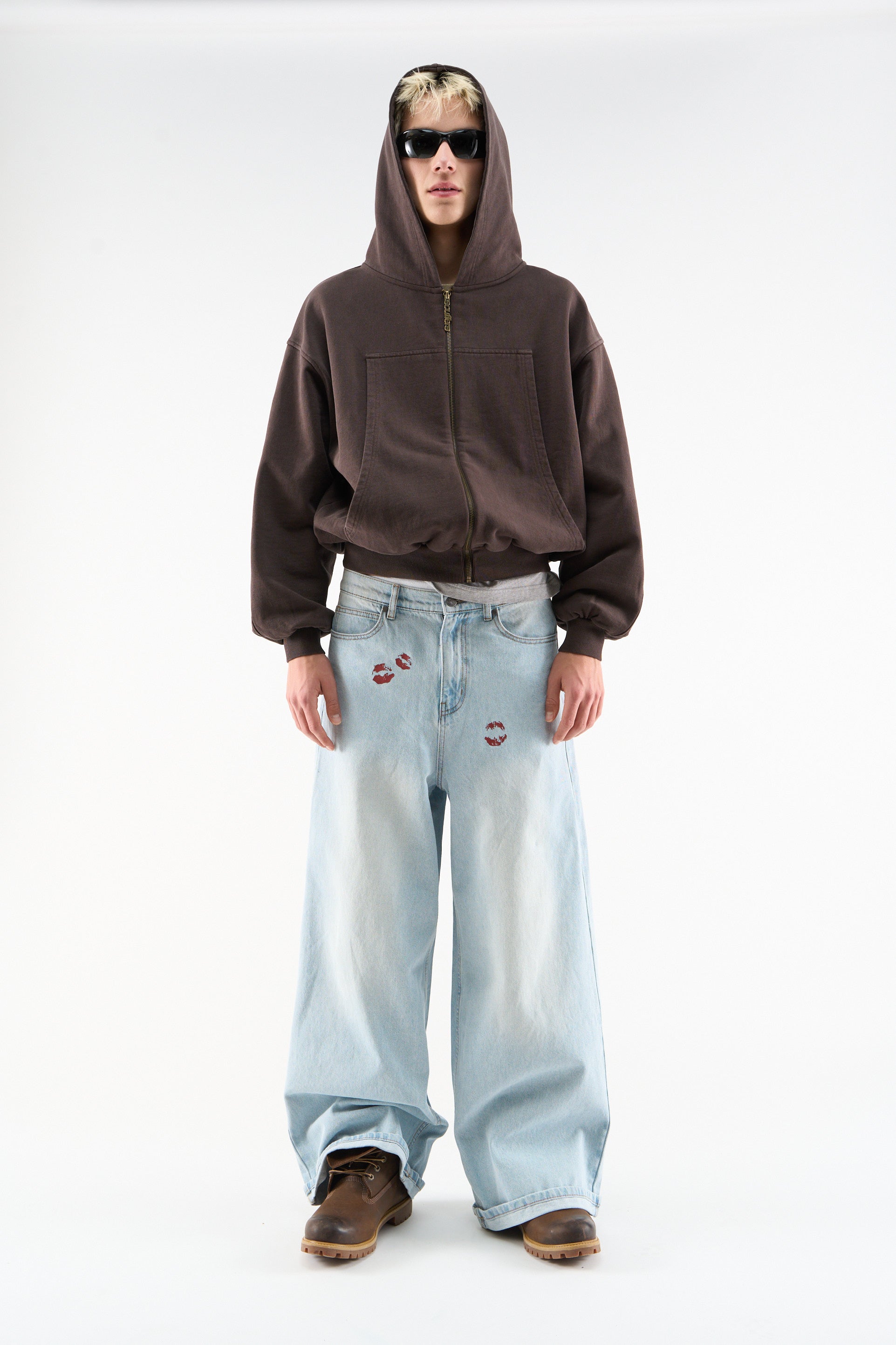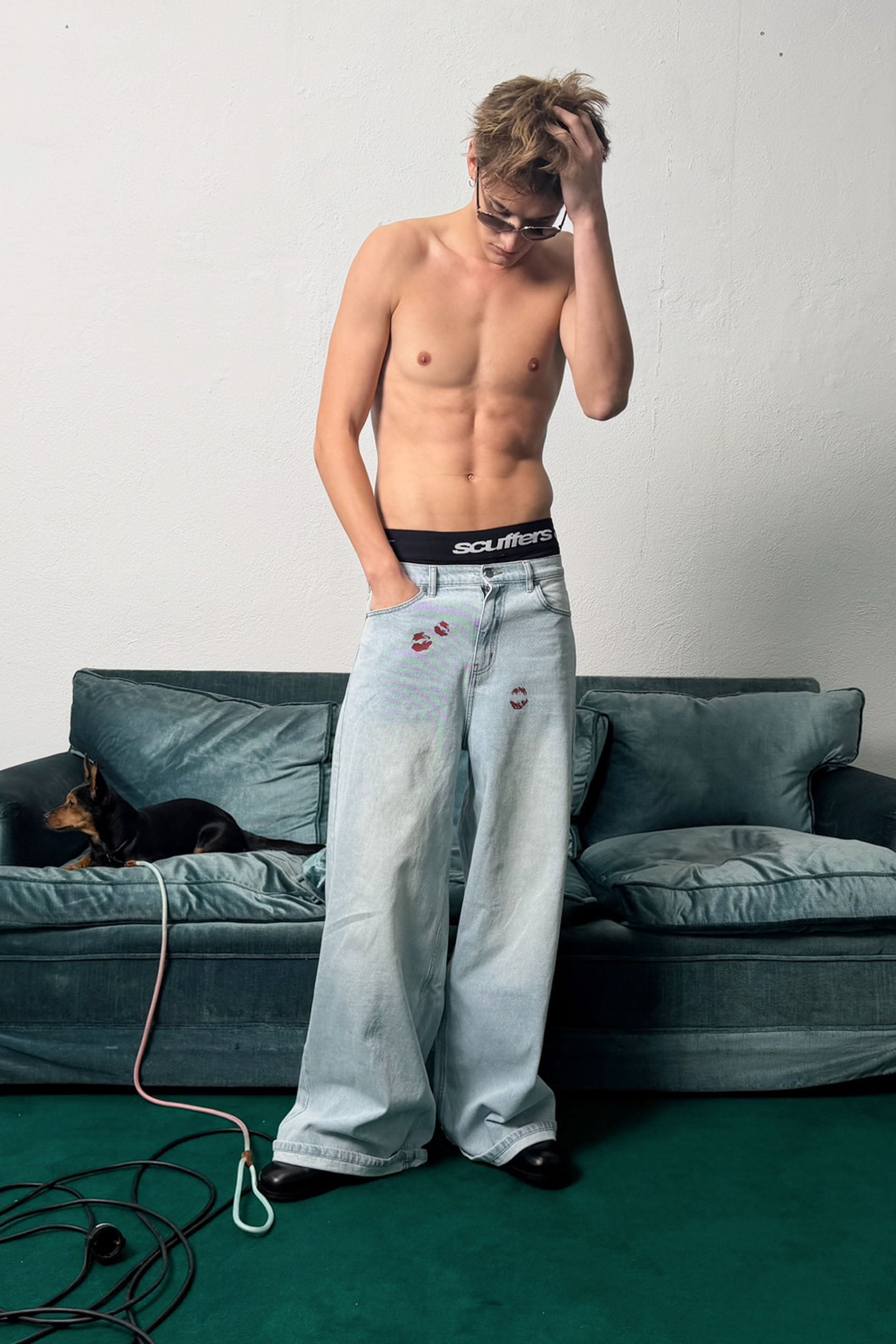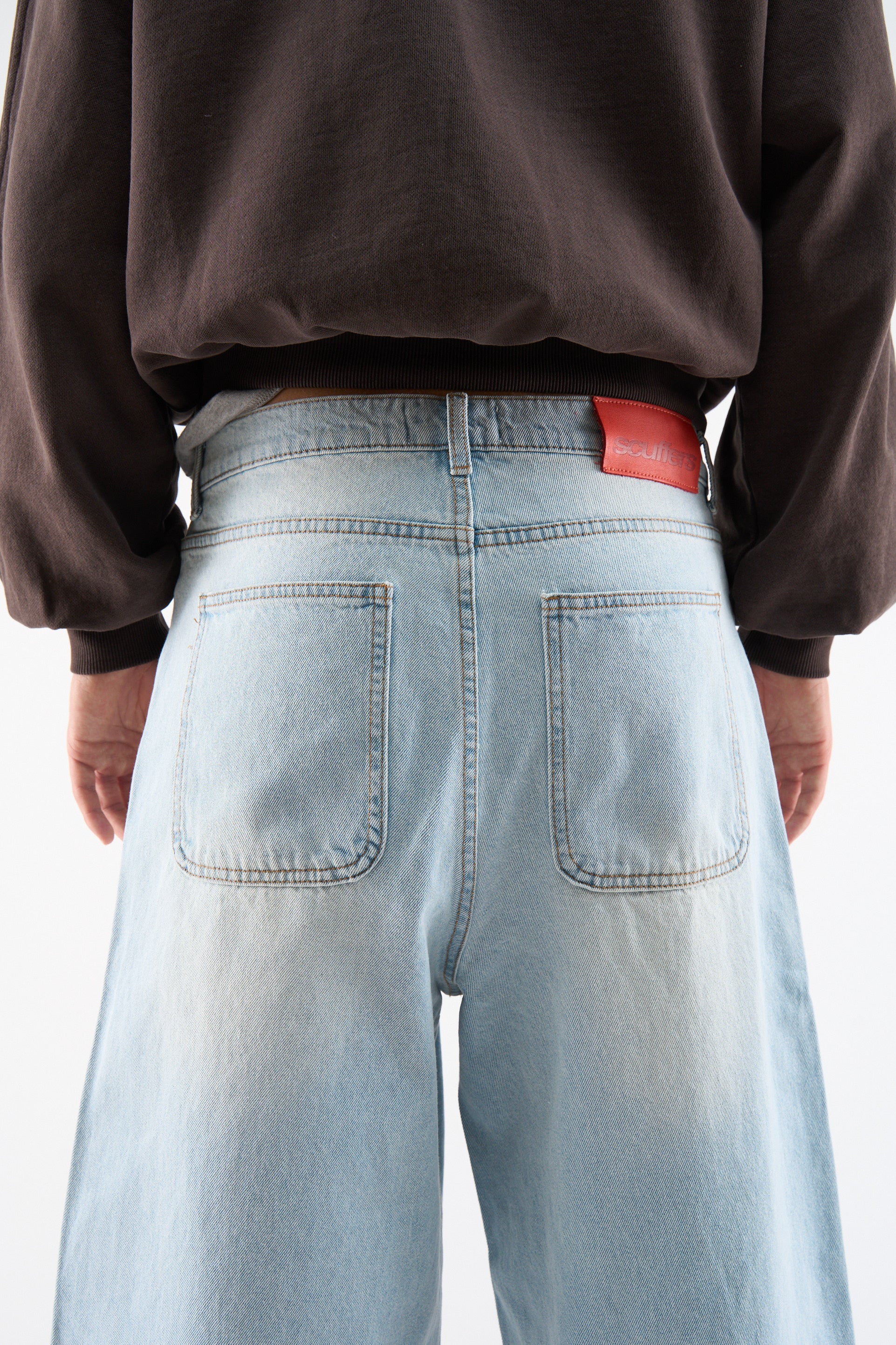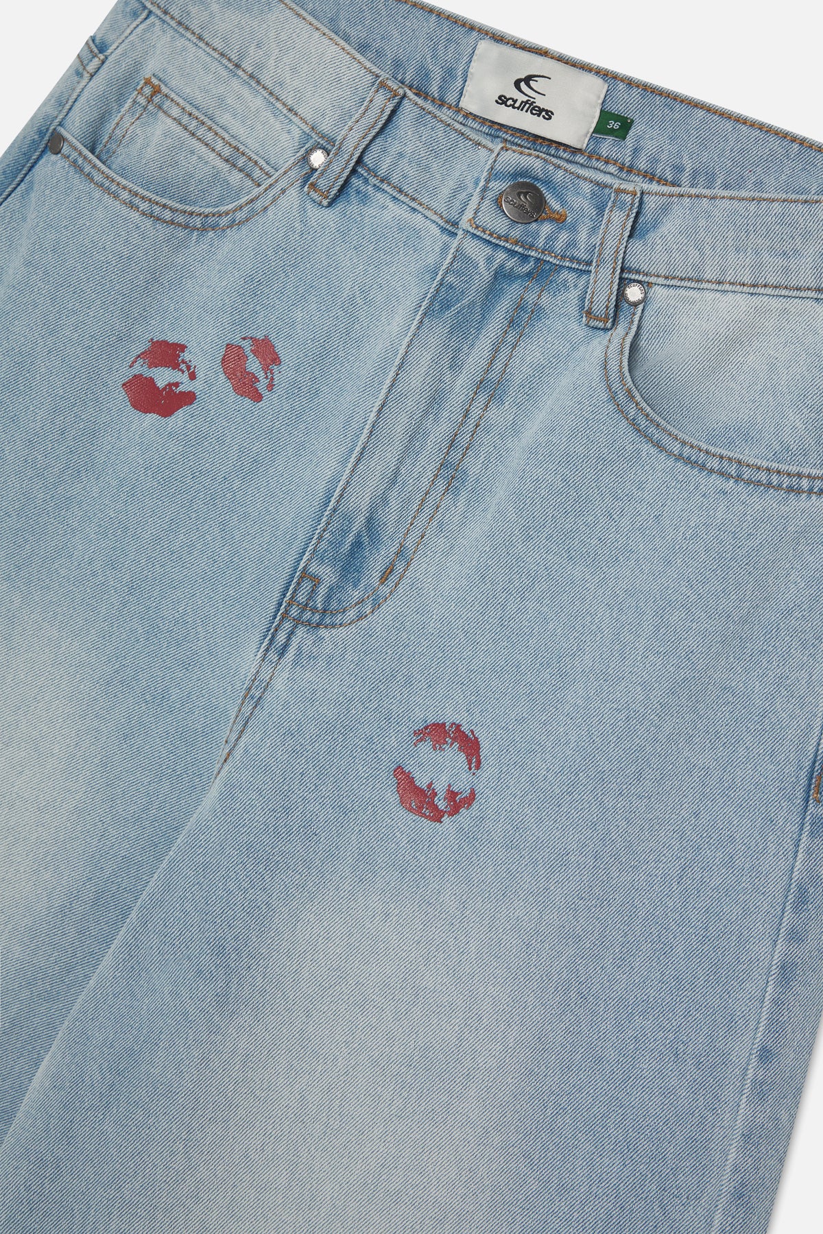 Light Blue Wide-Leg Jeans with a high-rise fit and faded wash. Features red kiss-print graphics on the front, classic five-pocket styling, and a bold red Scuffers® logo patch at the back waistband. Finished with logo-engraved hardware.