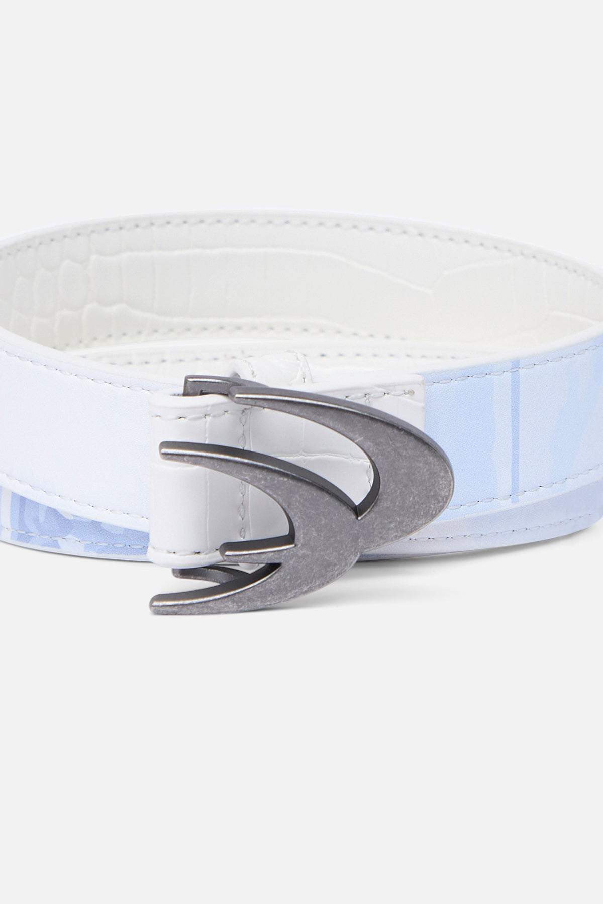 Reversible Belt made from faux leather with white crocodile-embossed texture on one side and light blue floral print on the other. Features matte silver-tone signature hook buckle and contrast stitching. Debossed Scuffers logo on floral side.