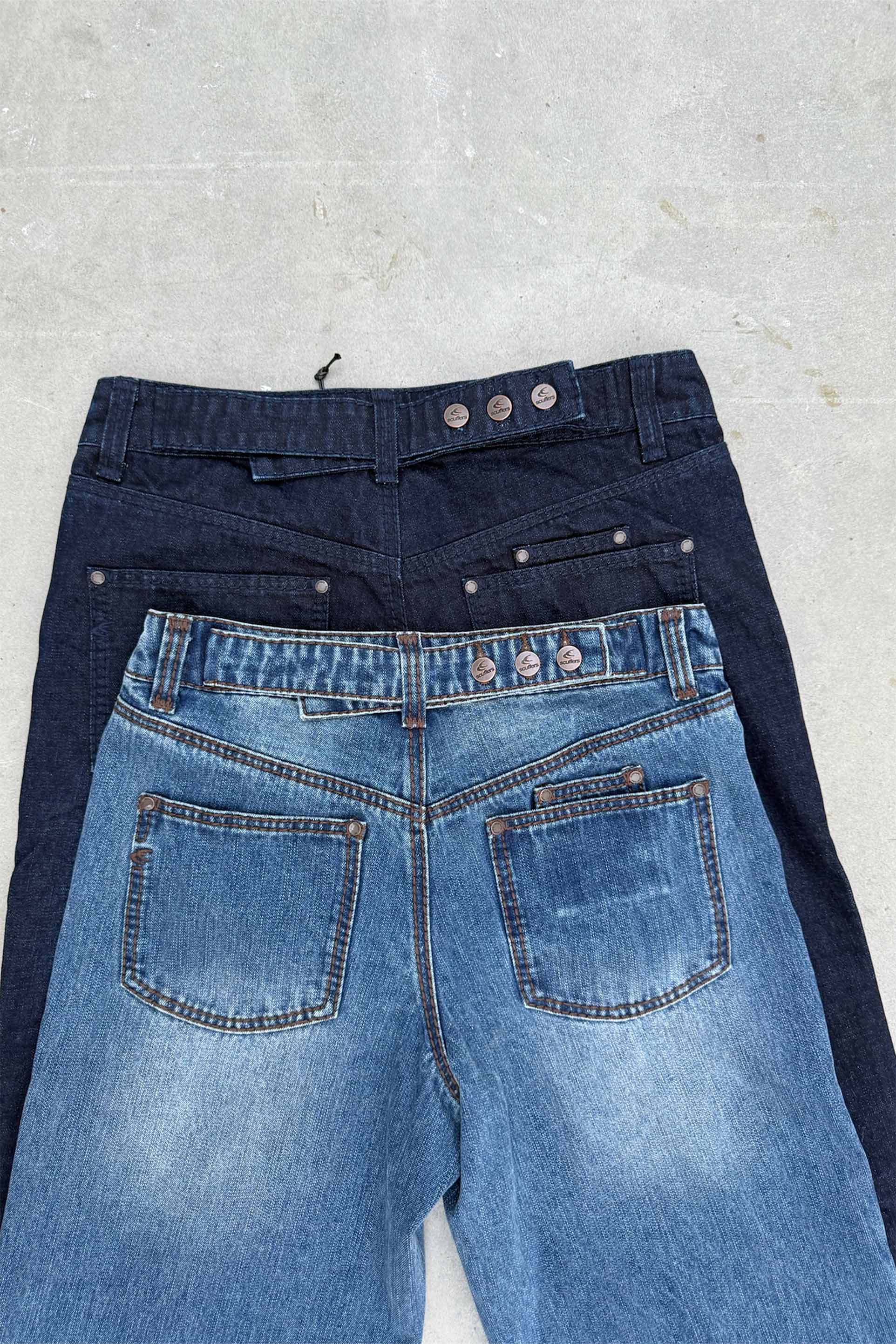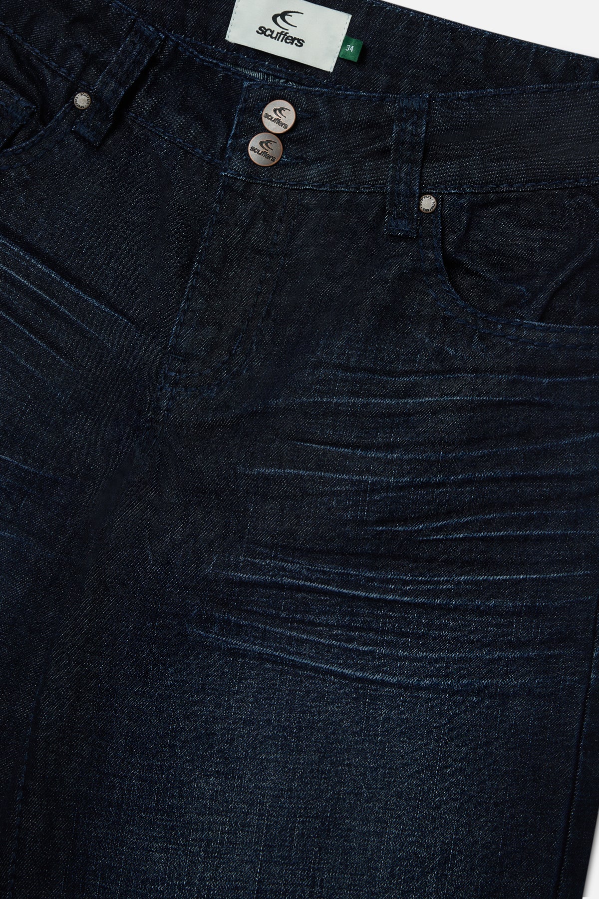 Faded Wide-Leg Jeans made from dark-wash cotton denim with subtle front and back fading. Features a high-rise waist, wide leg, and double-button closure with zip fly. Classic 5-pocket design with contrast stitching and metal Scuffers hardware. Rear waistband detail with triple-button accent.