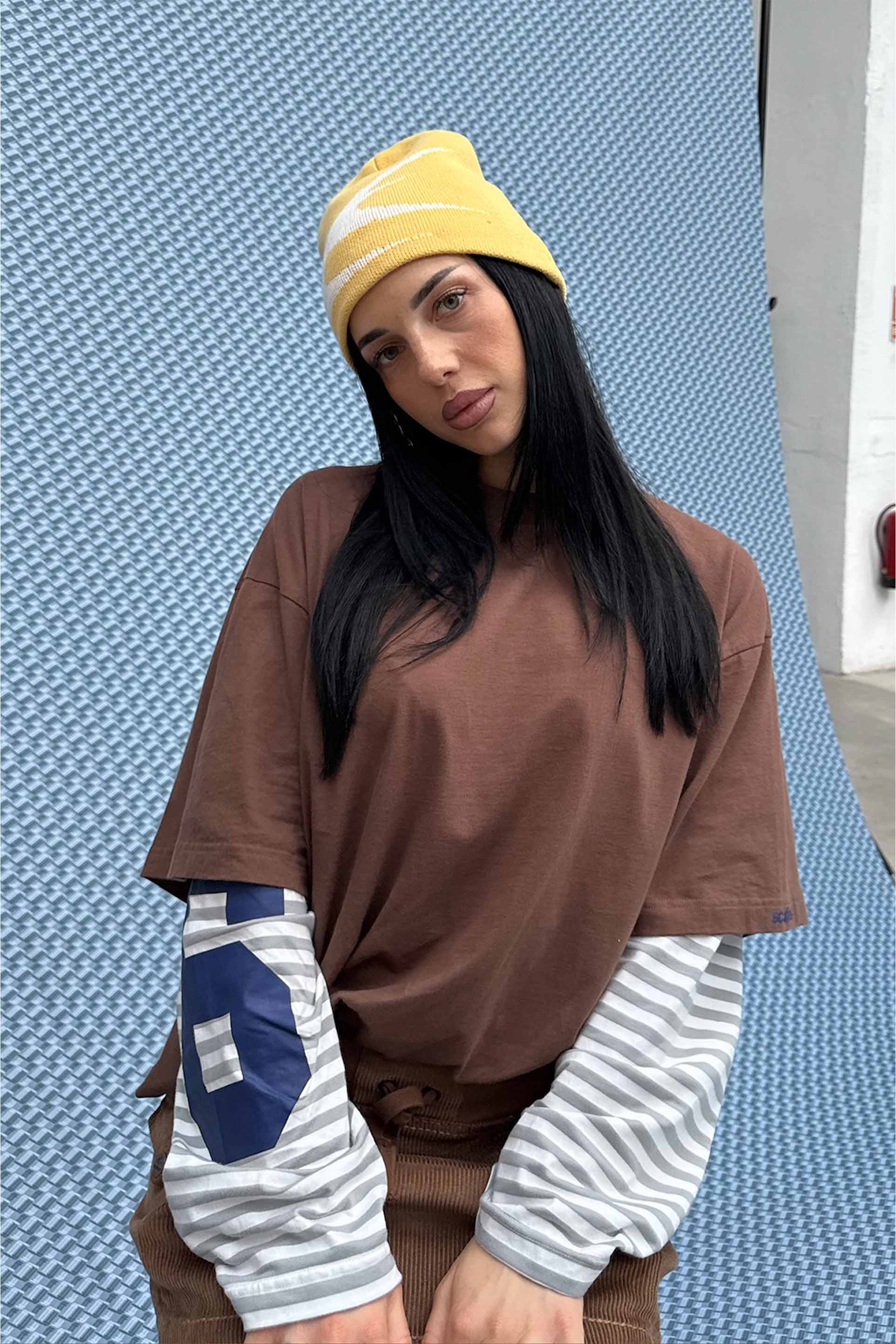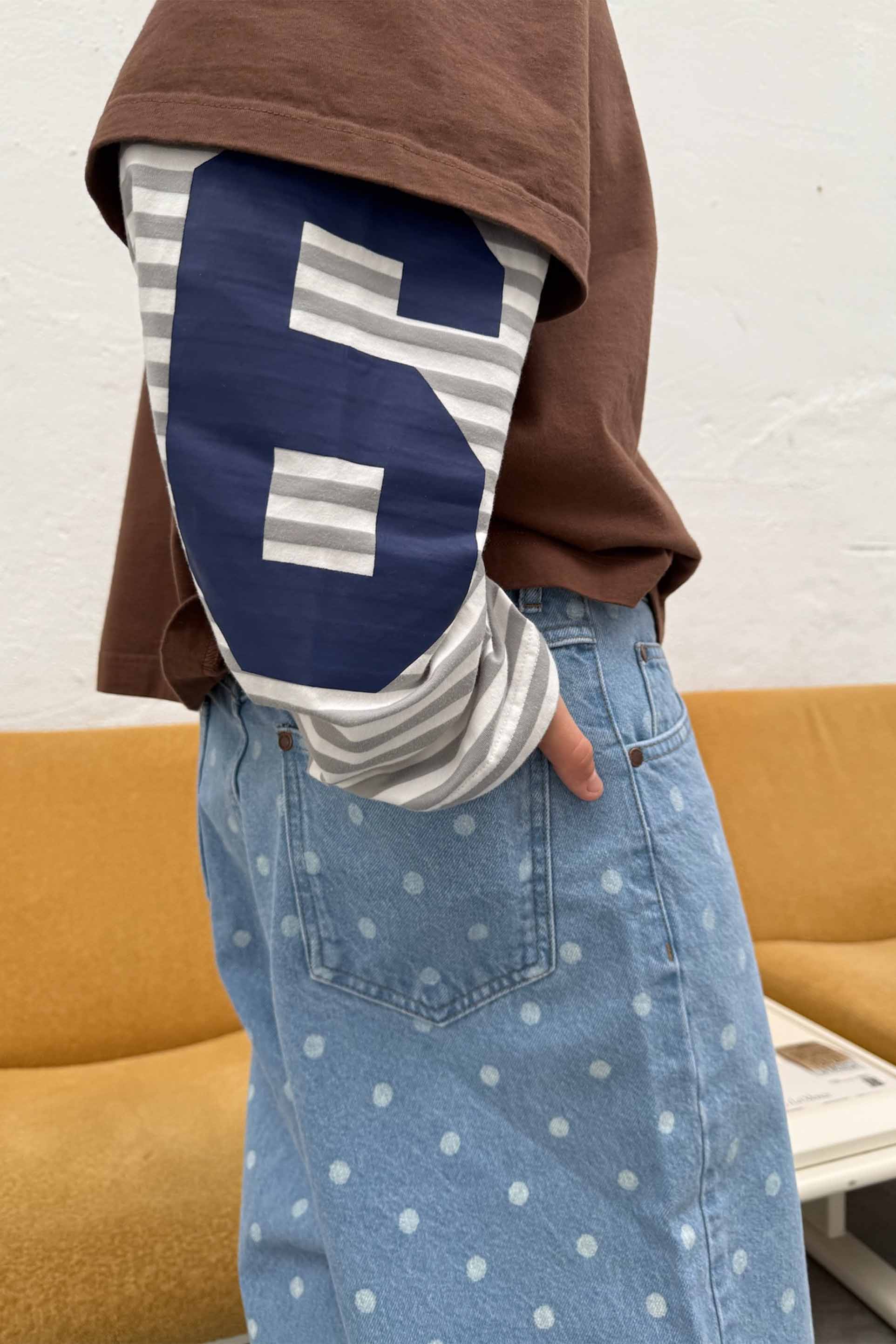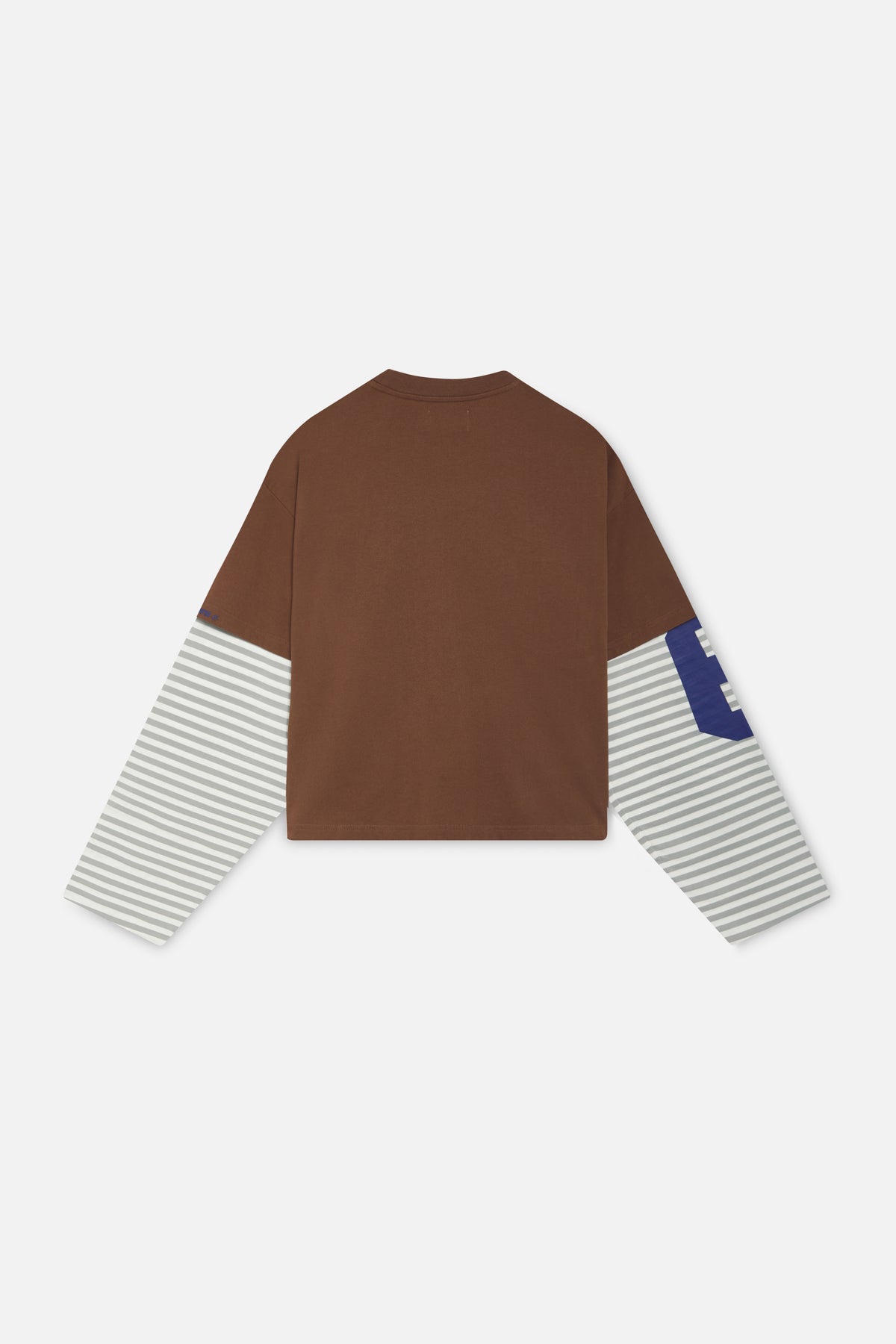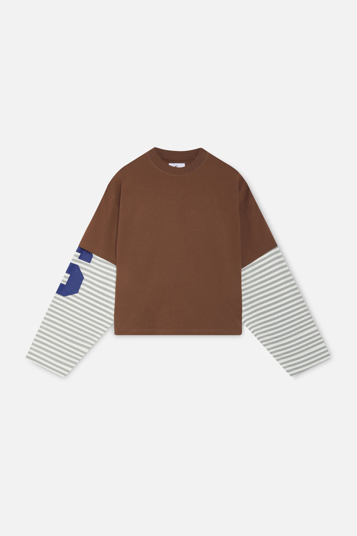 Colorblock Long Sleeve Tee featuring a brown body with contrasting striped sleeves in grey and white. The left sleeve has a large white number “5” print, while the right sleeve is plain striped. Made from soft cotton jersey with a relaxed, boxy fit and a classic crew neckline. Scuffers logo tag at neckline.