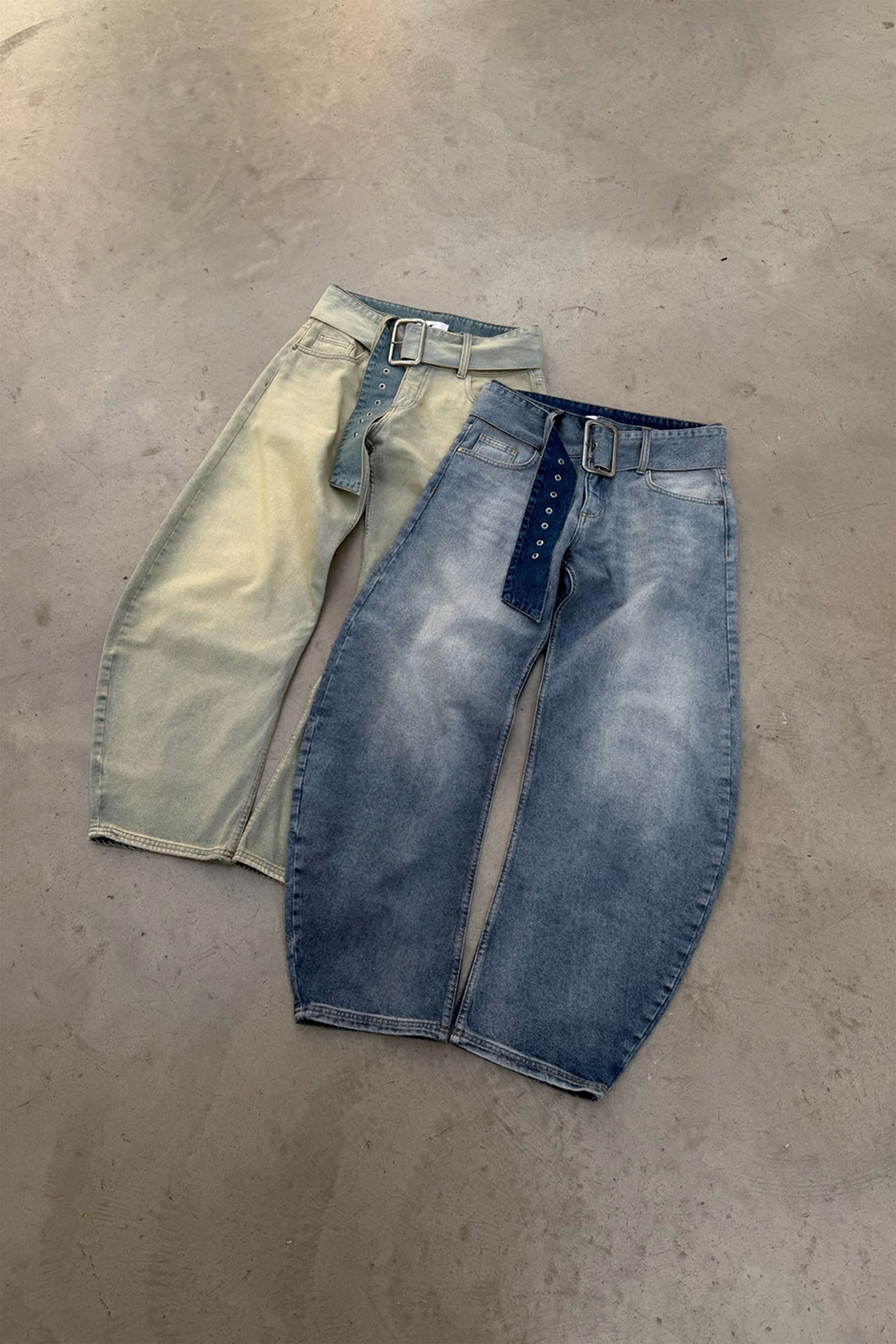 Washed Light Blue Balloon Jeans with a voluminous curved leg and high-rise fit. Designed with a matching wide denim belt and square metal buckle. Features classic five-pocket construction, tonal stitching, a zip pocket on the back, and a tan leather SCU logo patch at the waistband.