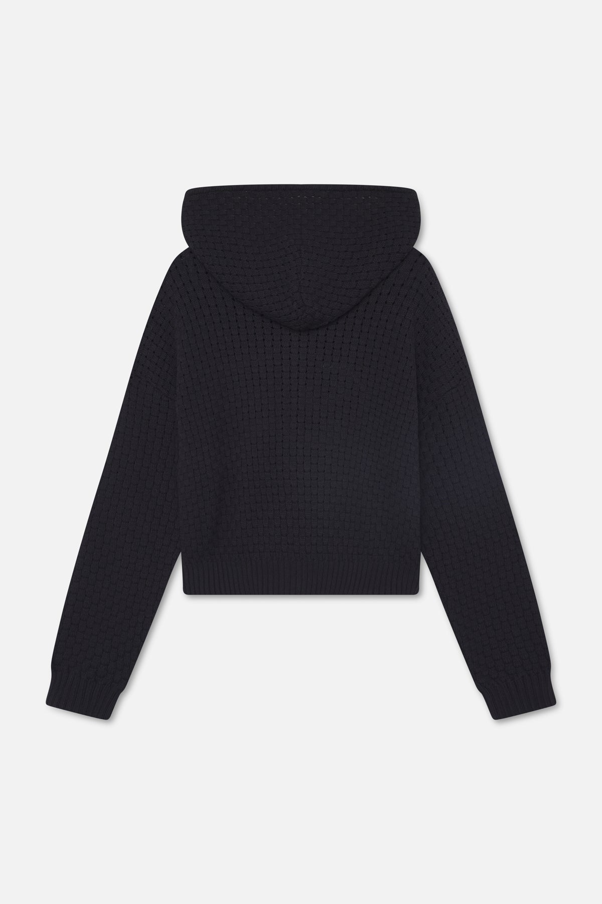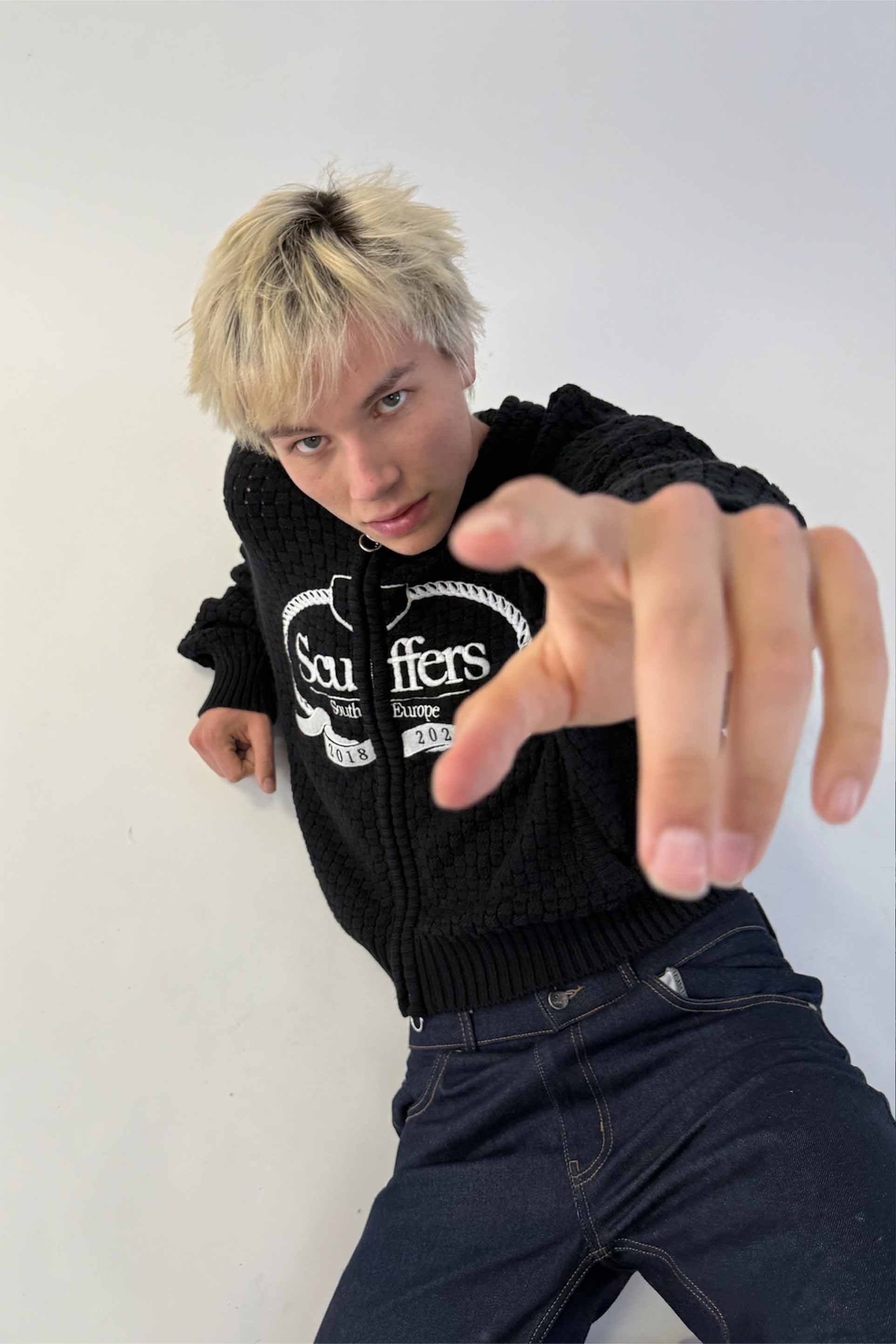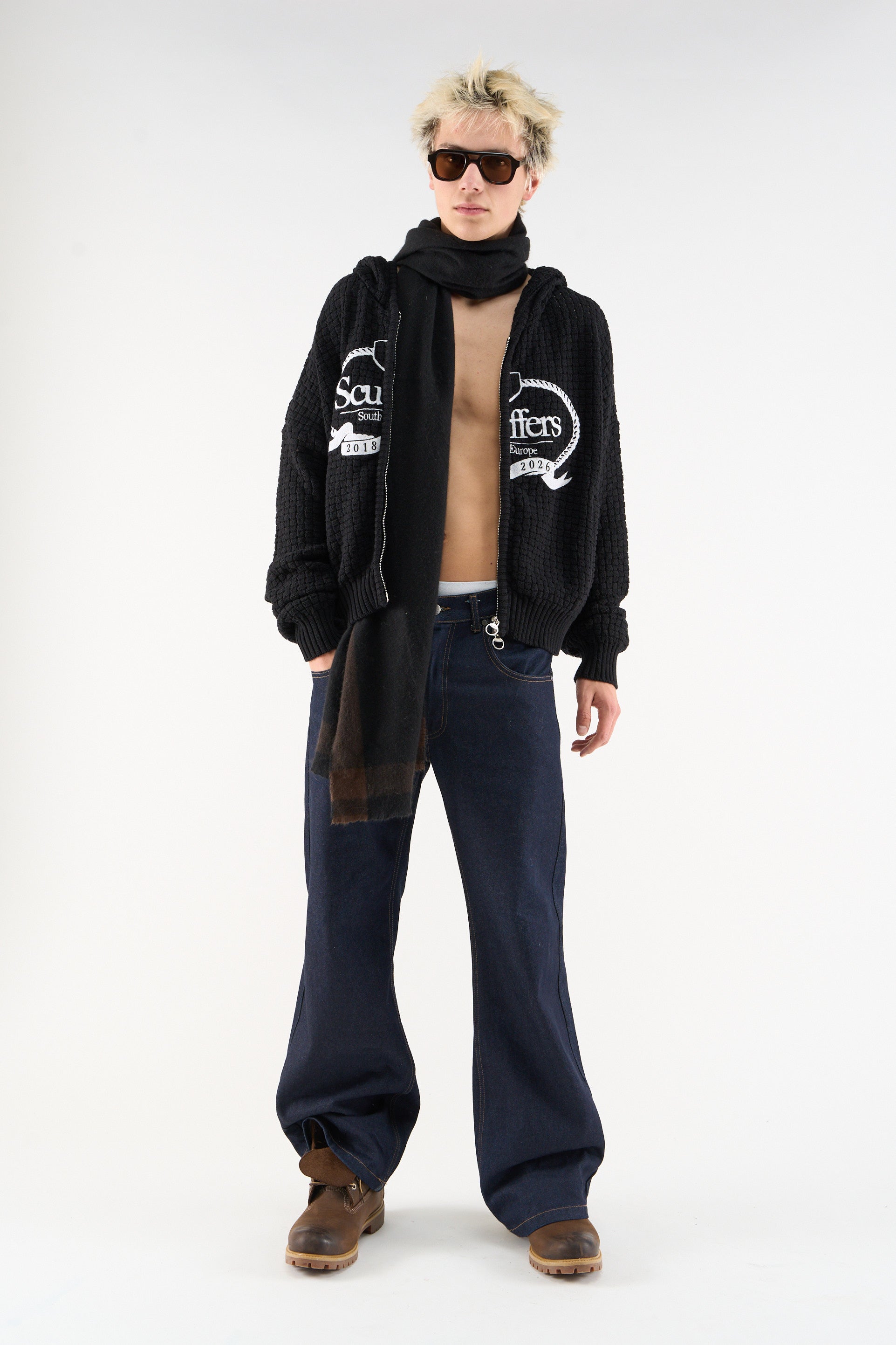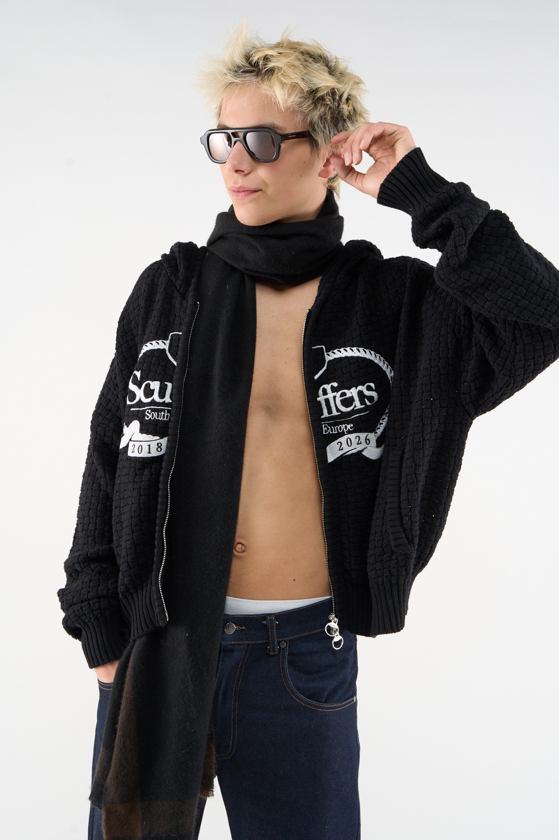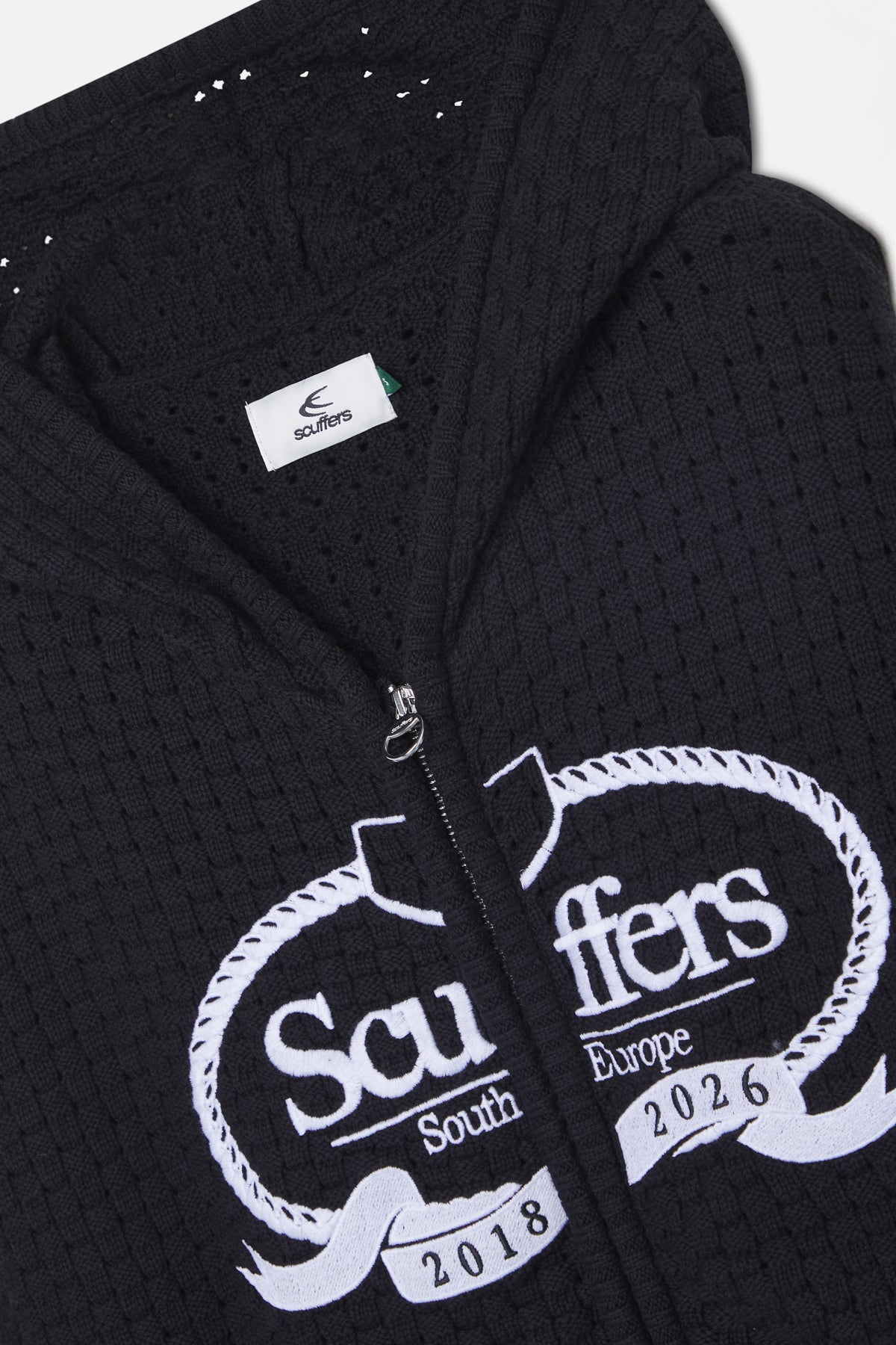 Dark zip-up hoodie made from textured waffle knit fabric. Features a large white embroidered Scuffers crest on the front with "South Europe," "2018," and "2026" detailing. Includes a front zip closure with ring pull, ribbed hem and cuffs, and a relaxed cropped fit.