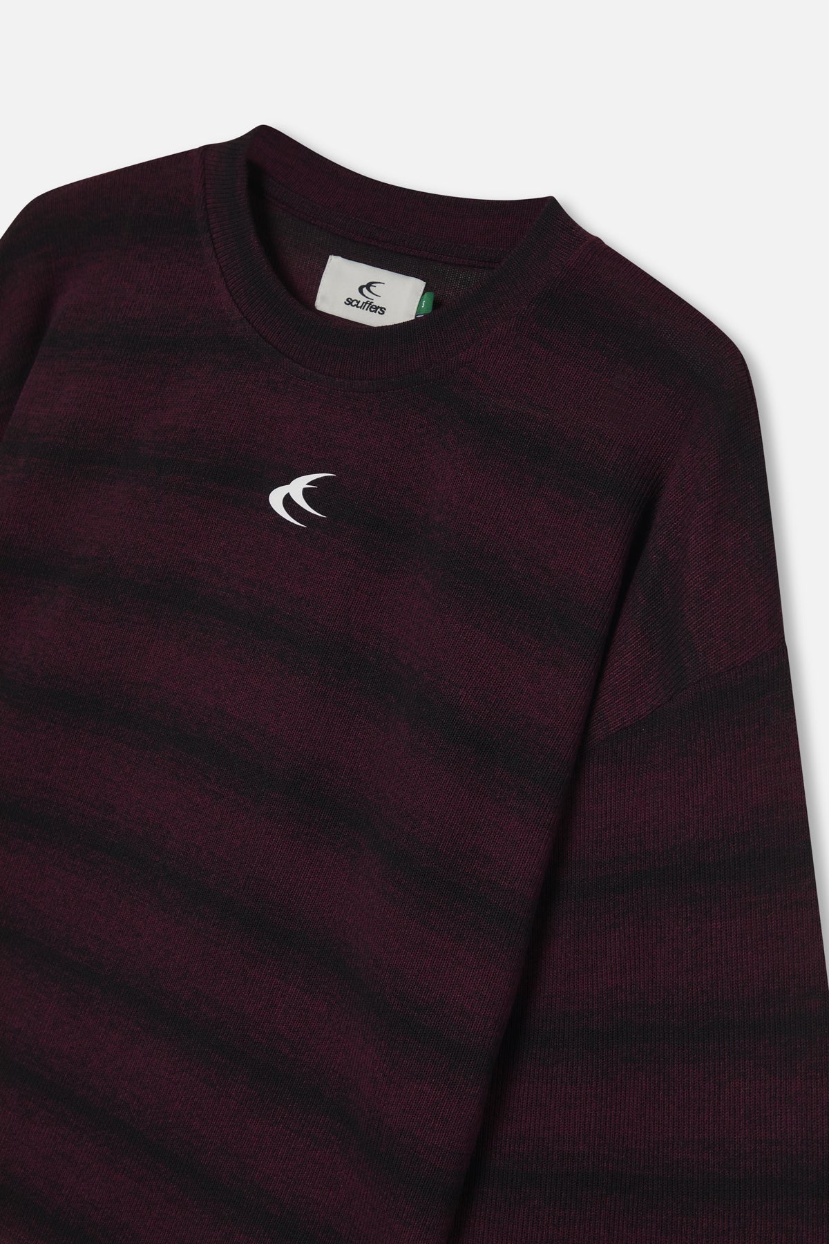 Burgundy Stripe Long Sleeve Top made from soft stretch jersey with a cropped, boxy fit. Features horizontal black gradient stripes, a ribbed crew neckline, and contrast Scuffers logo print at the chest. Straight hem and set-in sleeves.