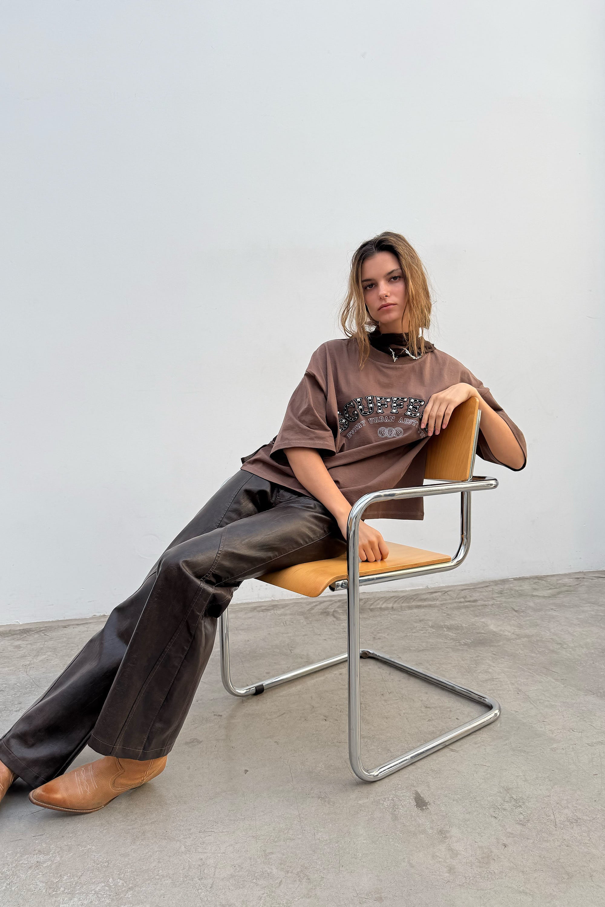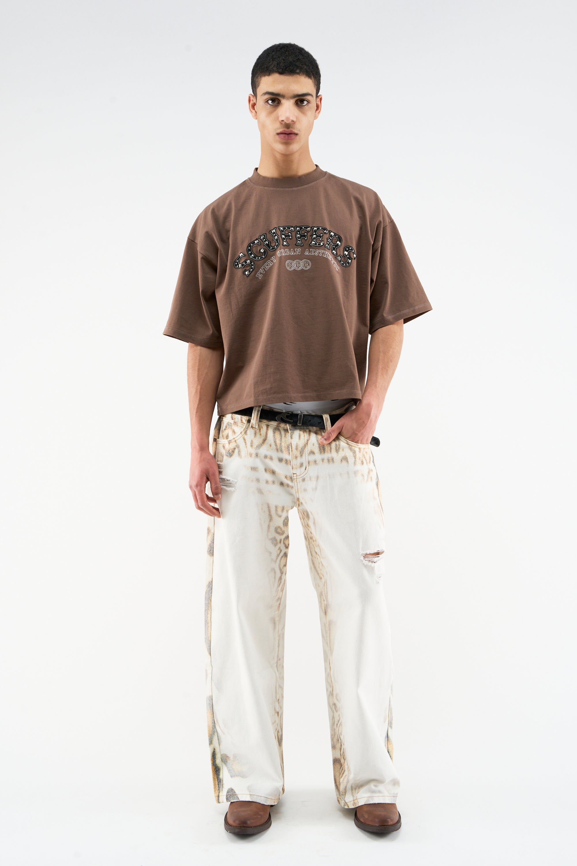 Brown oversized graphic T-shirt with ribbed crew neck and dropped shoulders. Front features an arched Scuffers logo print with contrast detailing; clean back. Boxy, relaxed fit with wide short sleeves and a straight hem.