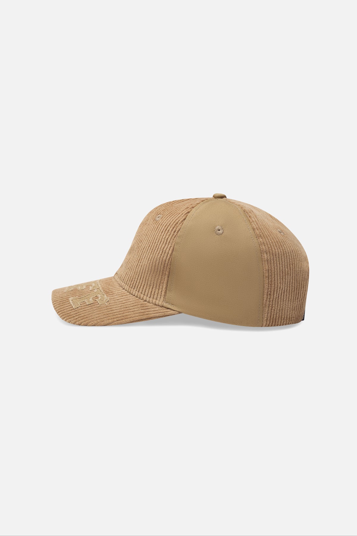 Beige Corduroy and Twill Cap – A mix of soft corduroy and plain twill fabric for a unique texture combination. Features an embroidered logo at the front, a curved brim, and an adjustable strap at the back with a metal clasp for a custom fit.
