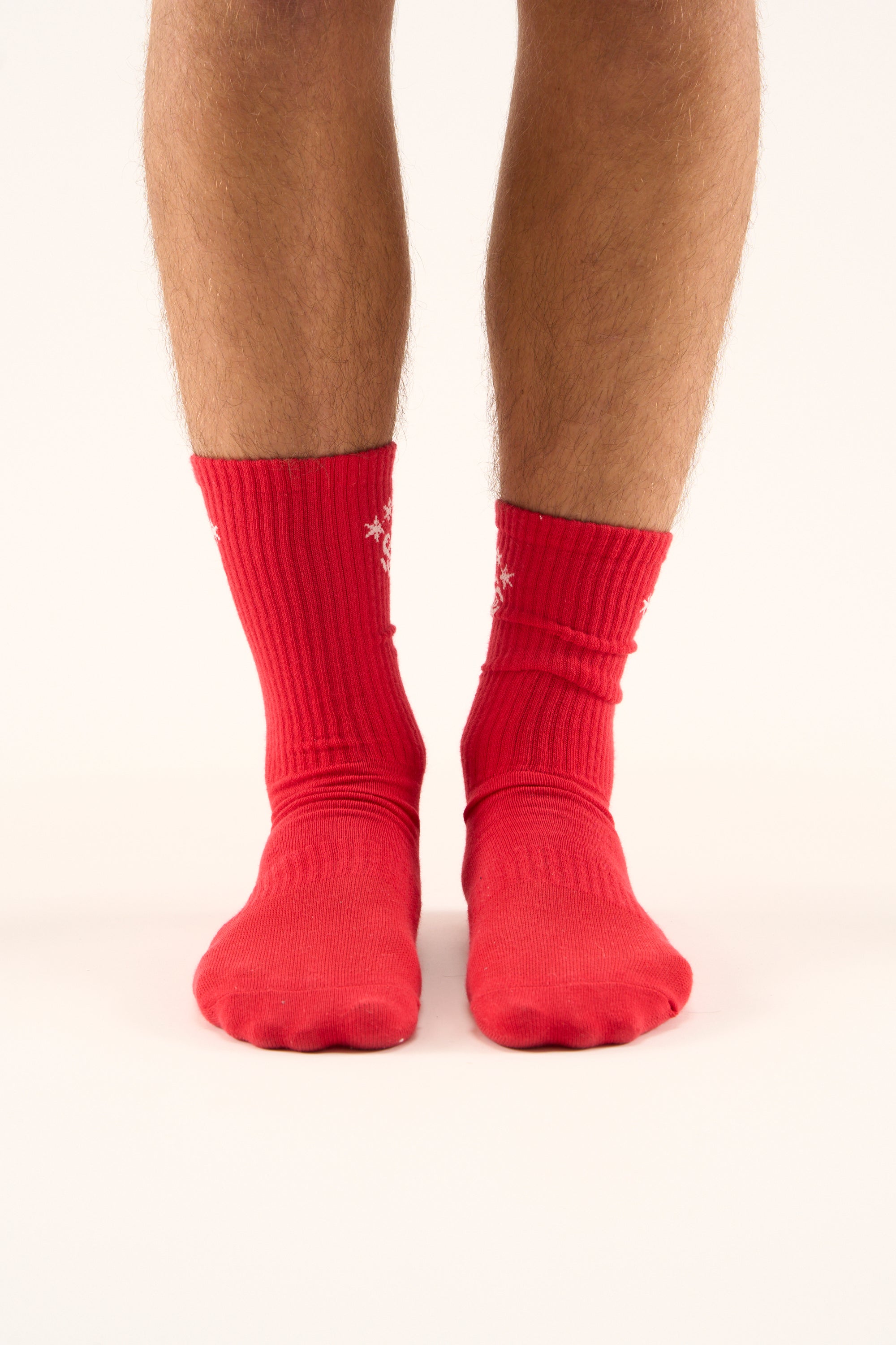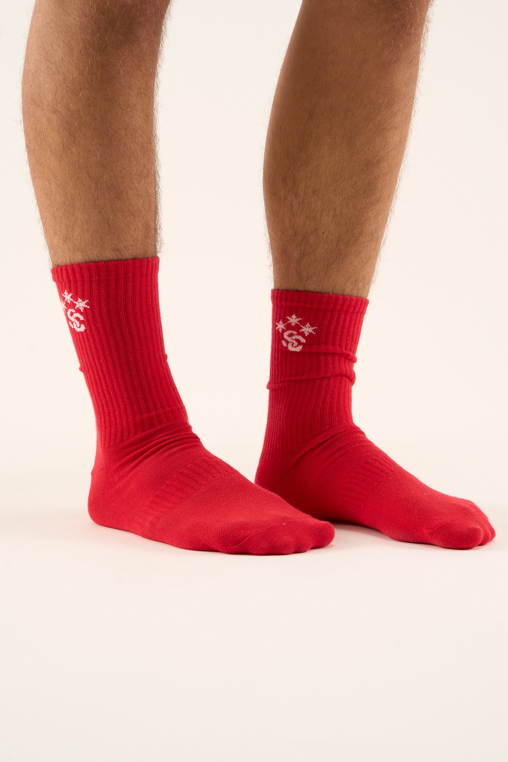 Red Crew Socks made from a soft cotton blend with ribbed cuffs for a secure fit. Features contrast white Scuffers logo and star motif on outer side. Midweight construction suitable for everyday wear.