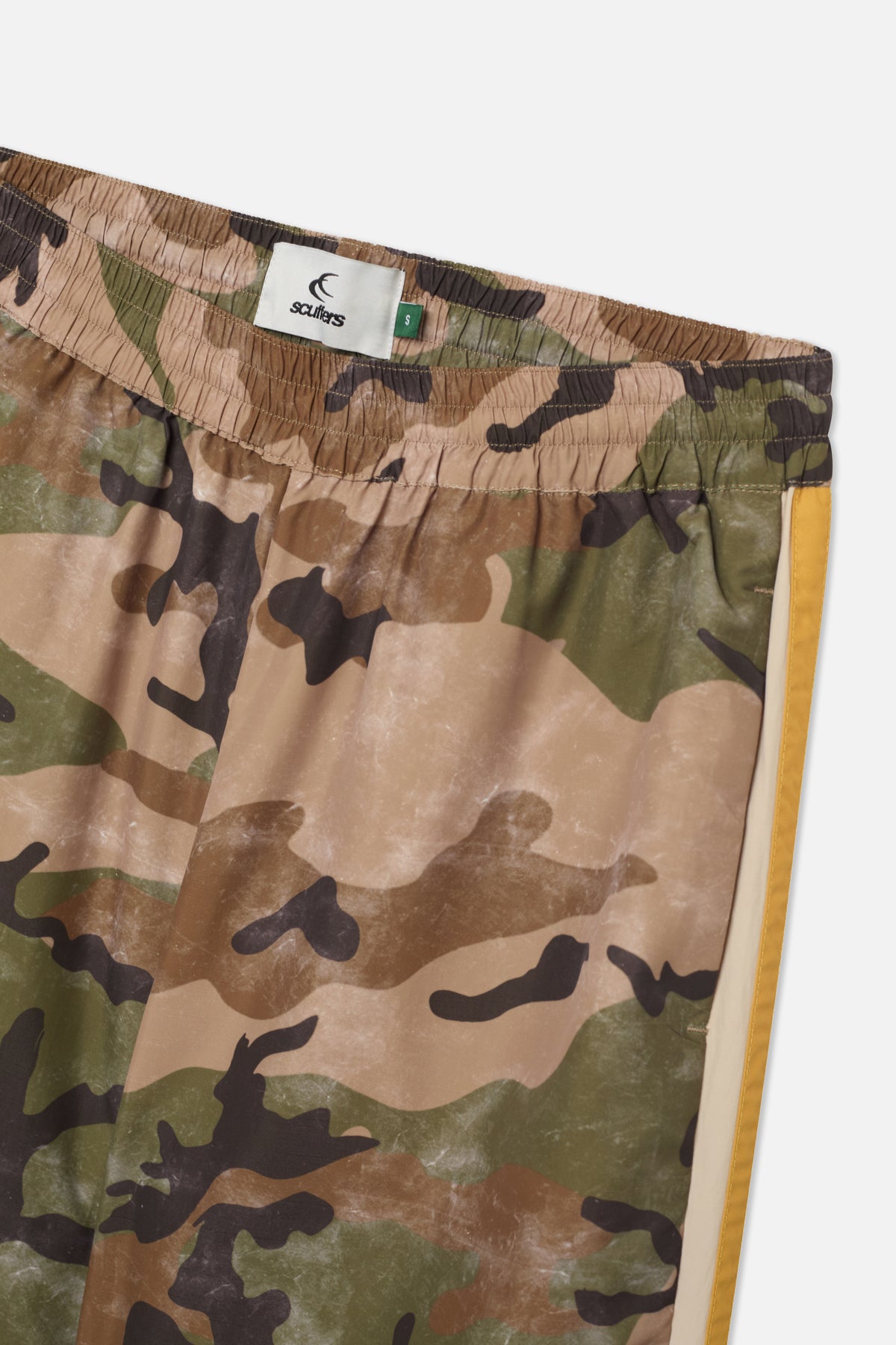 Wide-leg tech pants with a camo print and contrast side panels in beige, green and brown. Features an elasticated waistband for a flexible fit and zippered hems for adjustable styling. Scuffers logo detail on the front. Relaxed fit for casual comfort.