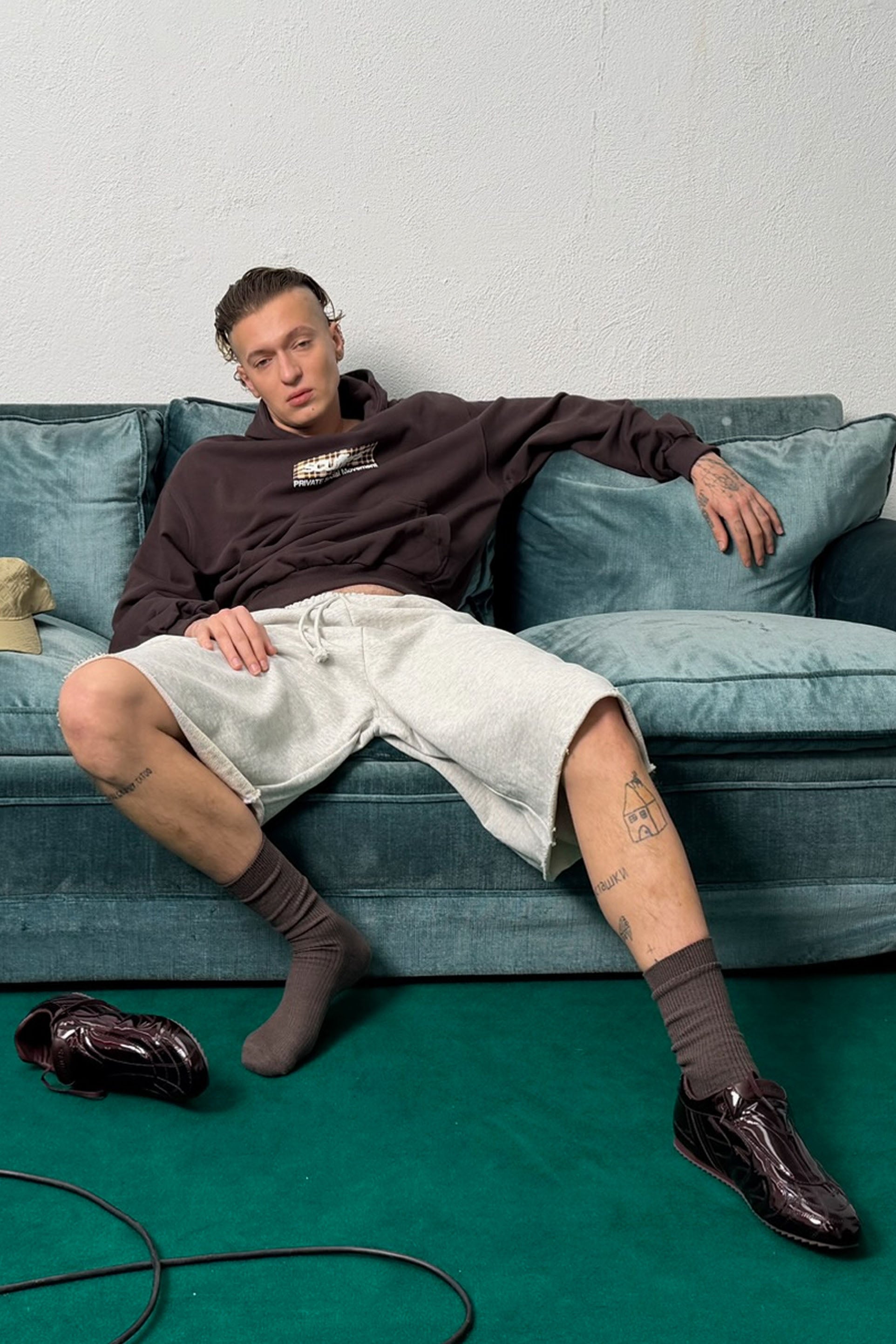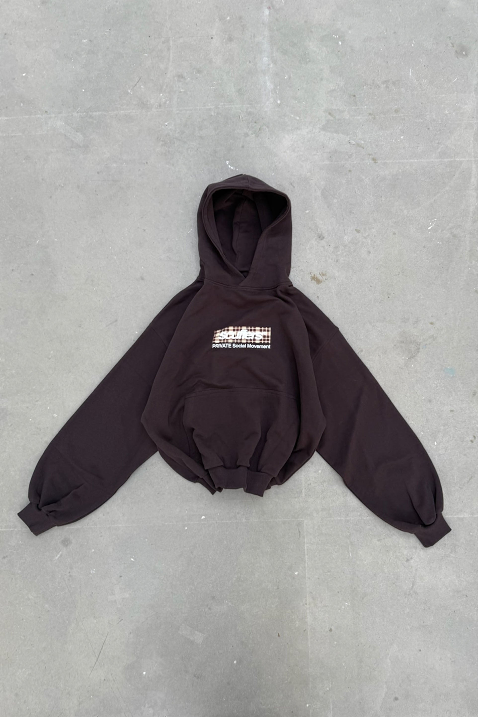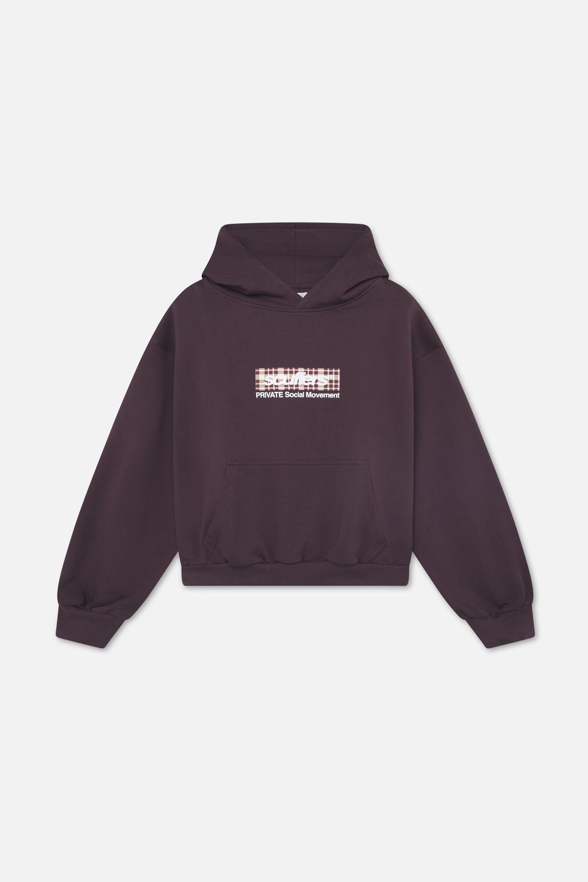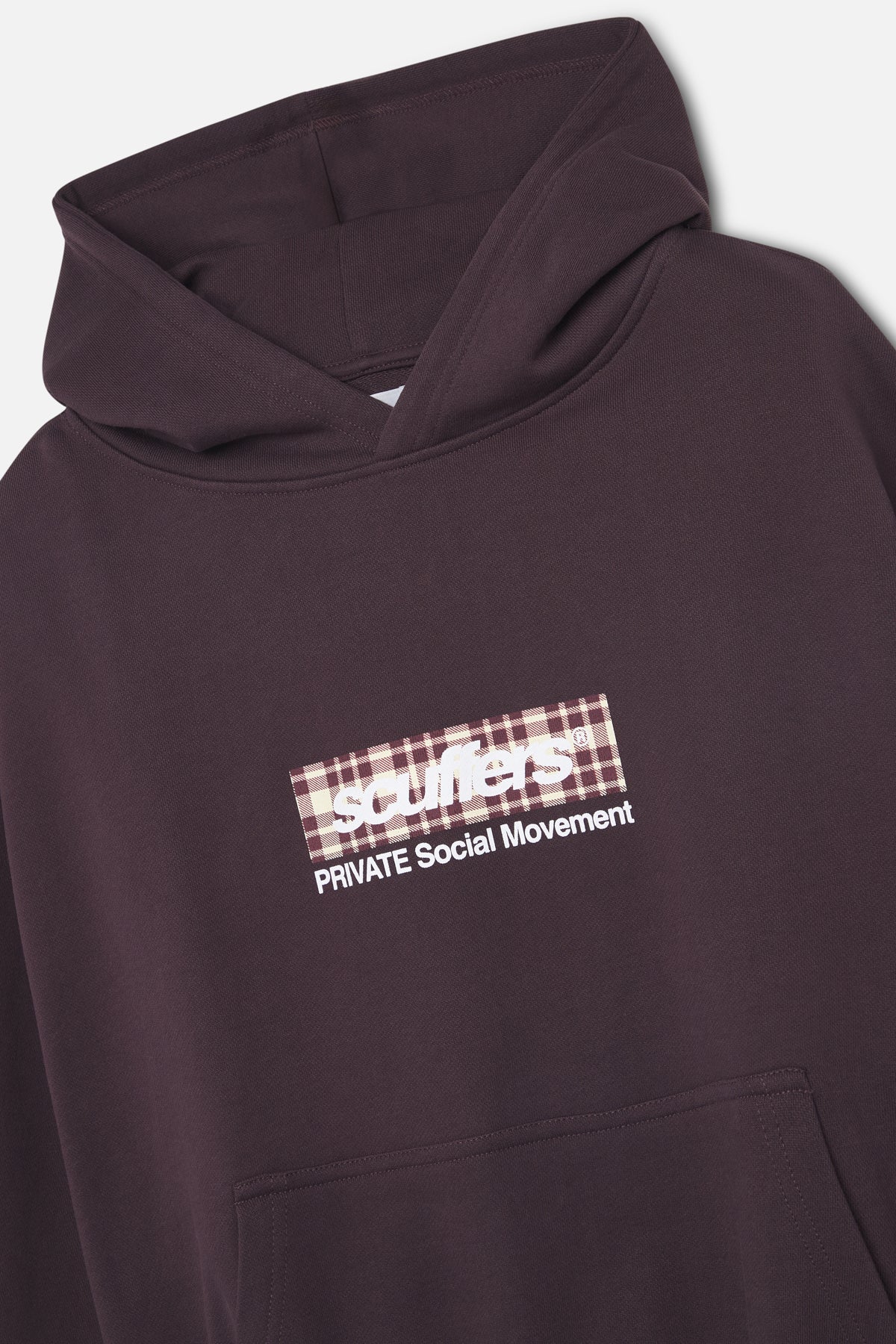 Brown Hoodie made from soft cotton-blend fleece with a relaxed fit. Features a front kangaroo pocket, ribbed hem and cuffs, and a double-layer hood. Camouflage-print chest graphic with Scuffers® logo and “PRIVATE Social Movement” text.