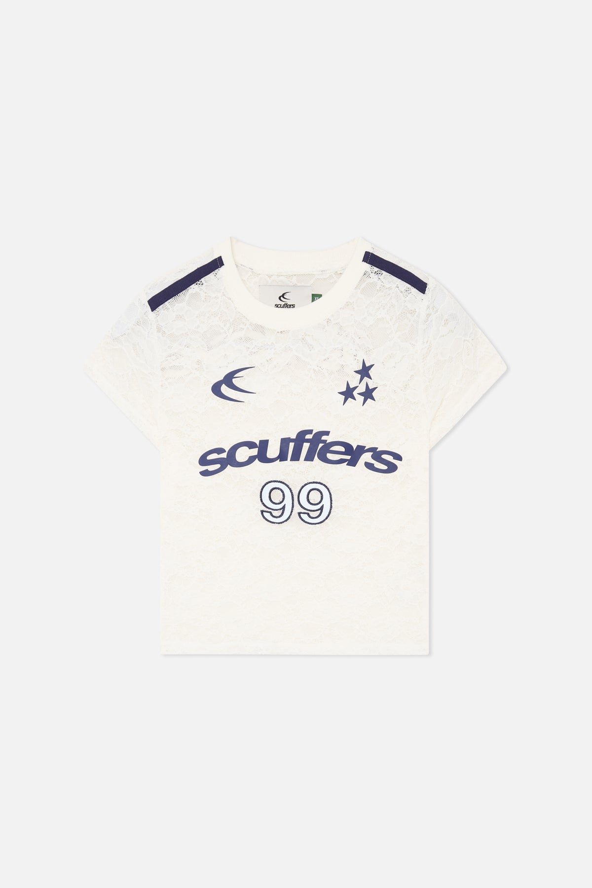 Lace Football Tee in White made from sheer floral lace with ribbed crew neckline. Features bold contrast Scuffers logo and “99” patch on front, “withlove” print on back, and star graphics. Regular fit with short sleeves and contrast shoulder tape detail.