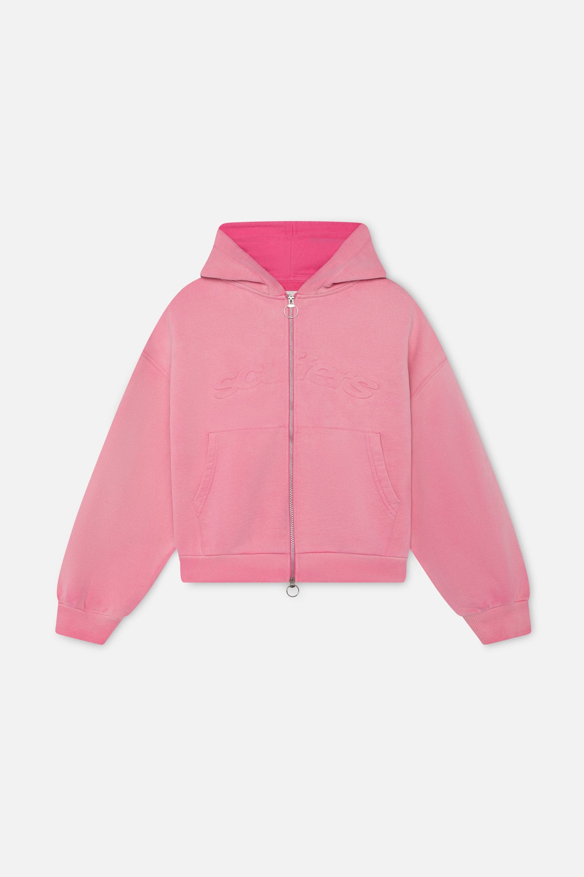 Pink Zip Hoodie made from heavyweight cotton fleece with a structured fit. Features tonal embossed Scuffers logo across the chest, two-way metal zipper with ring pullers, and a front kangaroo pocket. Designed with ribbed cuffs and hem, and a panelled hood with no drawstrings.