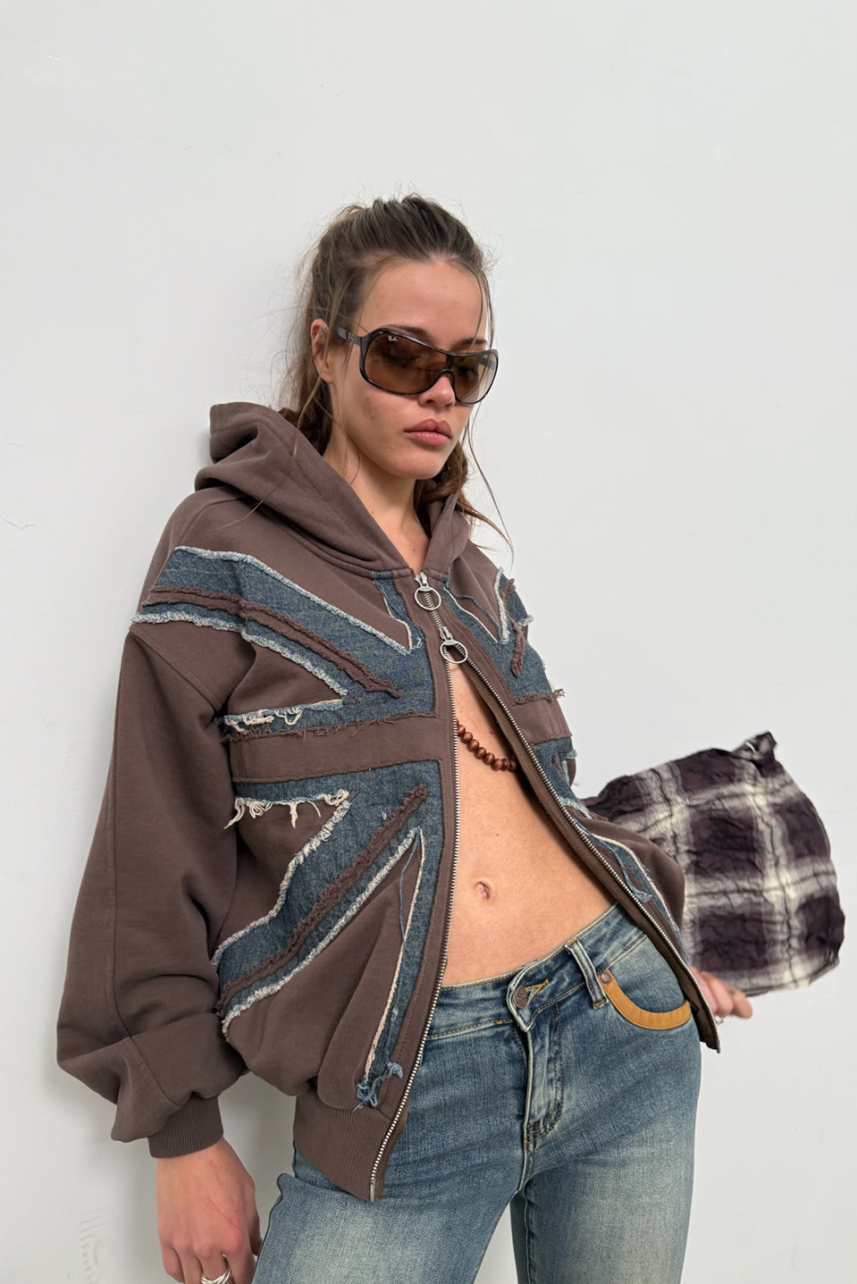 Brown Hoodie with Denim Union Jack made from heavyweight cotton fleece. Features a relaxed fit, full zip closure with ring puller, and a frayed denim Union Jack appliqué across the front. Ribbed hem and cuffs, side pockets, and woven Scuffers label on the chest.