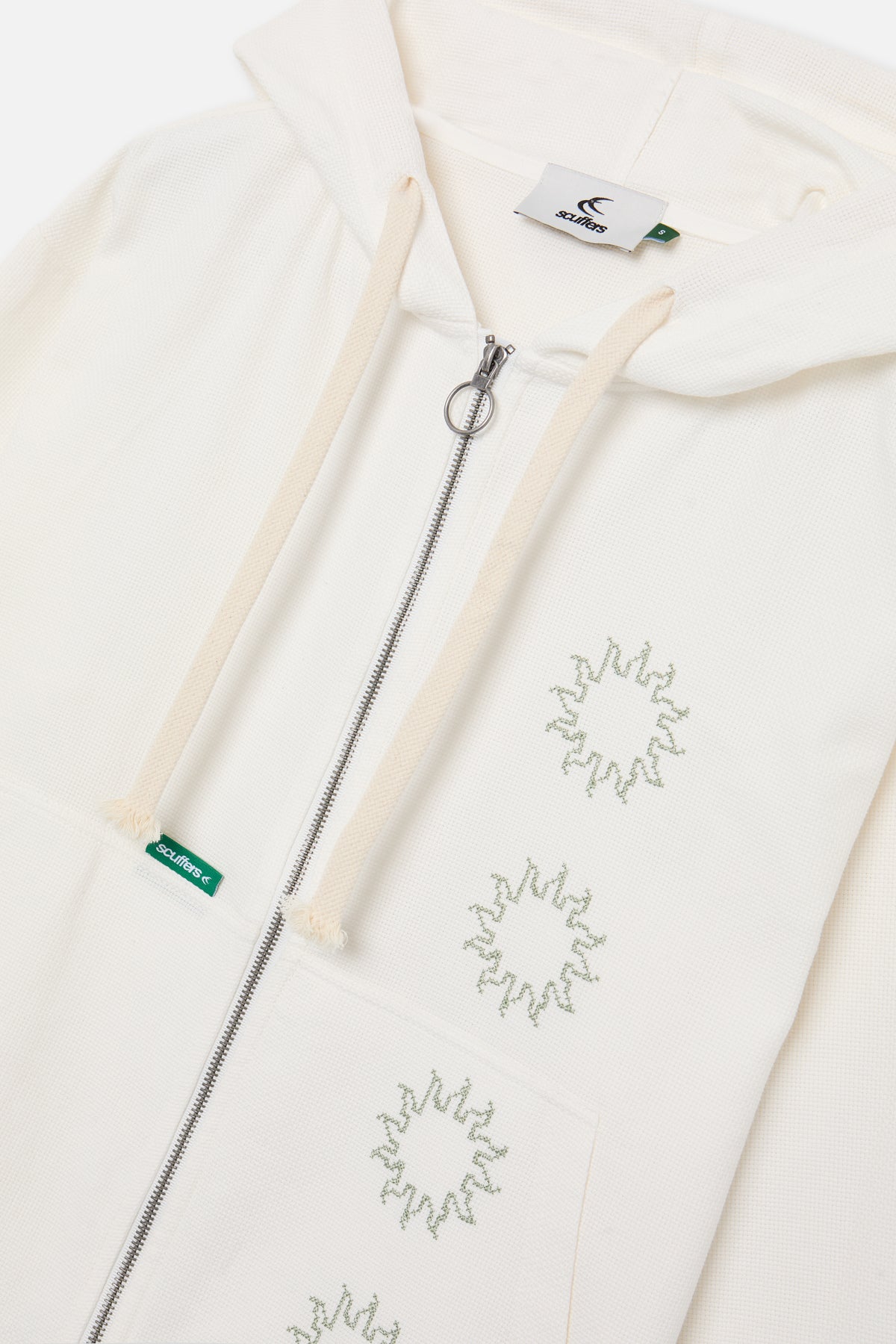 Ecru Zip Hoodie in textured waffle knit cotton with a relaxed fit. Features an O-ring front zip, drawstring hood, and kangaroo pocket. Detailed with three cross-stitch sun graphics on the front and a woven Scuffers label.