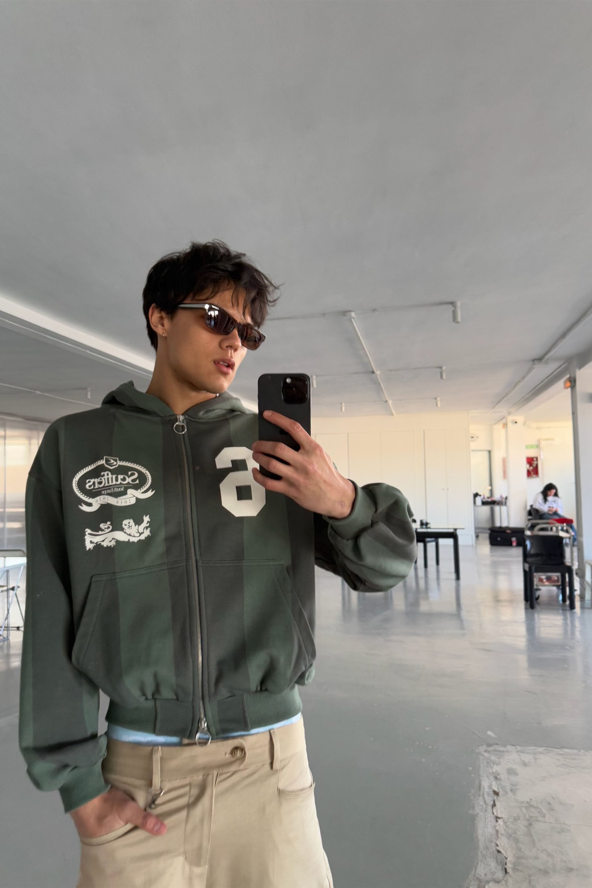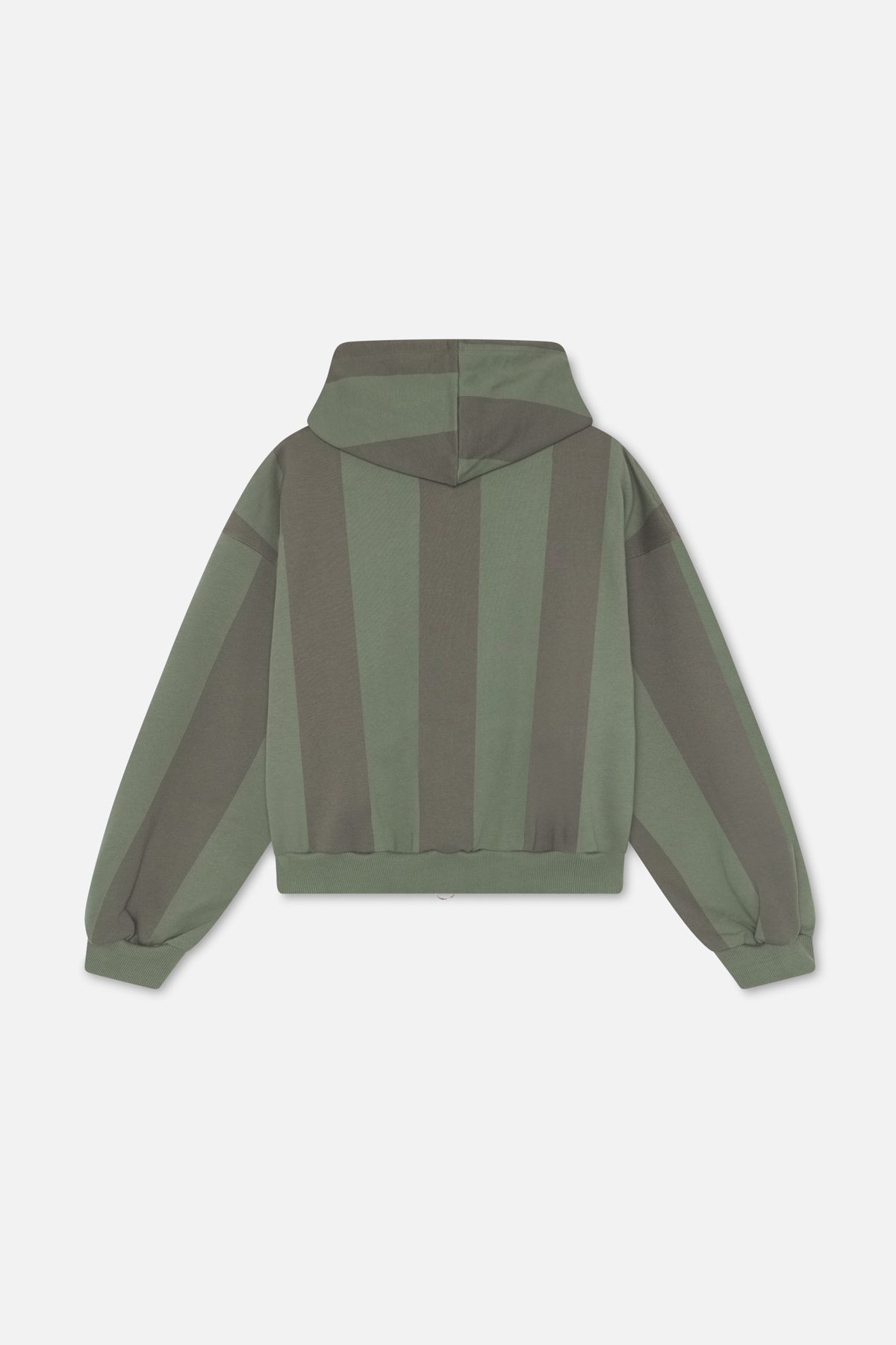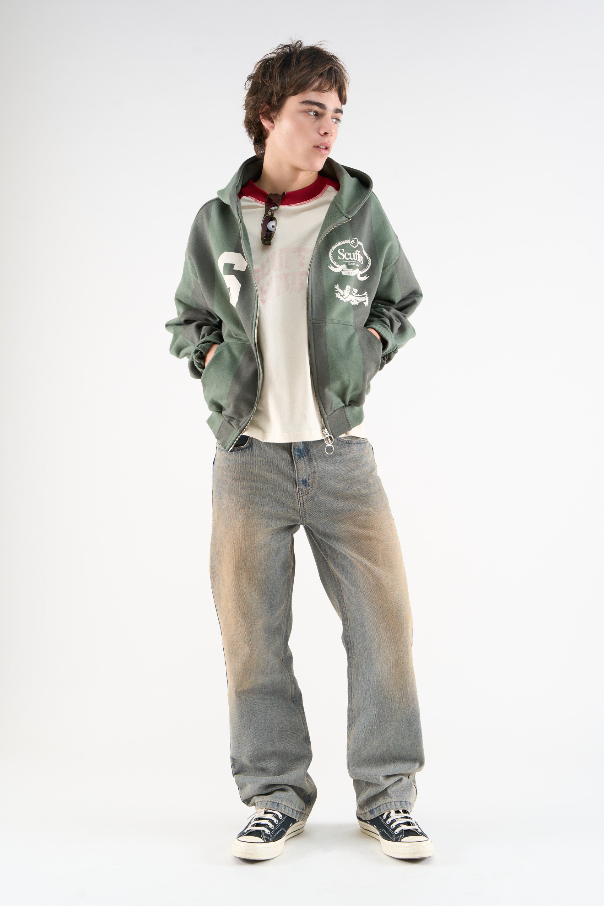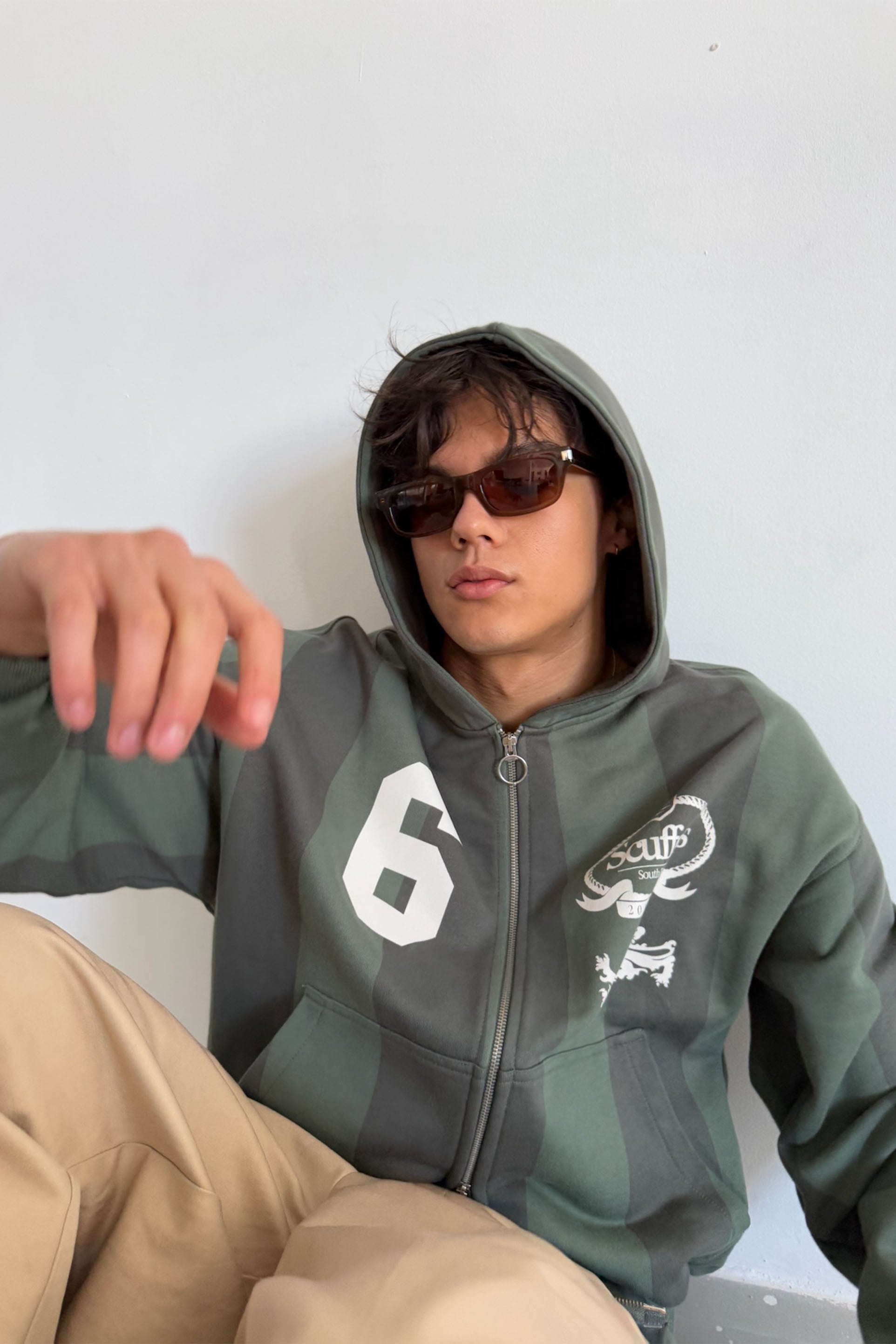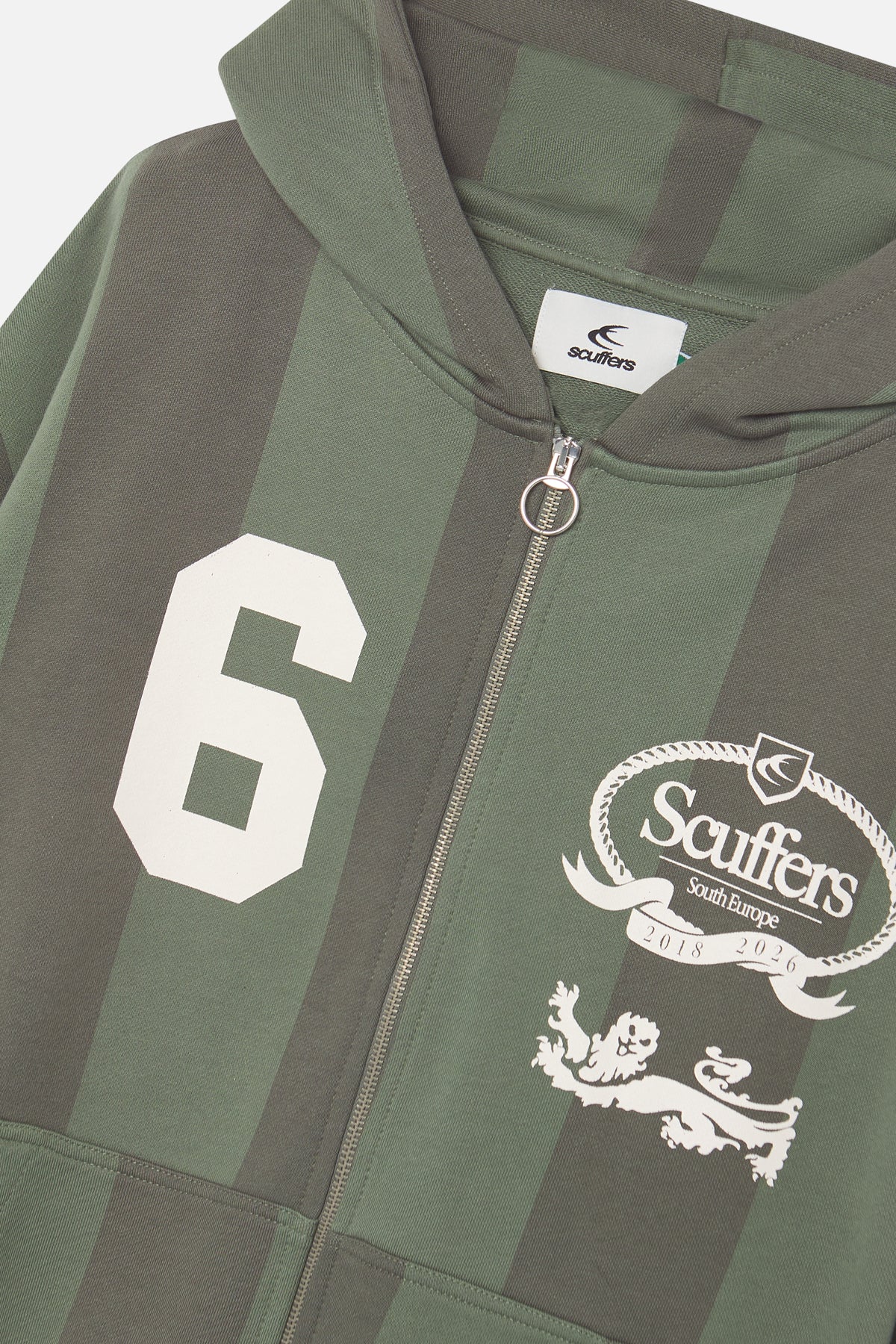 Striped Zip Hoodie – Mid-weight cotton fleece with green and dark olive vertical stripes. Features two-way zip closure with ring pull, split kangaroo pockets, and ribbed trims. Printed crest graphic with "Scuffers South Europe" and "6" varsity number on front. Relaxed fit.