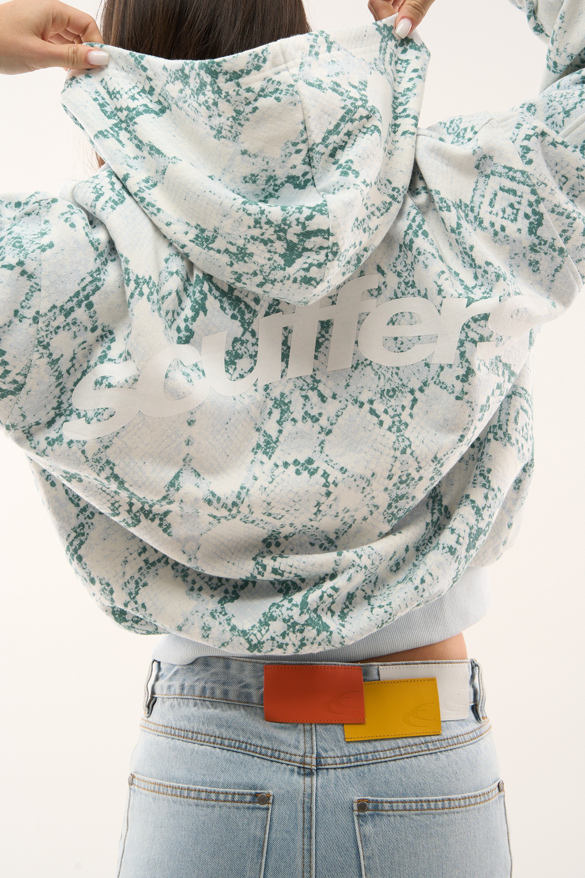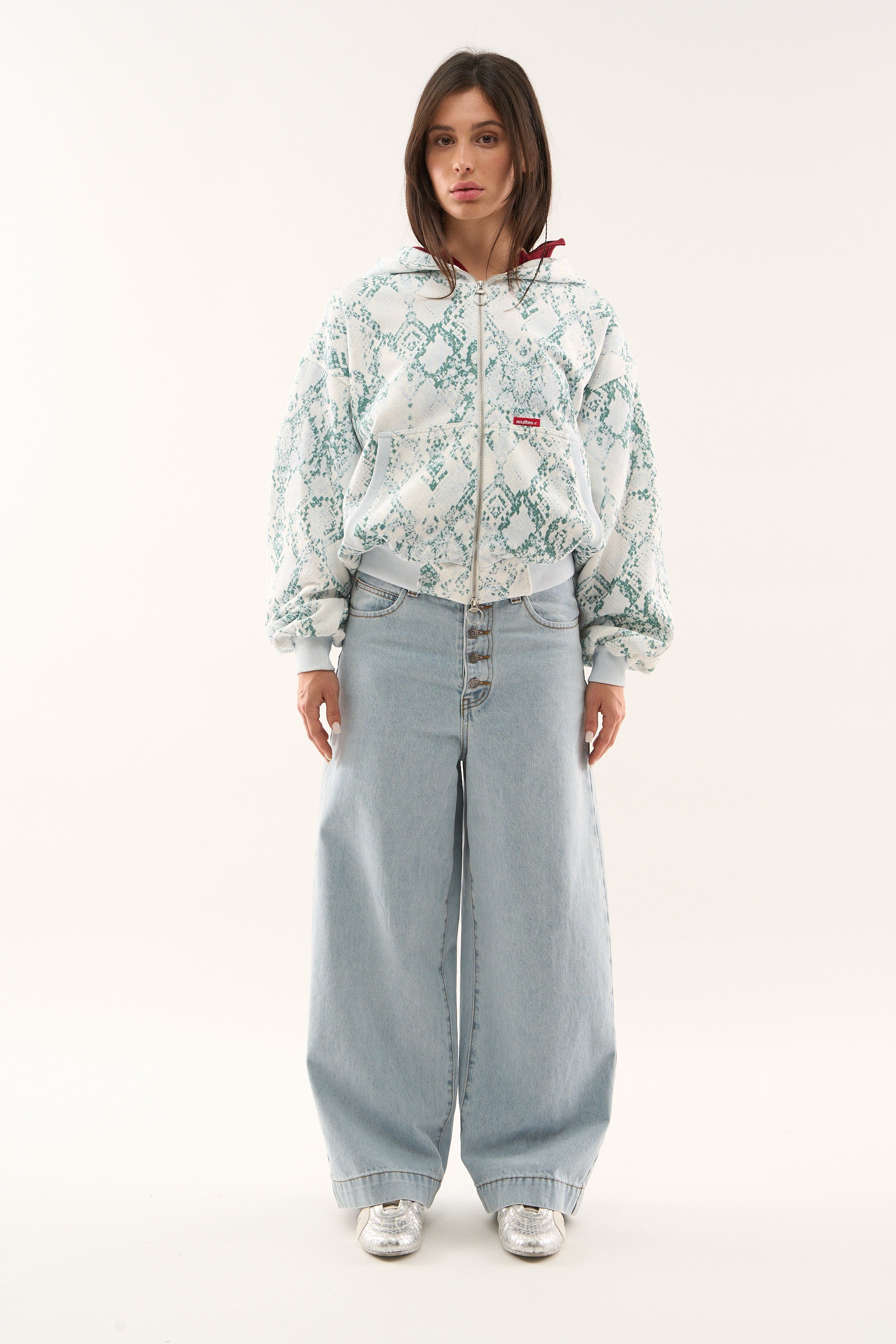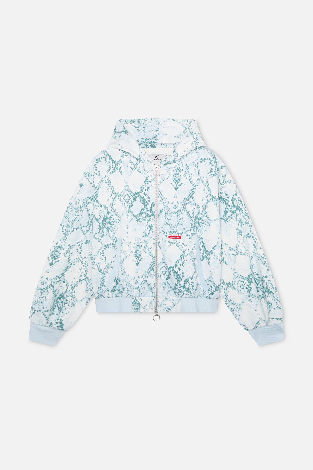 Blue snakeskin-print zip-up hoodie with an all-over textured pattern. Features a full-length silver zipper with a circular pull tab, ribbed cuffs and hem in pastel green, and a relaxed fit. Includes two front pockets and a drawstring hood for added comfort. The back showcases a bold white "Scuffers" logo, and a small red brand tag is present on the front pocket. Made from soft, cozy fabric suitable for casual wear.