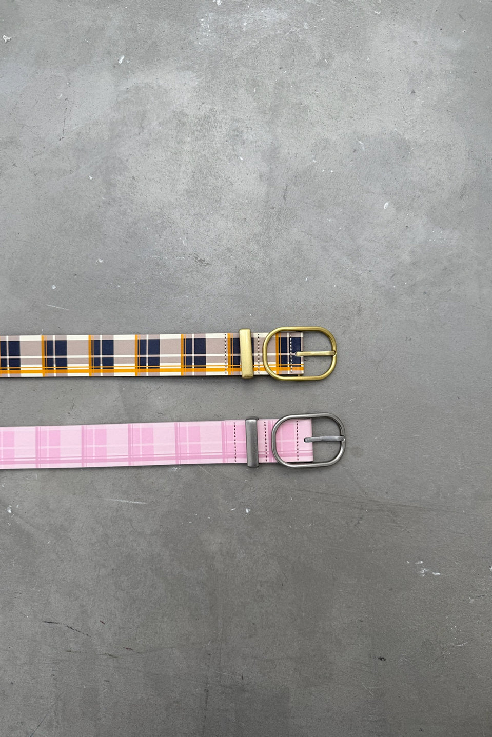 Pink Check Belt made from coated faux leather with an all-over pastel pink plaid print. Features a rounded silver-tone metal buckle, pointed tip with metal cap, and embossed Scuffers logo on the inner side. Adjustable length with multiple punched holes.