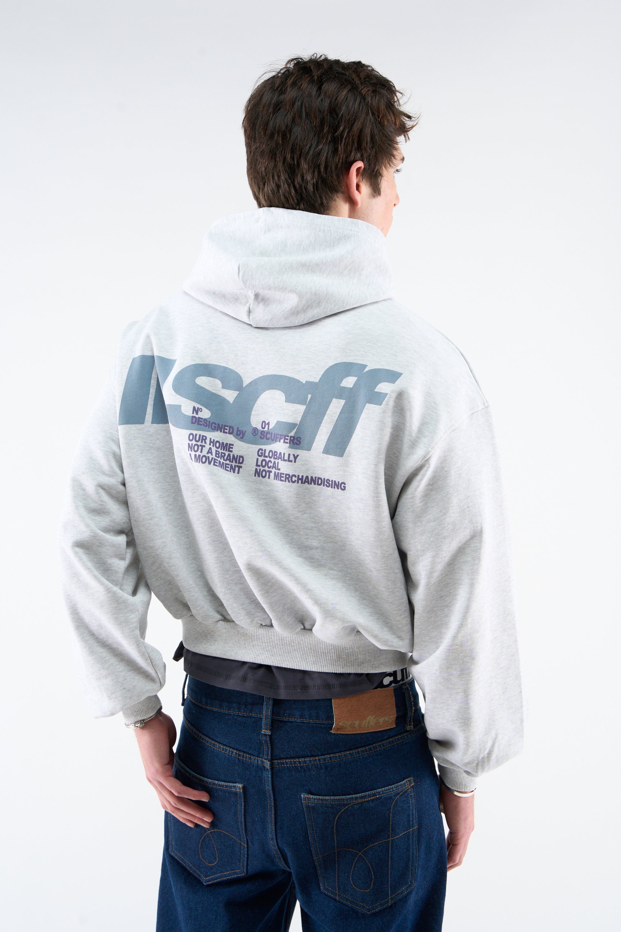 Capacidades grises unisex de gran tamaño de peso ultral-pesado. Logotipo de 'Scoffers Double Moon' impreso en pantalla y 'Local Globaly Local no Merchandising' en la parte delantera y logotipo 'SCFF' en la parte posterior; Todos ellos en azul claro.