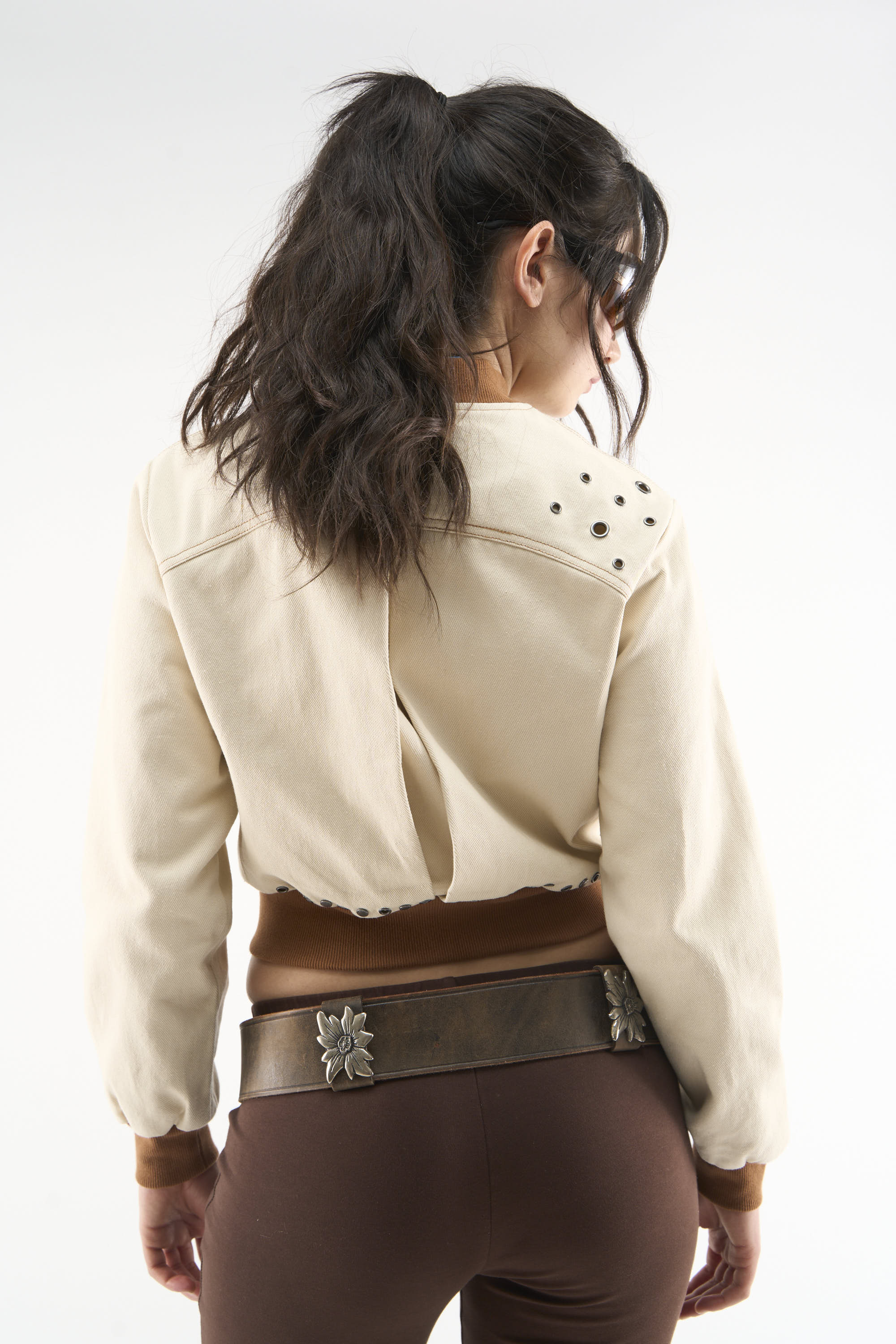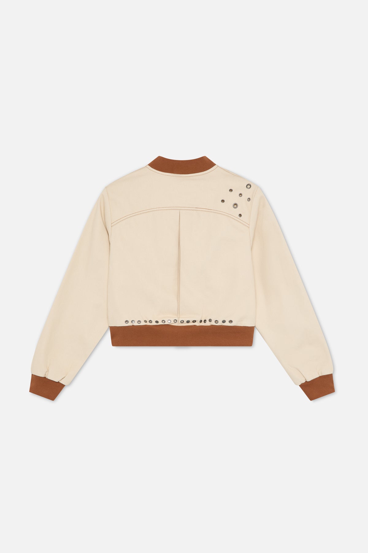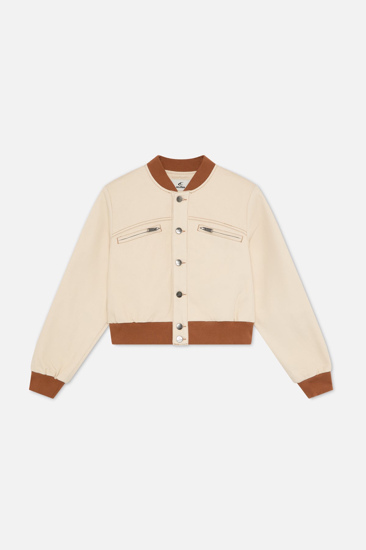 Cream cropped jacket with a structured silhouette and contrast ribbed collar, cuffs, and hem. Designed with a snap-button front and two angled zip chest pockets. Finished with contrast stitching and metal eyelet detailing on the back.
