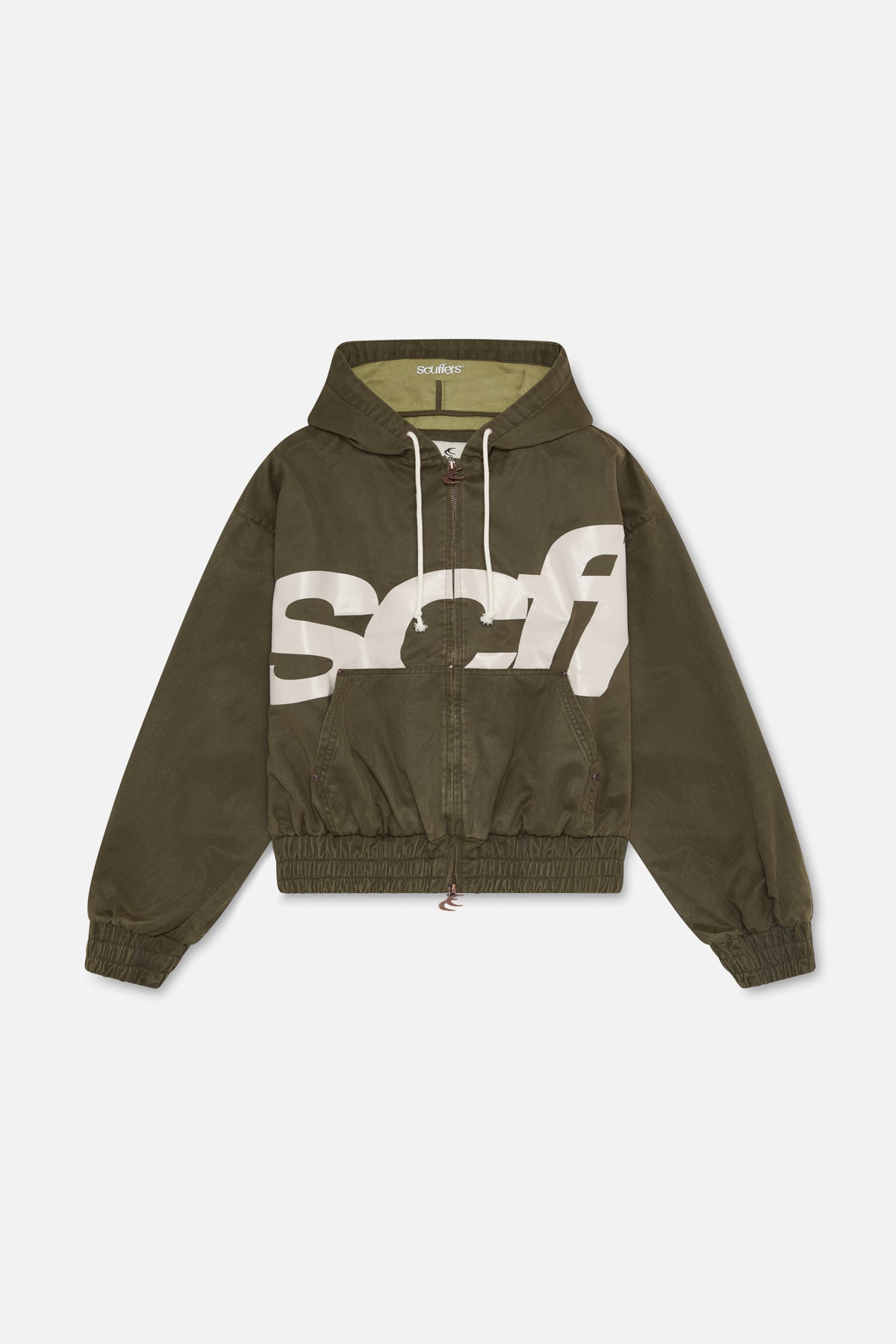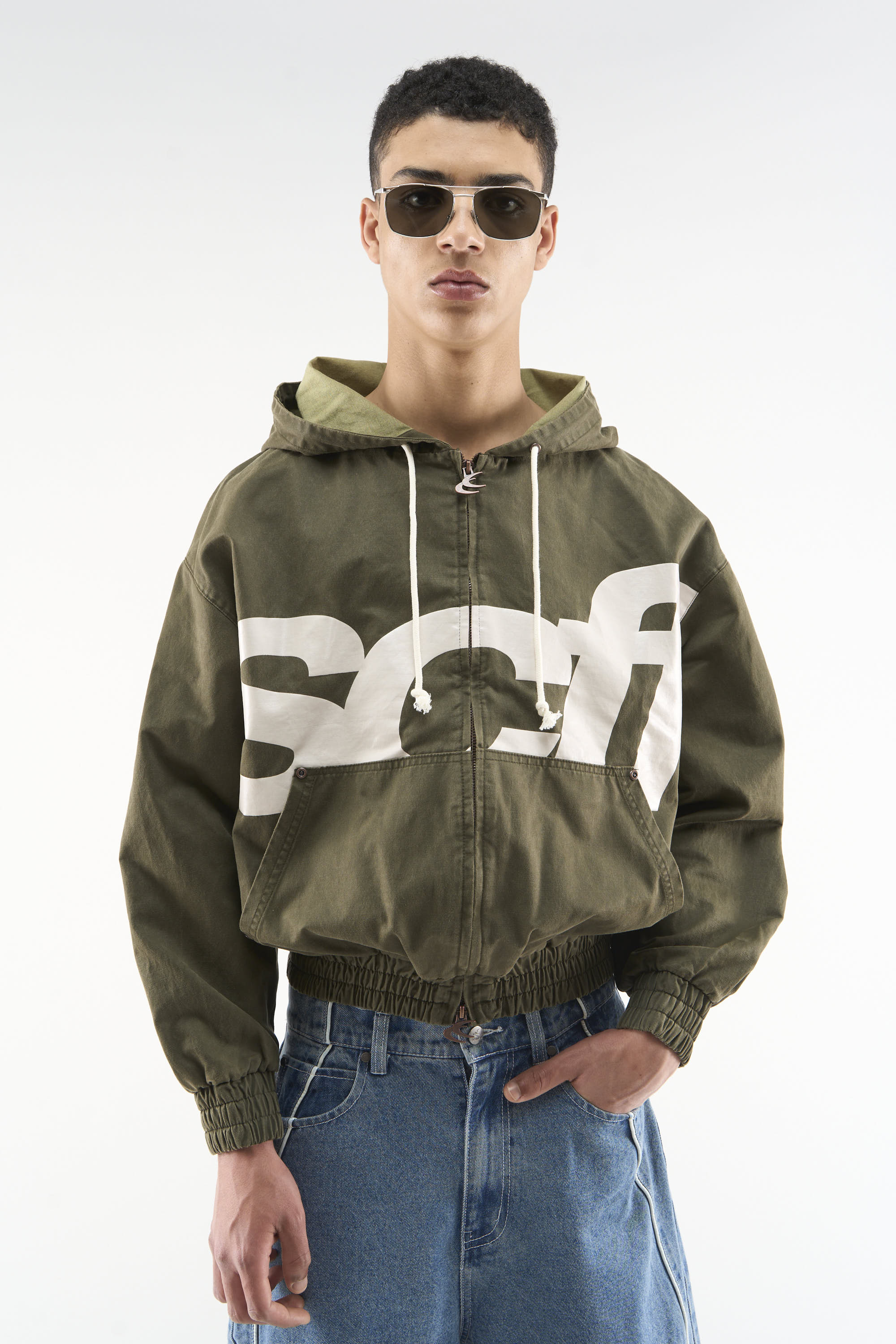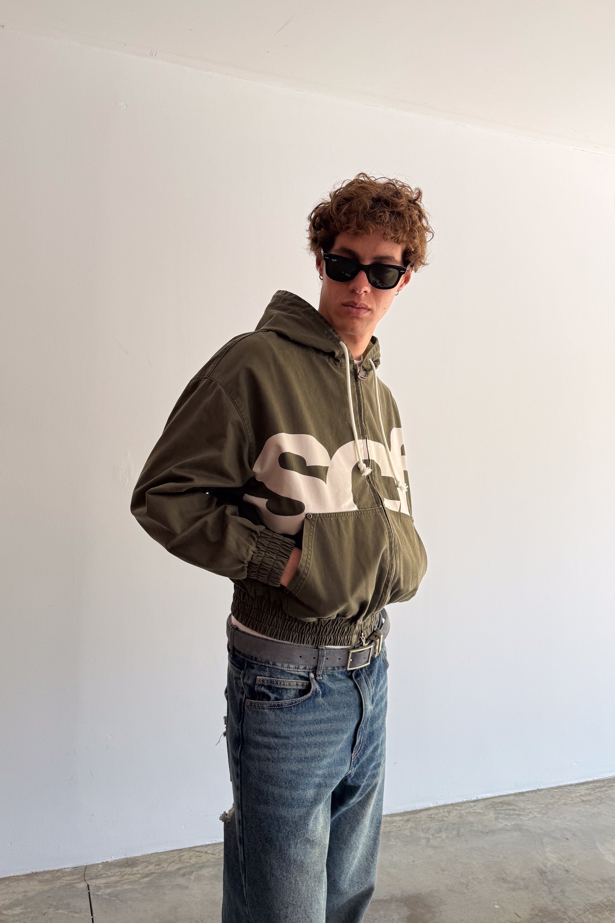 Olive hooded jacket with a relaxed cropped fit and full zip closure. Designed with dropped shoulders, elasticated hem and cuffs, and a front kangaroo pocket. Finished with contrast drawstrings and an oversized logo print across the chest.