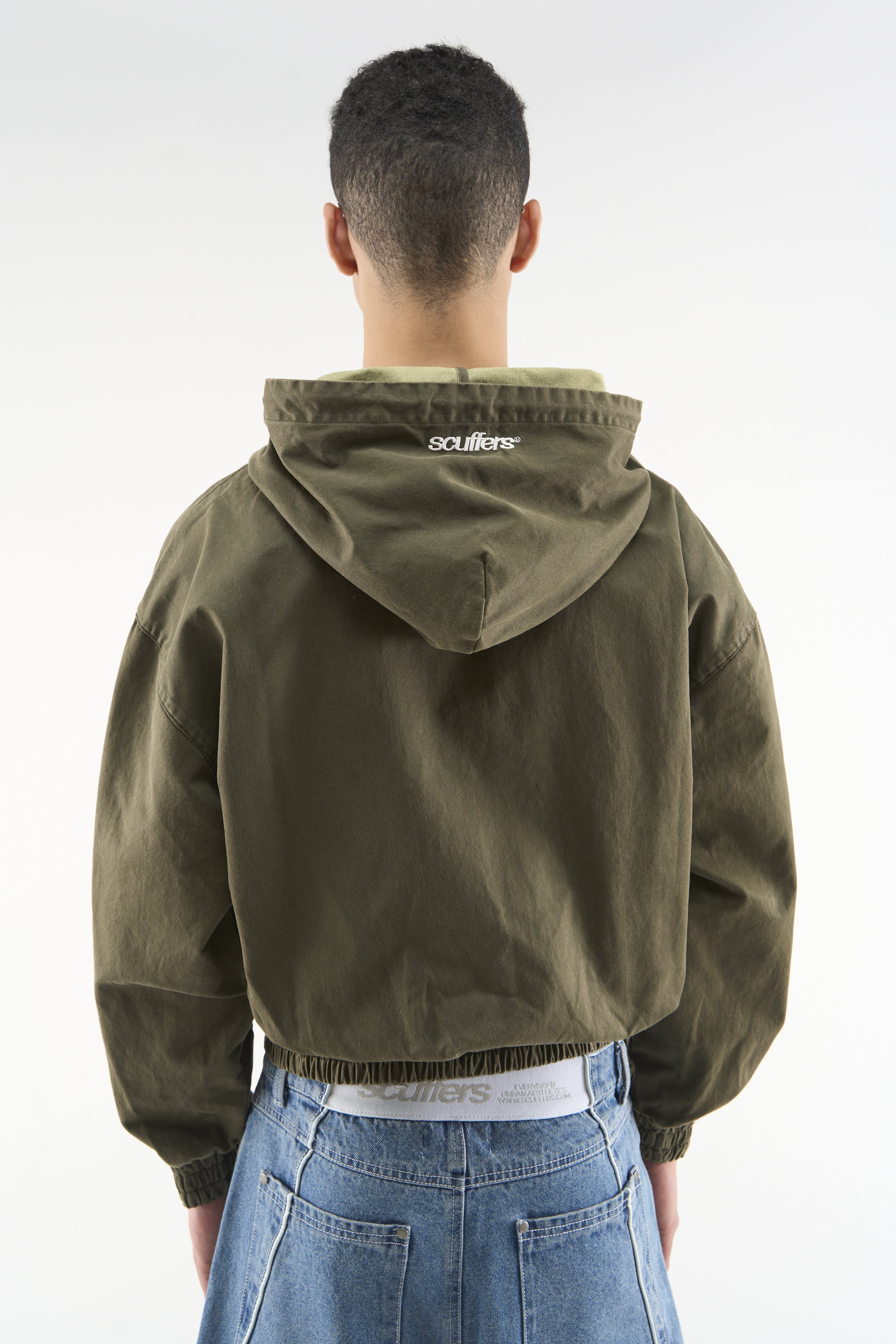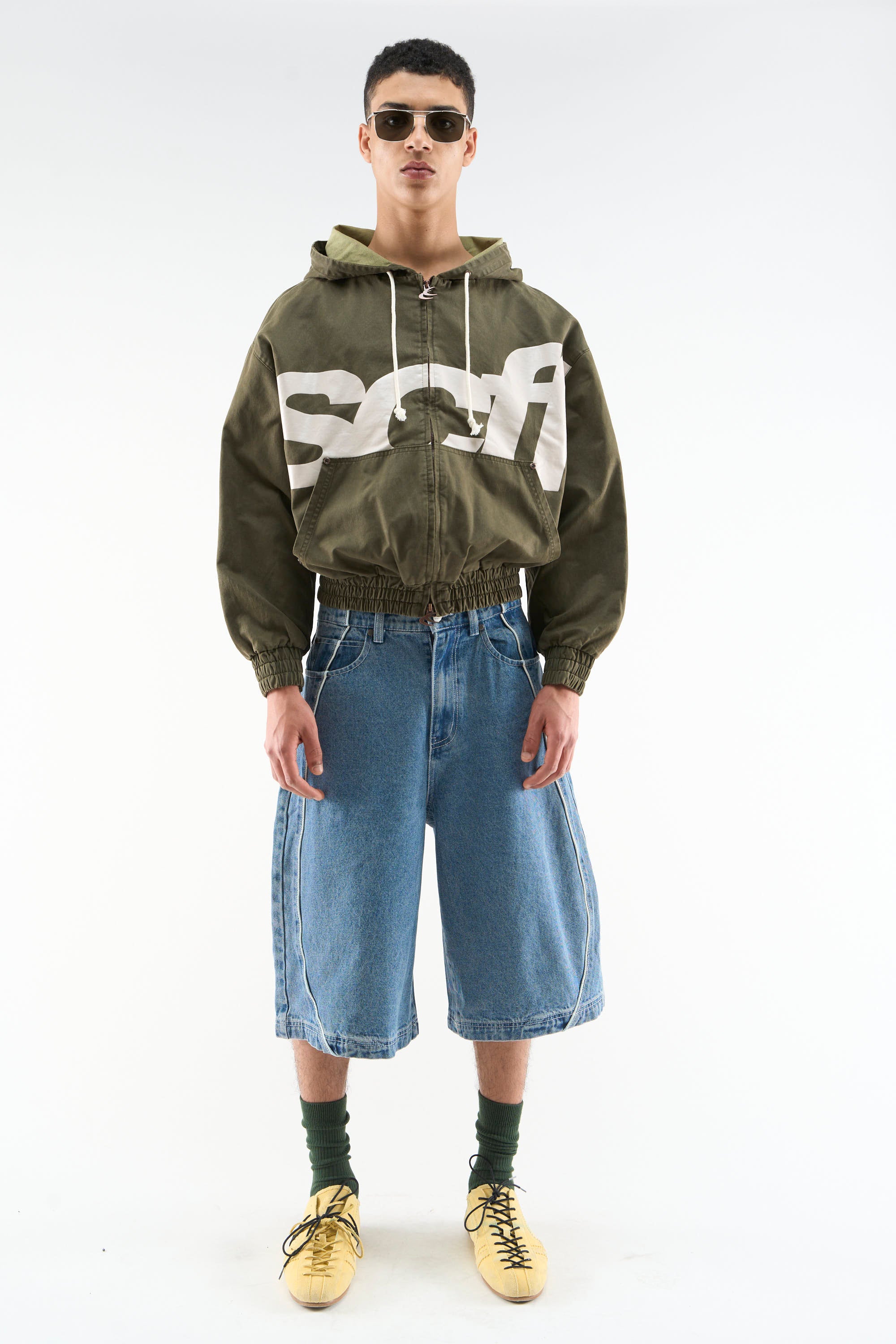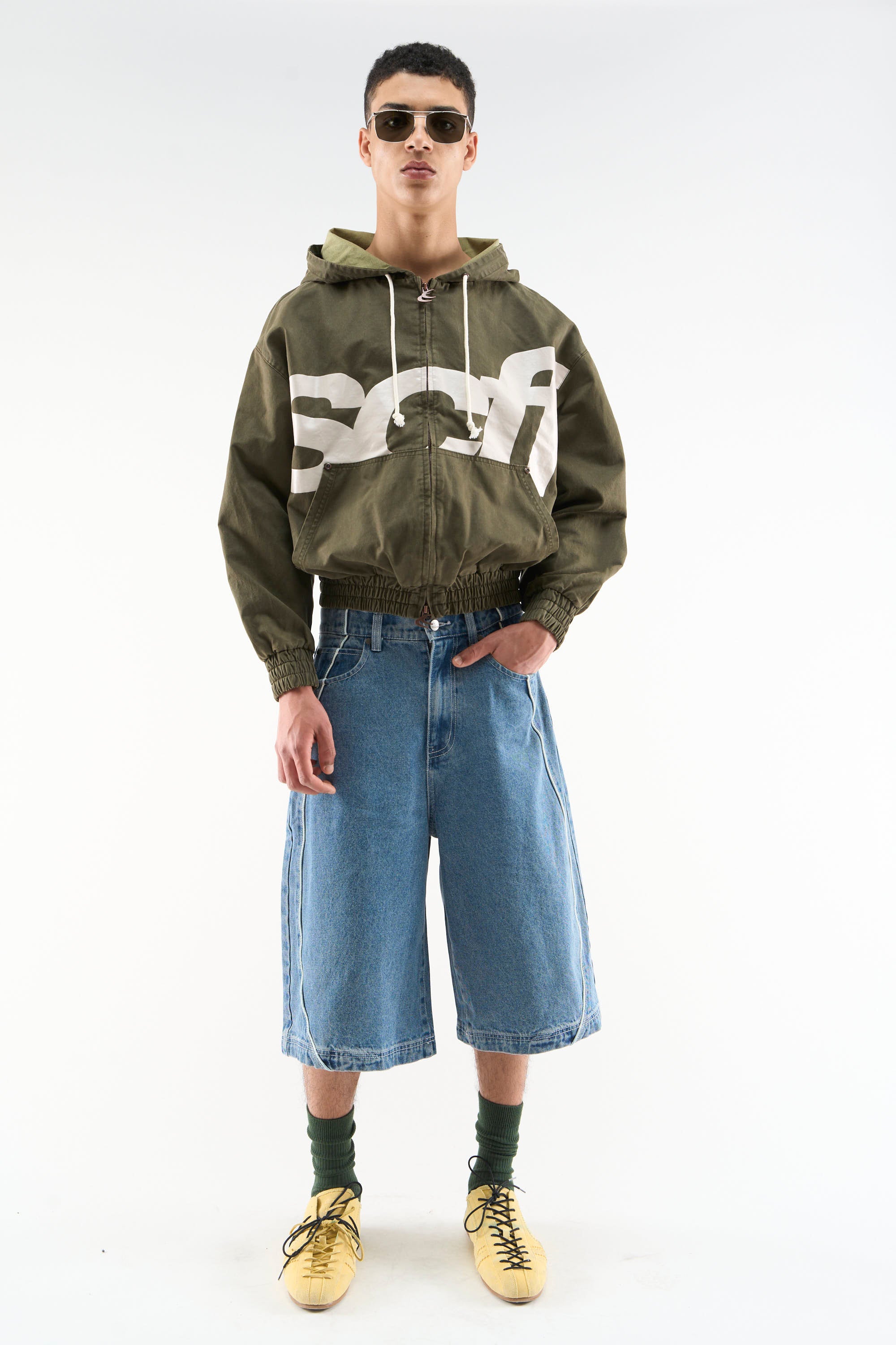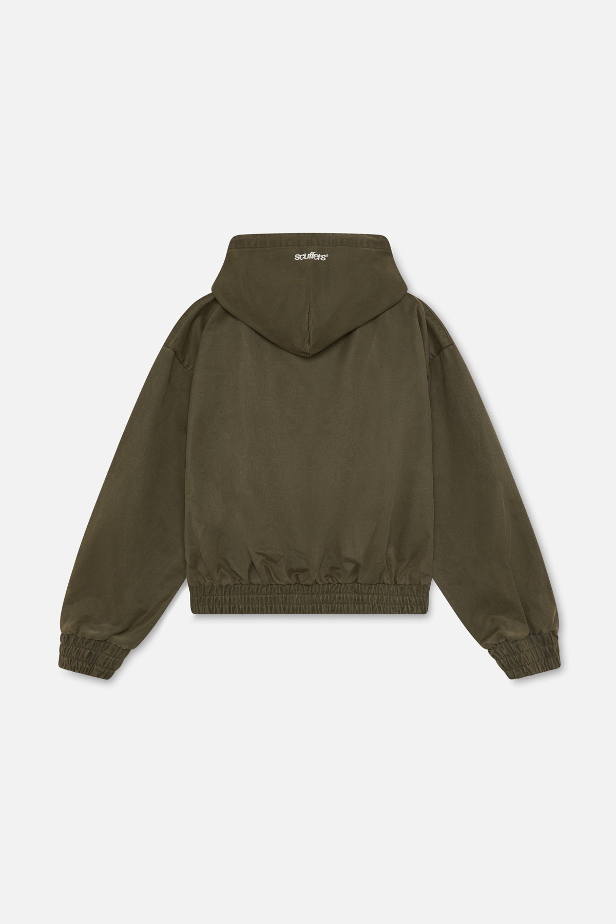 Olive hooded jacket with a relaxed cropped fit and full zip closure. Designed with dropped shoulders, elasticated hem and cuffs, and a front kangaroo pocket. Finished with contrast drawstrings and an oversized logo print across the chest.