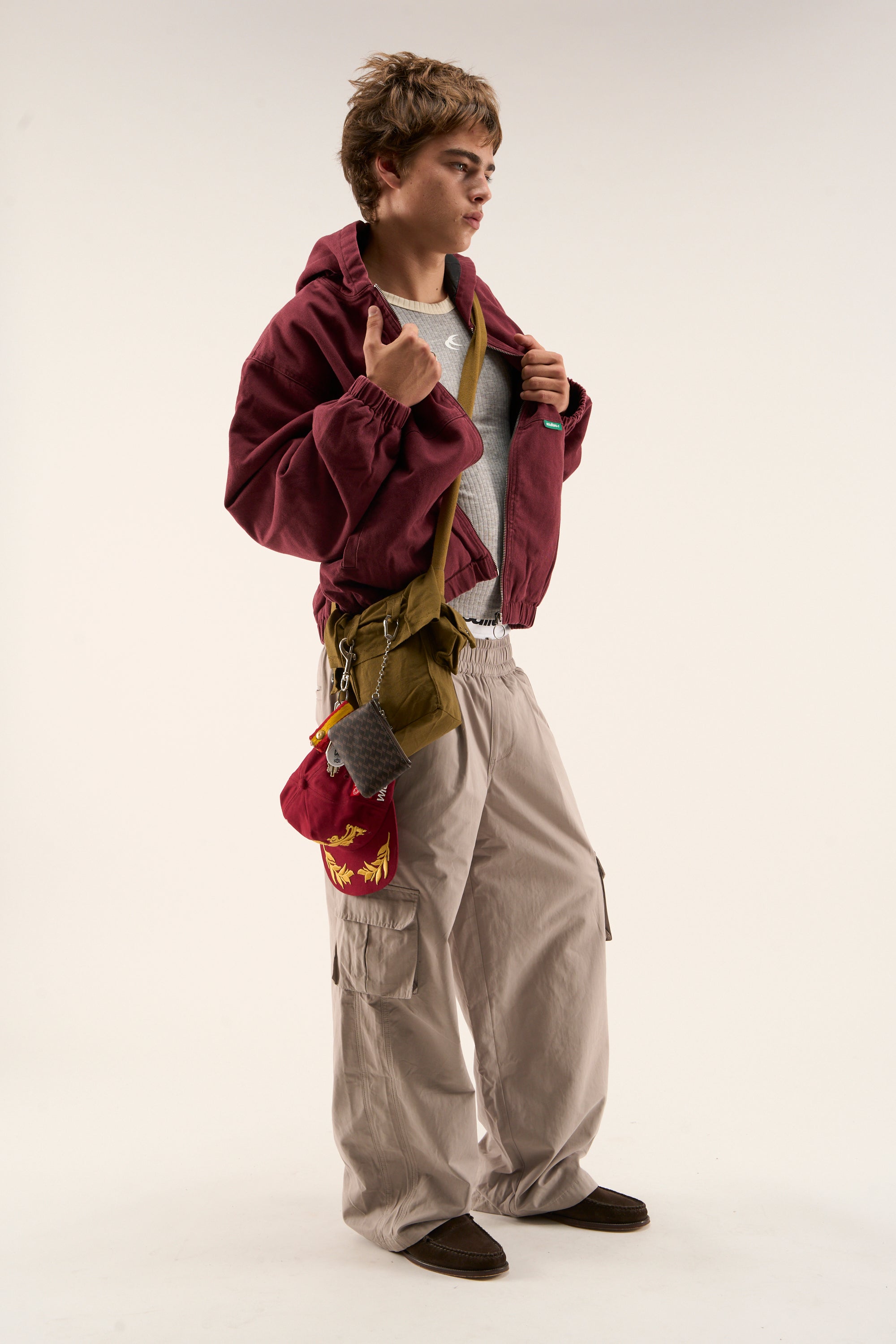 Hooded work jacket in burgundy with a zip-up front. Made from durable cotton with a quilted lining for added warmth. Features elasticated cuffs and hem for a snug fit, front patch pockets, and subtle Scuffers logo detailing.