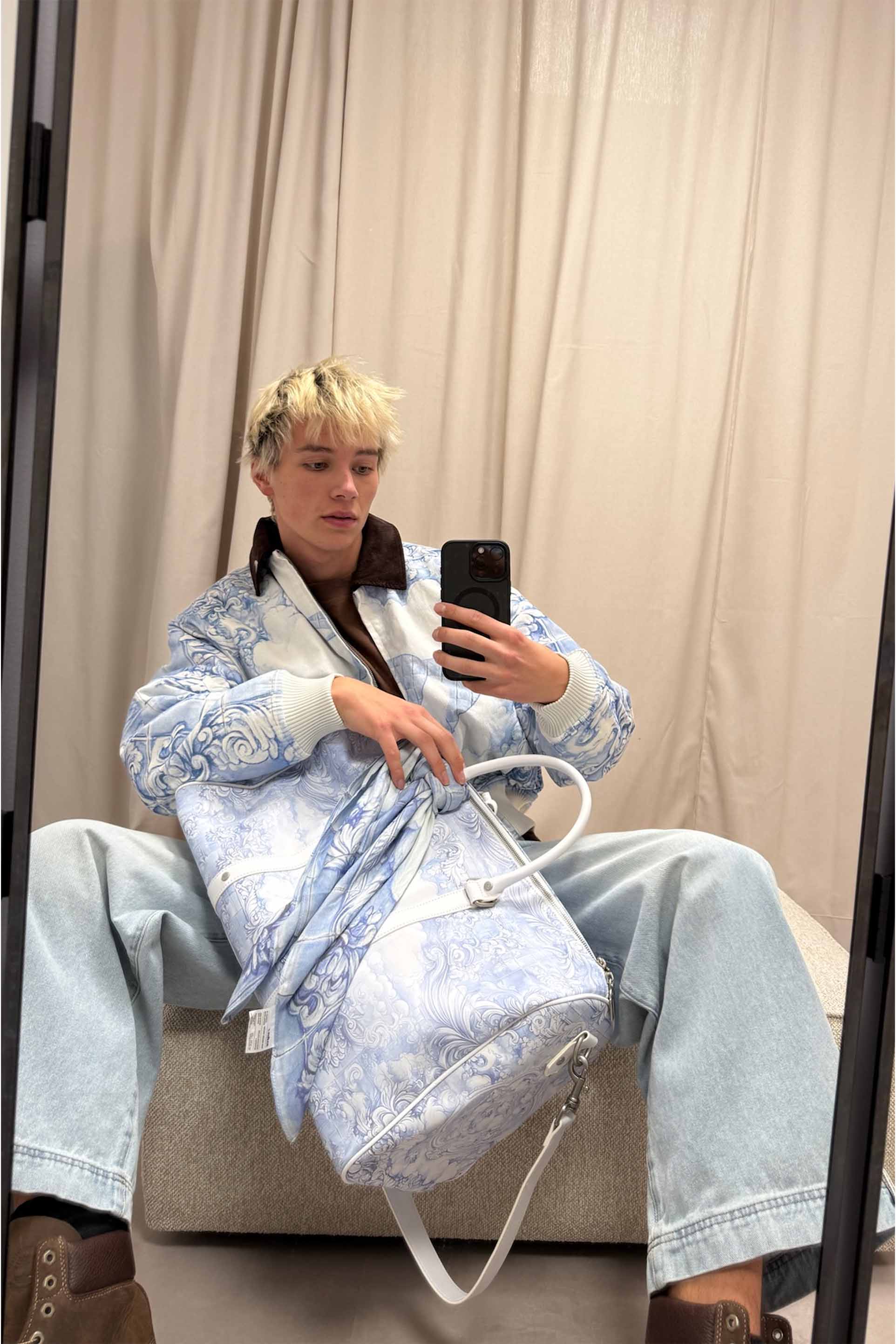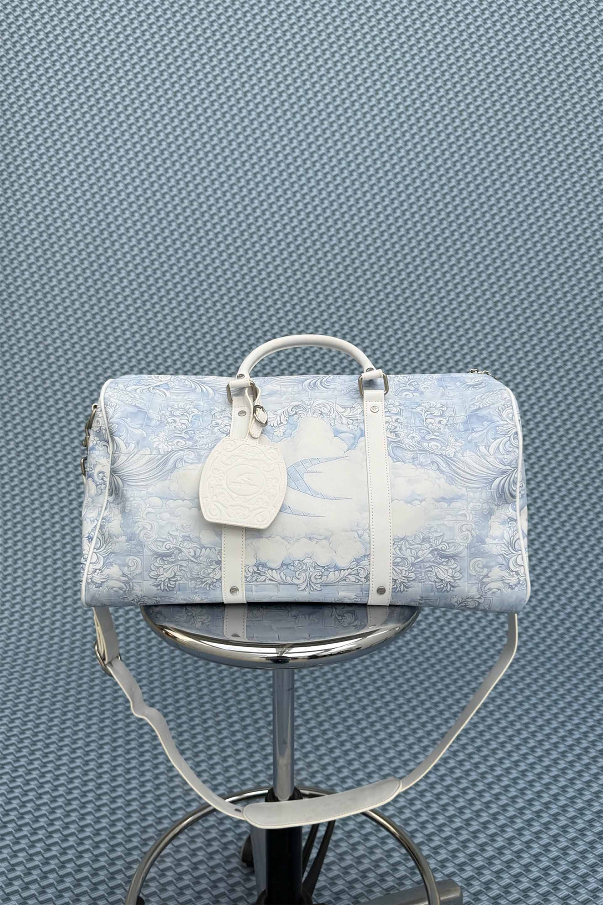 Printed Duffel Bag in sky blue with baroque-inspired tile and cloud design. Made from coated canvas with white faux leather trim and silver-tone hardware. Features double top handles, detachable shoulder strap with padded panel, and secure top zip closure. Includes embossed logo luggage tag and tonal Scuffers emblem on front. Spacious main compartment with structured base.