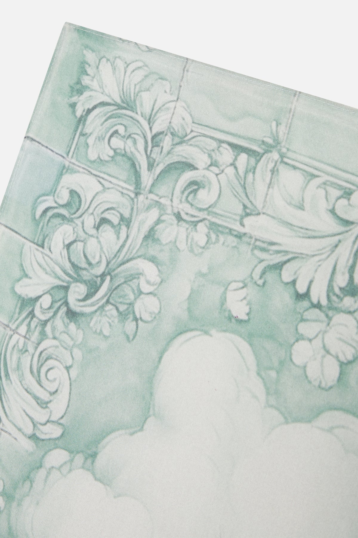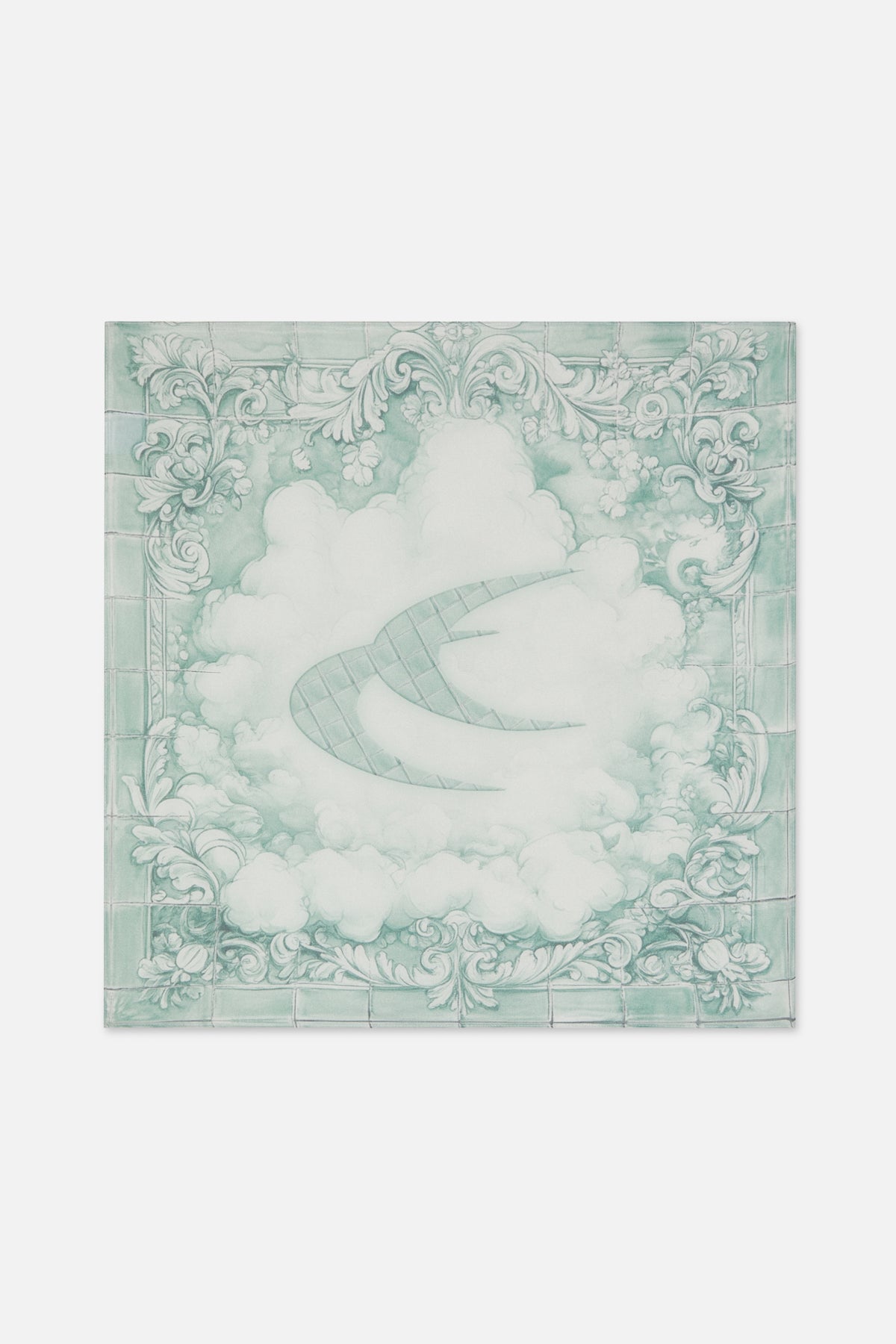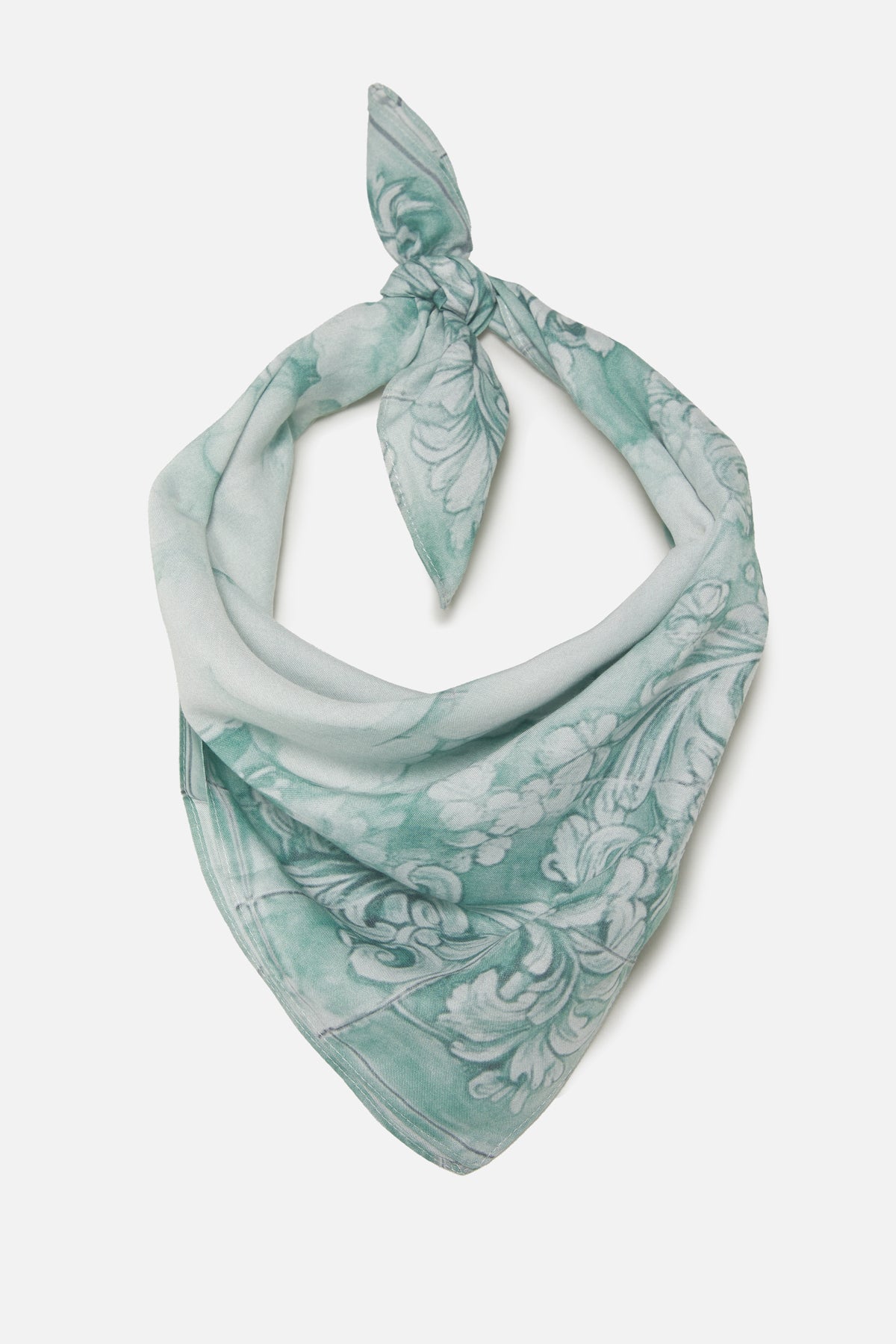 Printed Scarf in green with baroque-inspired tile and cloud motif. Made from lightweight polyester with a soft, semi-sheer finish. Square shape with stitched edges and tonal Scuffers logo integrated into the design.