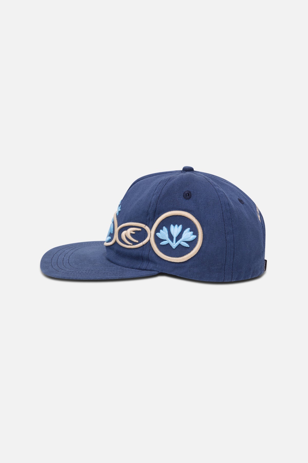 Blue cotton cap with embroidered patch detailing in light blue and beige. Features a series of circular designs across the front and sides, along with a three-star detail above the central emblem. The back includes a stitched "Scuffers" logo and an adjustable strap with a metal buckle for a customized fit. Breathable eyelets provide added comfort.