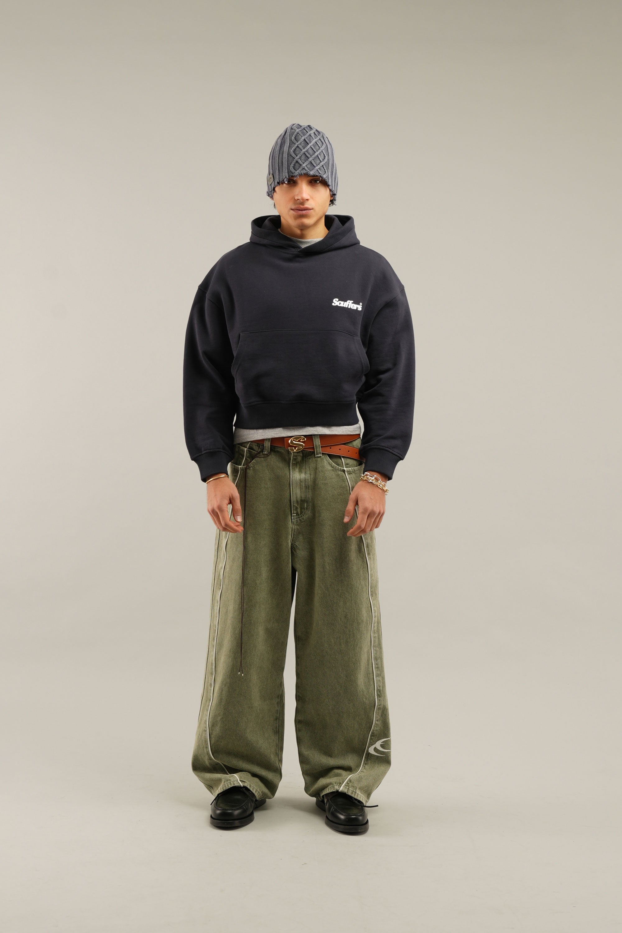 Cropped Hoodie in Dark crafted from soft, midweight cotton fleece. Features a relaxed fit, dropped shoulders, and ribbed cuffs. Includes a kangaroo pocket, adjustable hood, and Scuffers logo prints on the front and back hem.