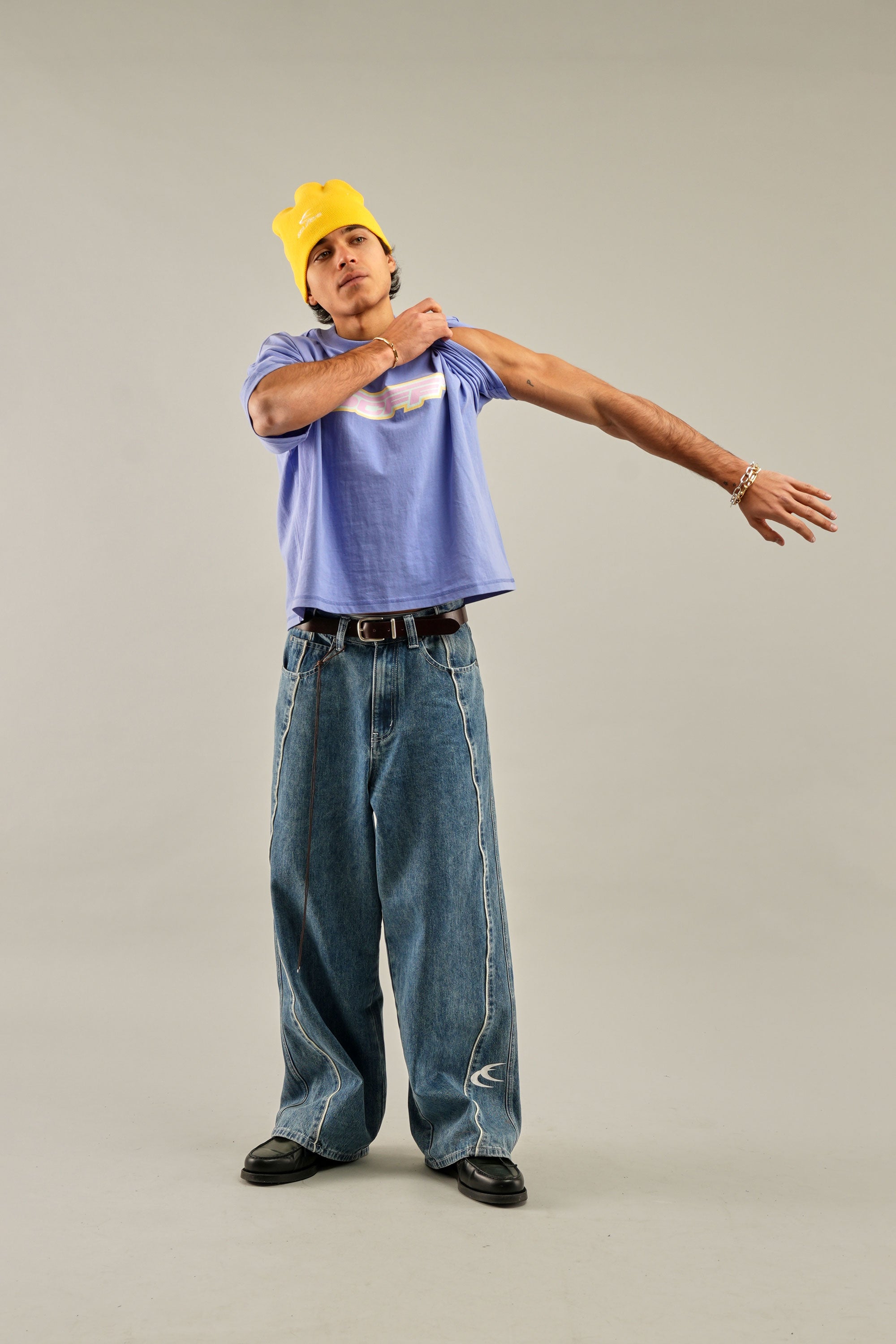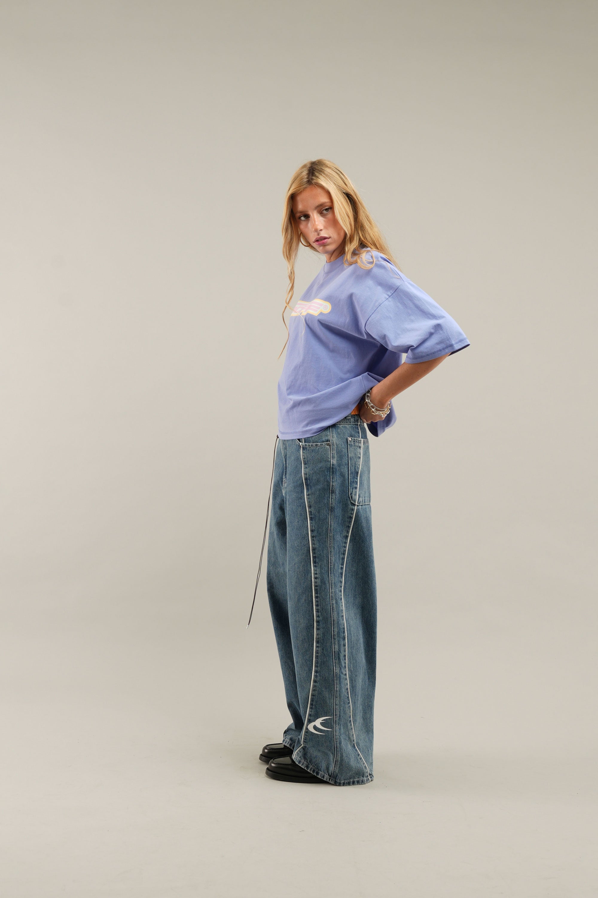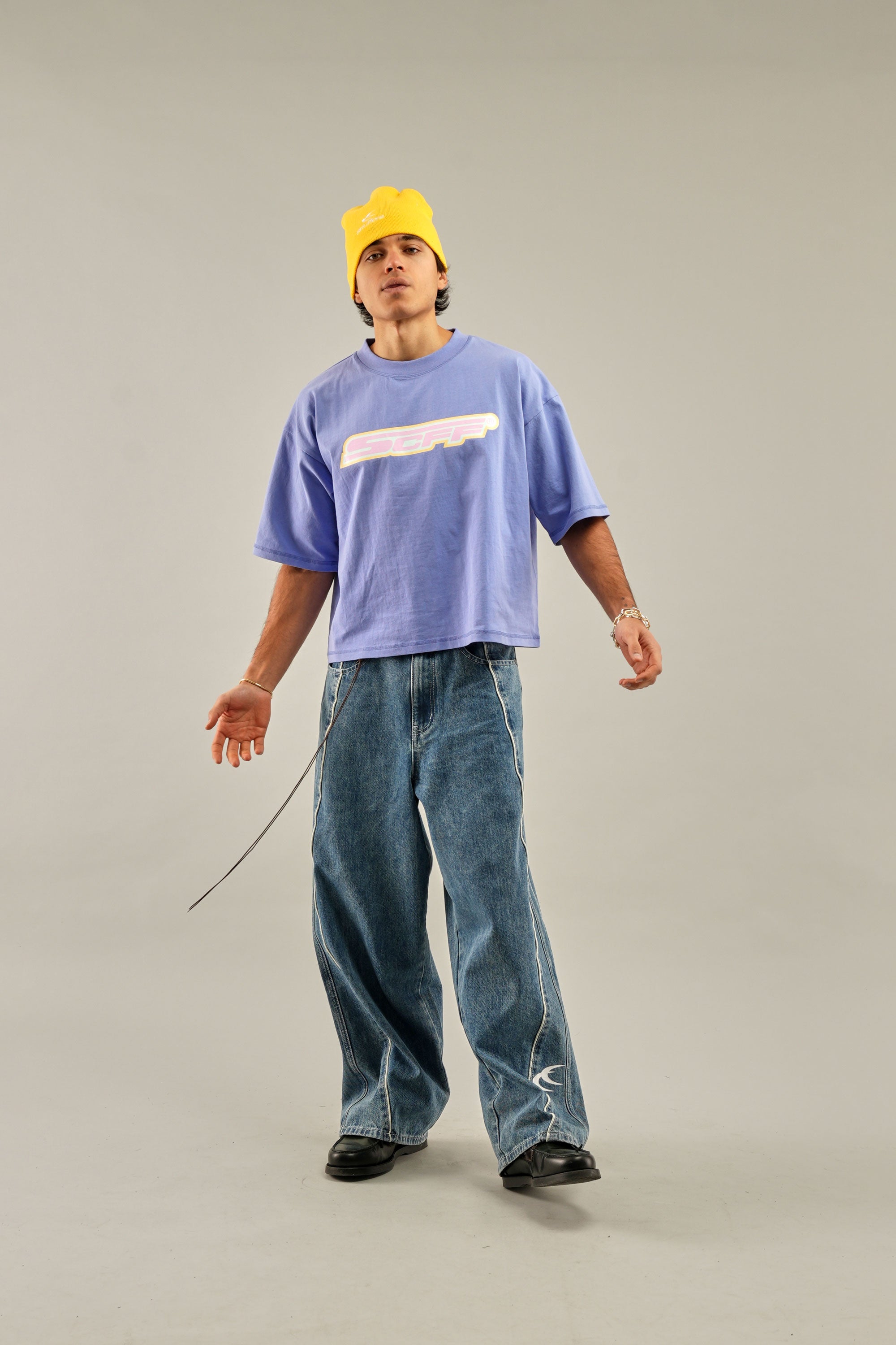 Oversized Lilac T-Shirt crafted from soft, breathable cotton. Features SCFF® graphic on the front and subtle branding on the back. Ribbed crew neckline and dropped shoulders enhance the relaxed silhouette. Designed for casual comfort and standout style.