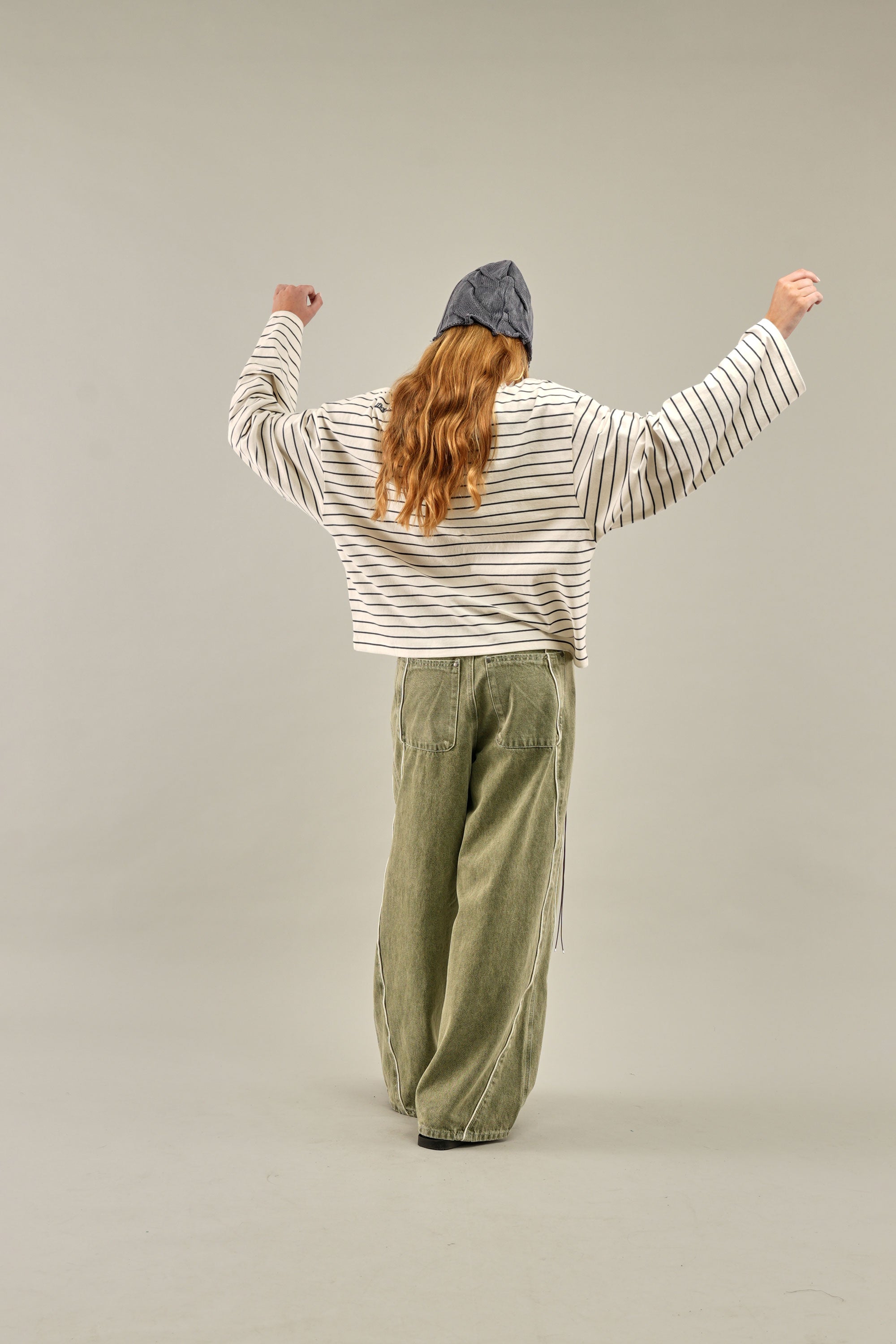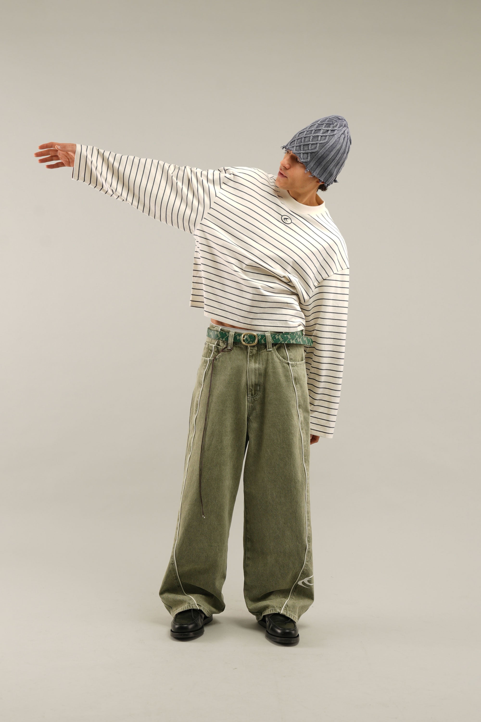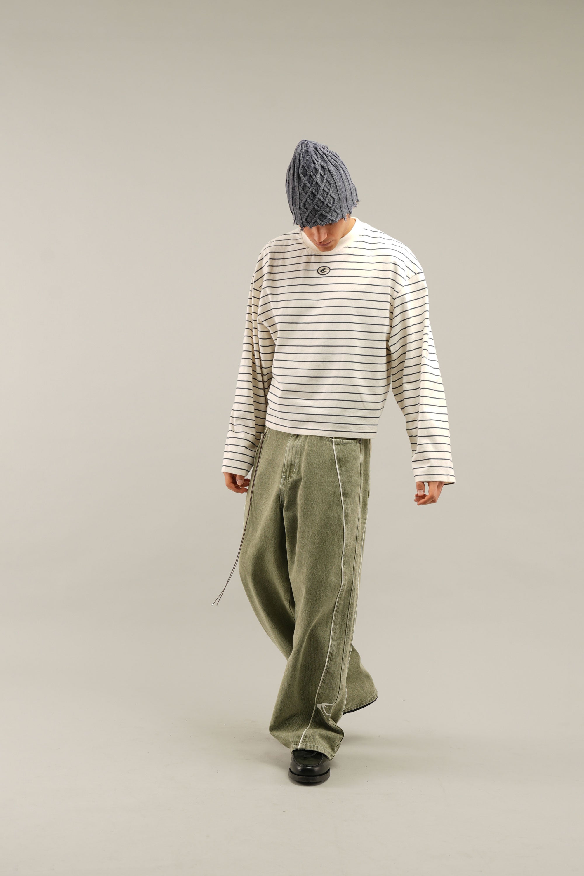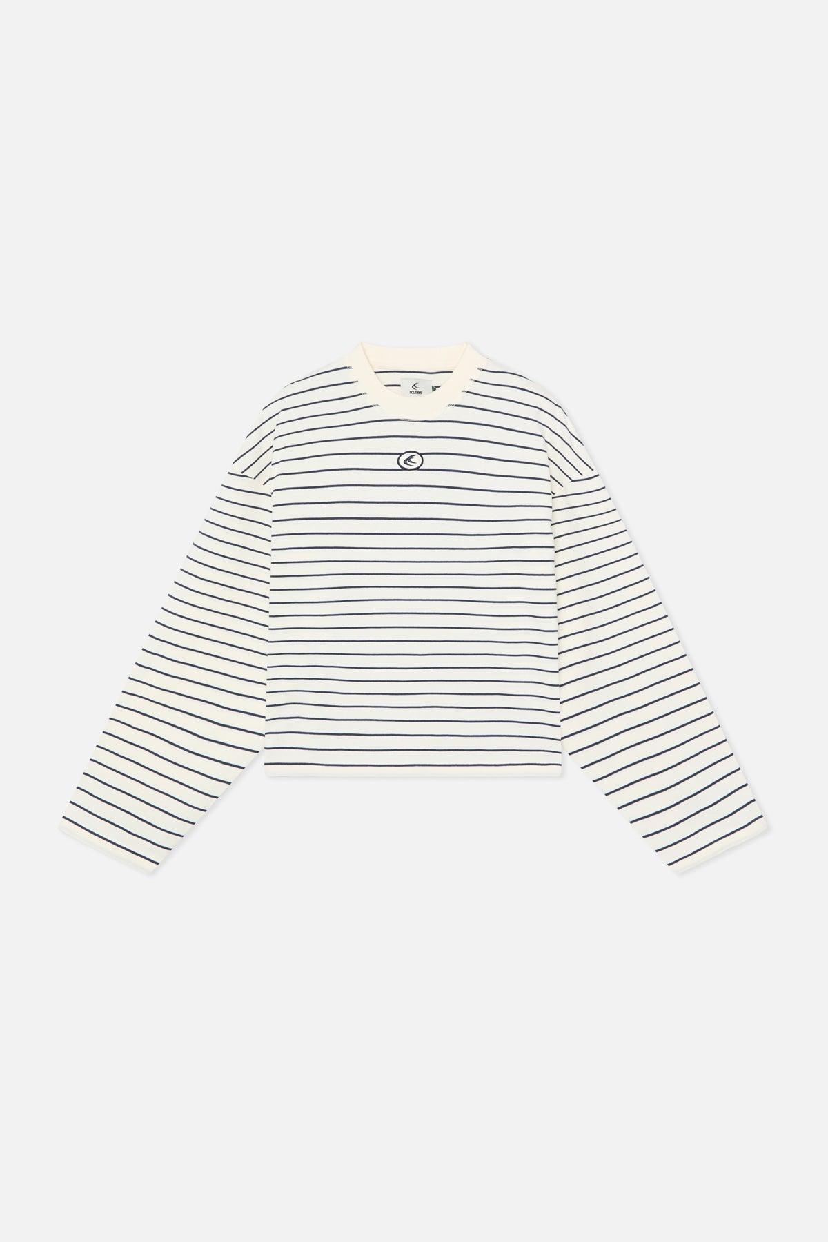 Striped Long-Sleeve T-Shirt in Ecru with white horizontal stripes. Made from soft cotton for lightweight comfort. Features an embroidered logo on the chest and subtle branding on the back shoulder. Relaxed fit with ribbed crew neckline and dropped shoulders for a casual silhouette.