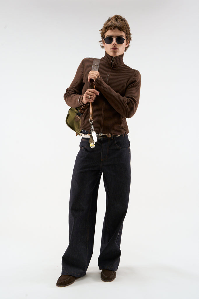 Blue Hooded Jacket in heavy cotton twill with a relaxed fit. Fully lined with brown faux shearling for added warmth. Features a full front zip with metal ring pull, stud detailing along the chest and shoulders, and elasticated cuffs and hem. Includes side welt pockets and a small woven Scuffers label on the front.