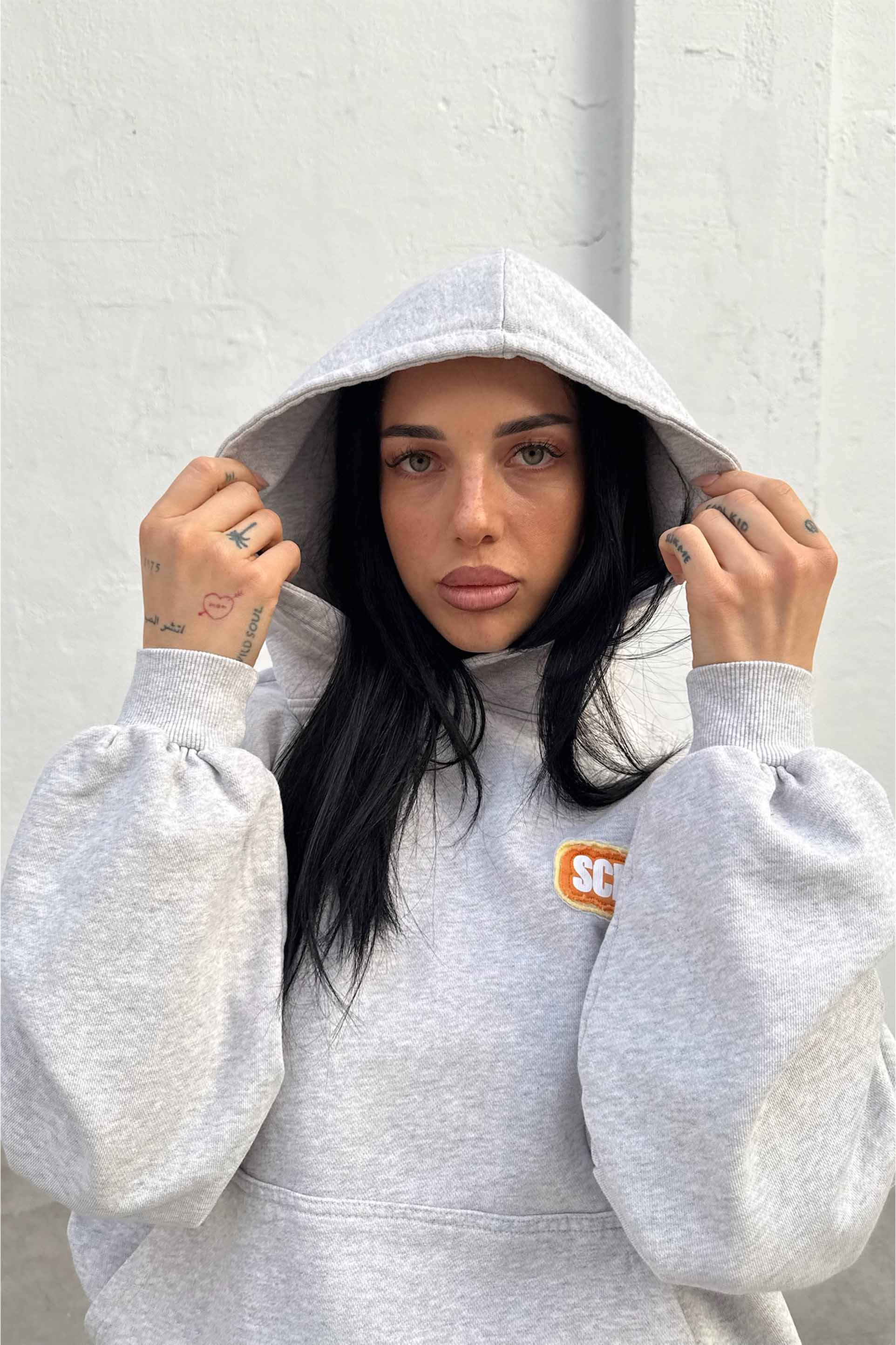 Light Grey Hoodie featuring soft fleece fabric with a relaxed, cropped silhouette. It has a front kangaroo pocket, ribbed cuffs and hem, and a hood with no drawstrings. Yellow-orange “SCFFRS®” embroidered patch on the front chest and a large matching logo across the back in puff print with a bold outline effect.