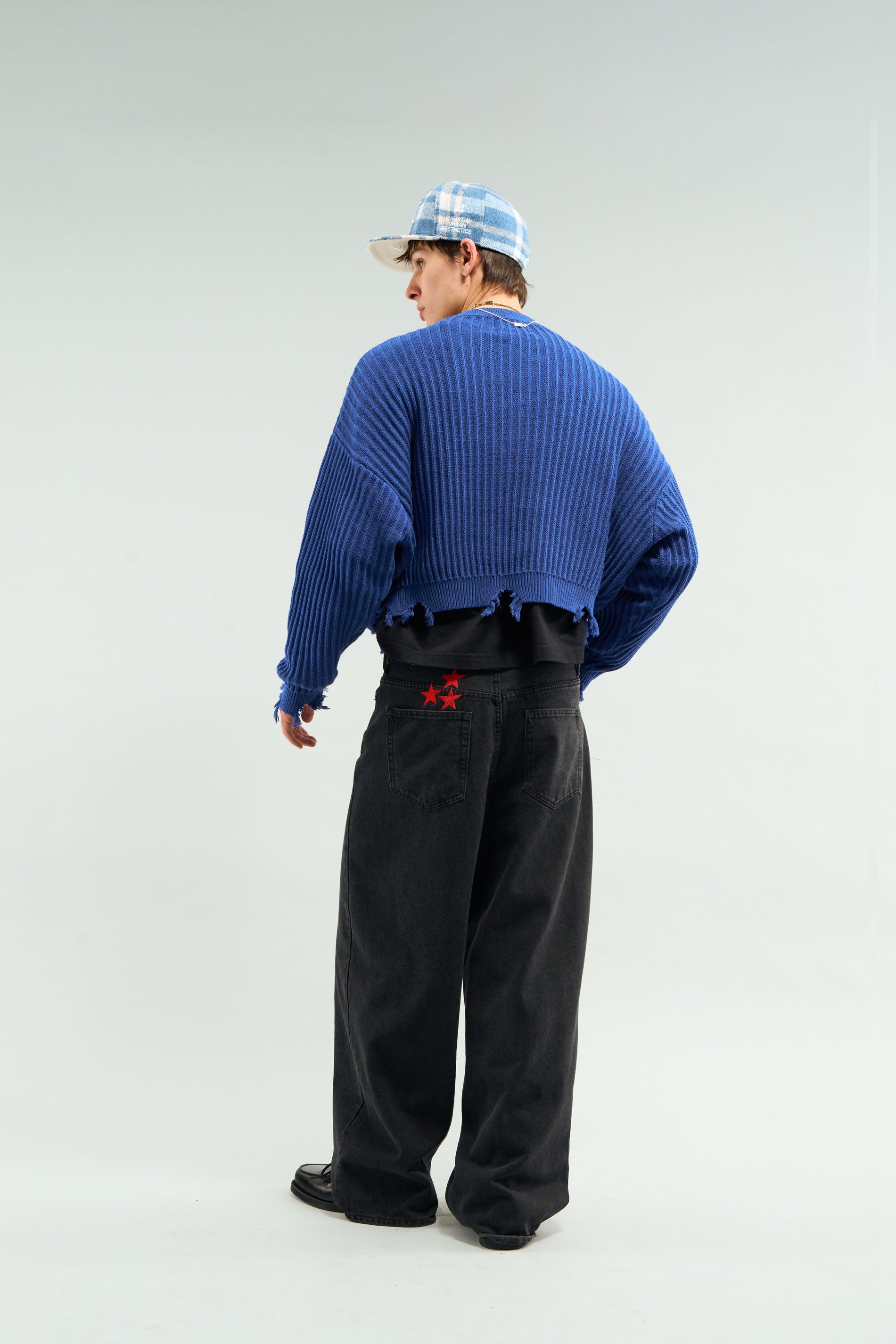 Royal Blue ribbed knit sweater with a relaxed fit and dropped shoulders. Features distressed detailing at the hem and cuffs, along with embroidered logos and text on the front. Crew neck design for a classic silhouette. Soft and warm fabric suitable for casual layering.