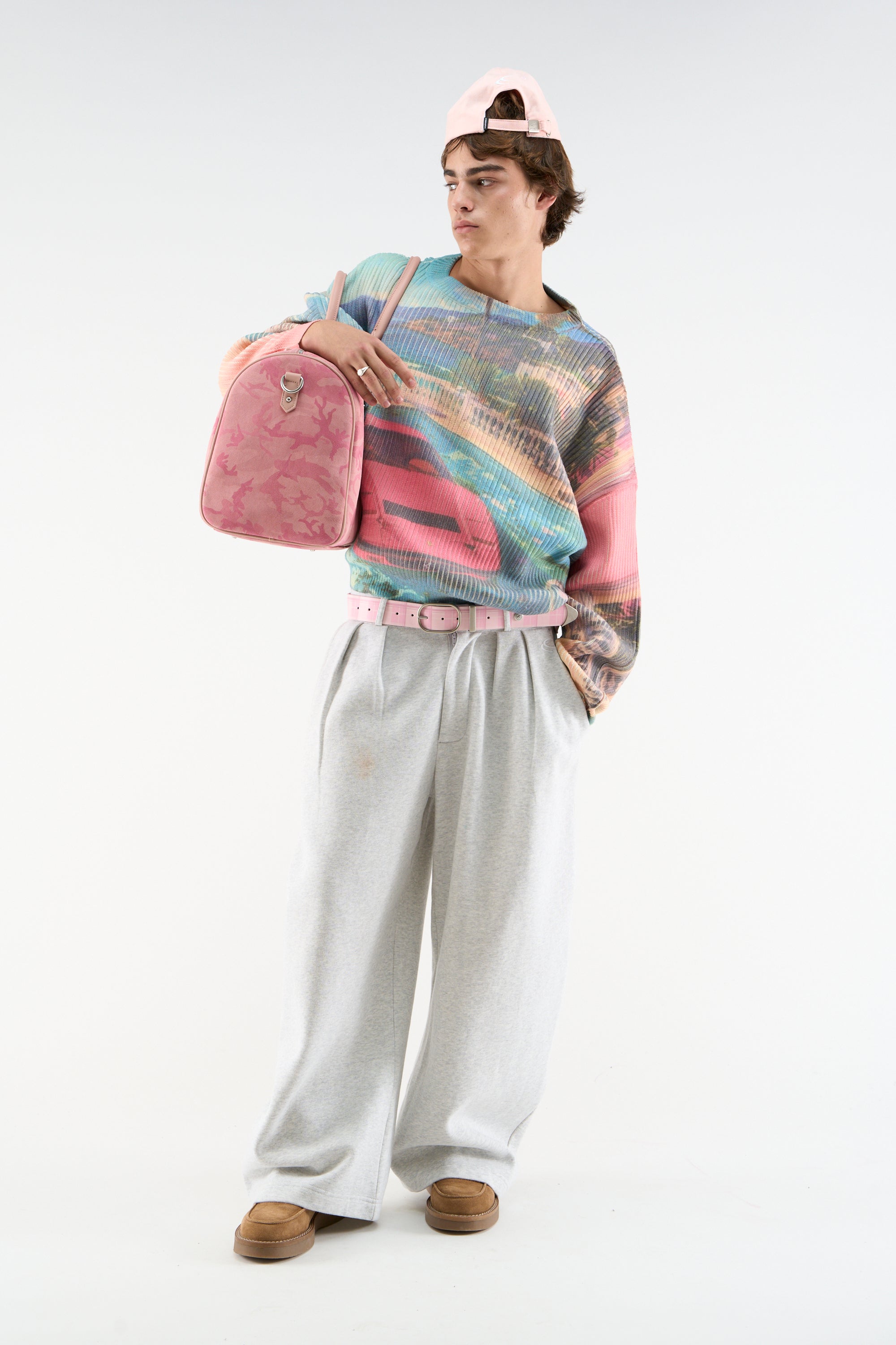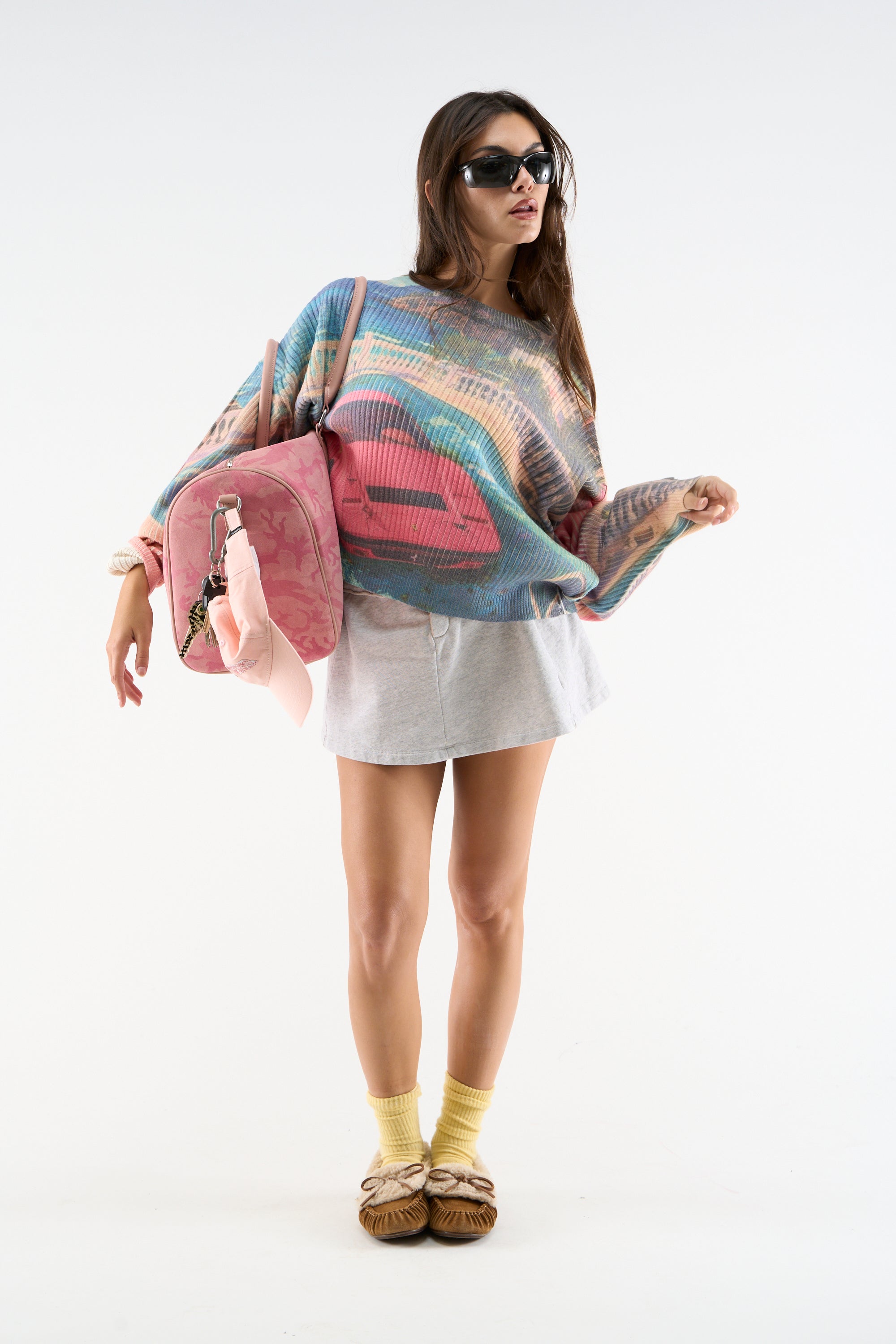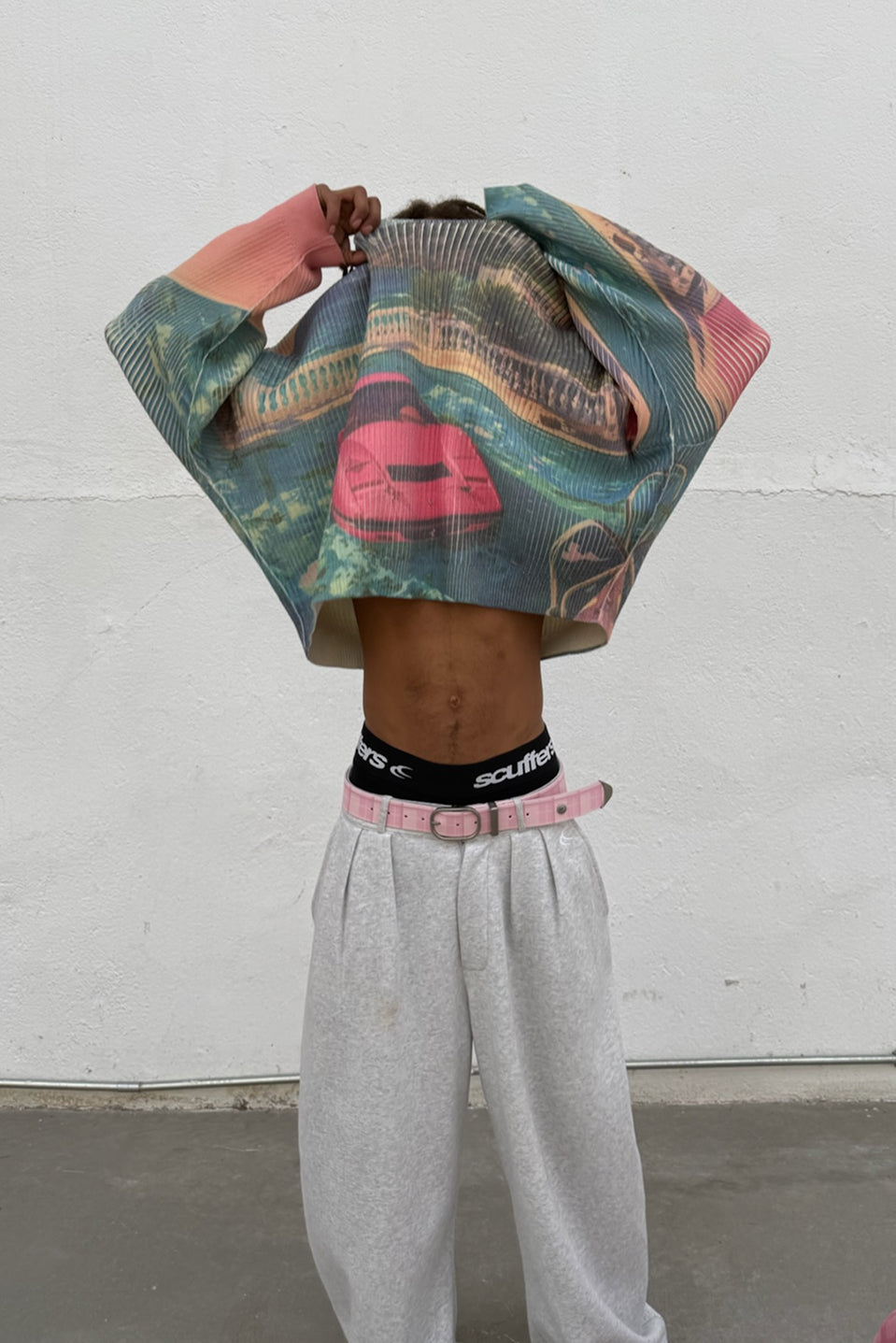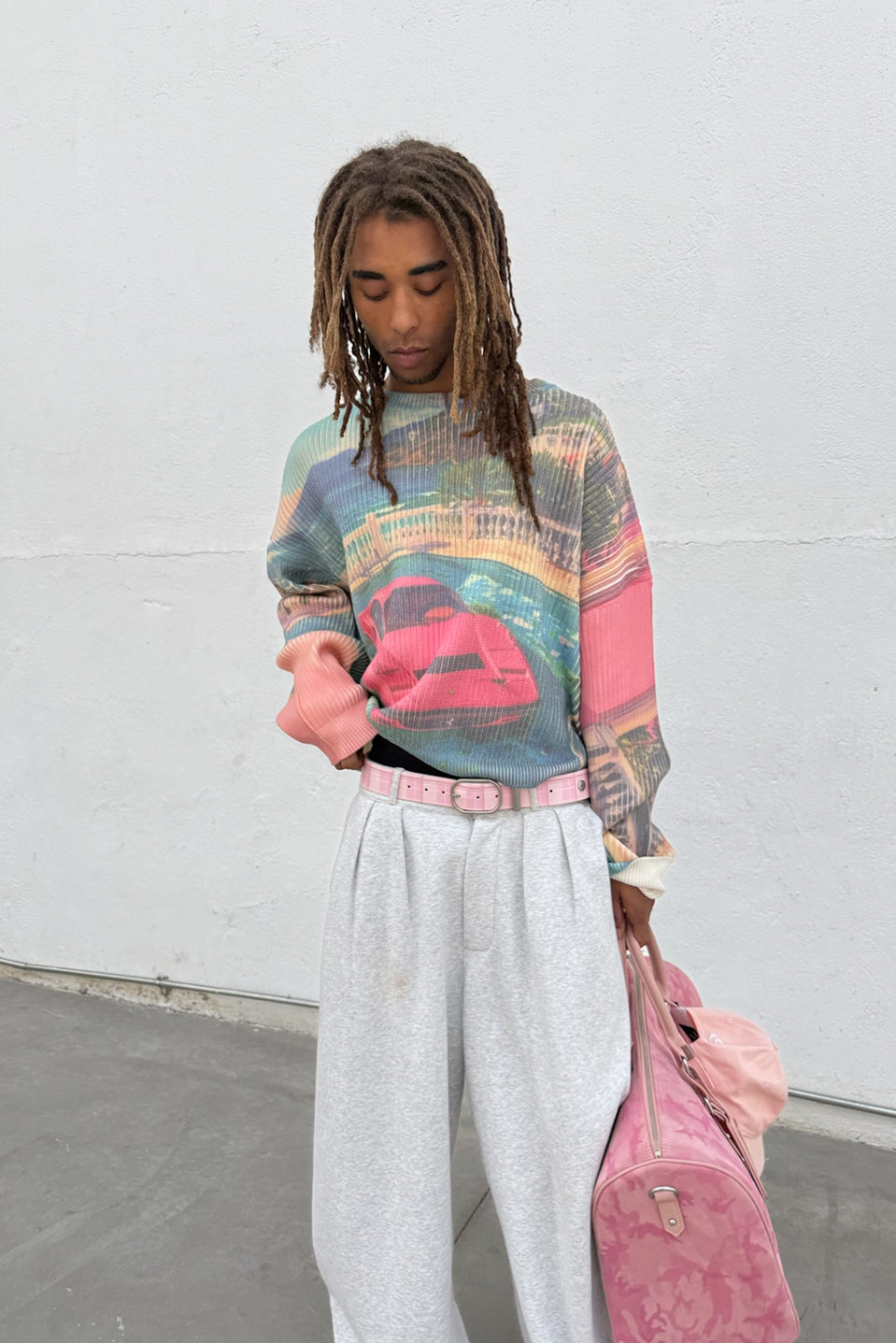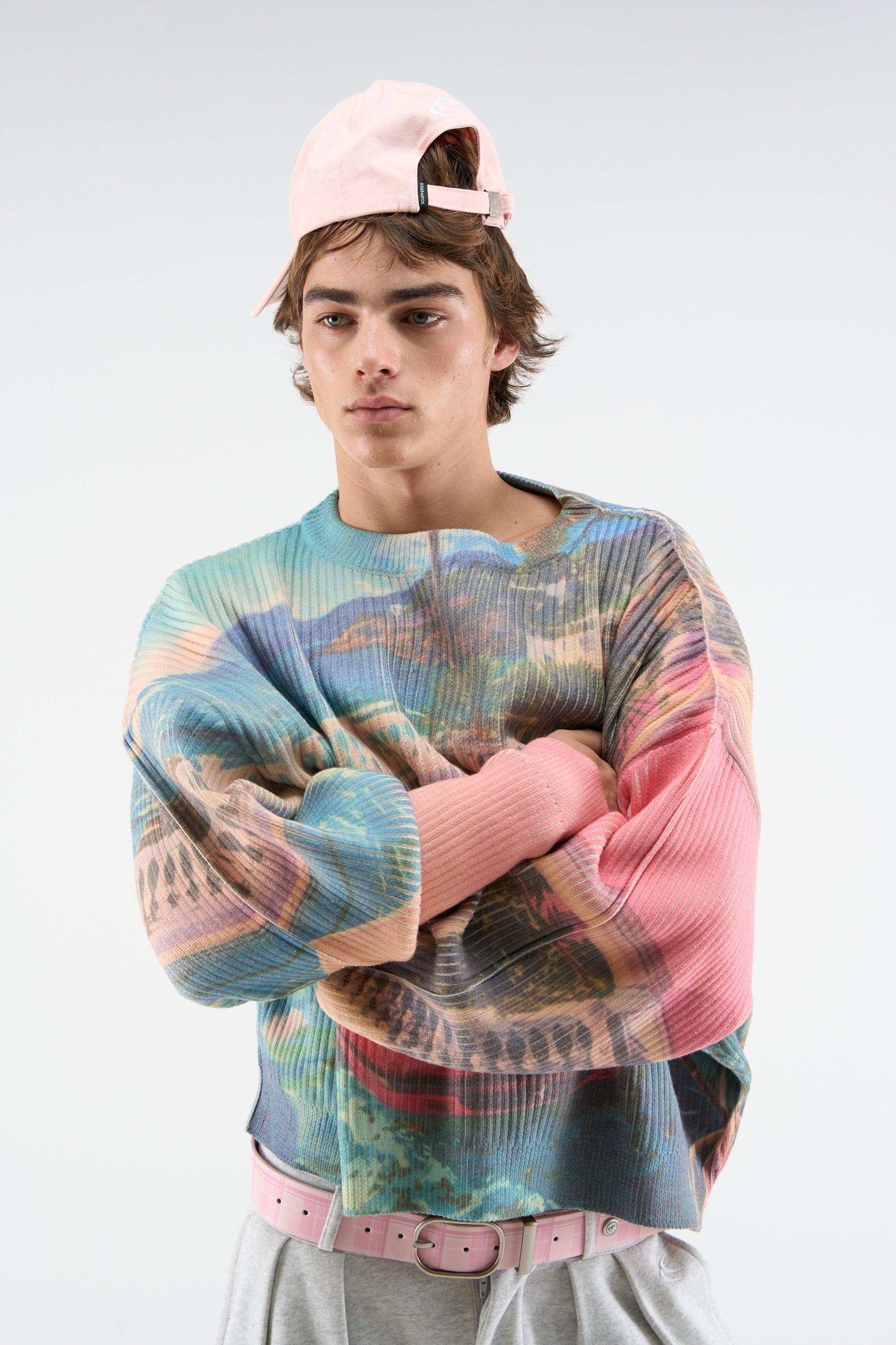 Ribbed Graphic Sweatshirt made from soft cotton-blend fabric with an all-over printed design. Features a textured vertical rib structure, relaxed fit, and ribbed crewneck collar and cuffs. Sublimated imagery covers front, back, and sleeves.