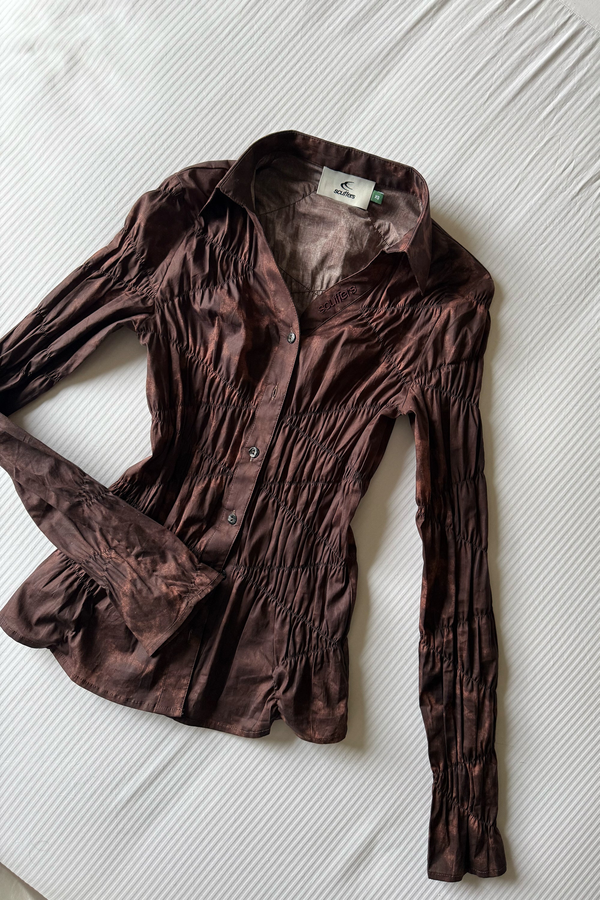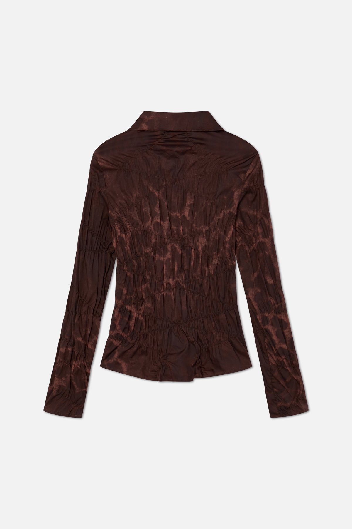 Brown Tie-Dye Ruched Shirt in a lightweight woven fabric with a semi-sheer look. Slim fit with all-over ruching for a textured, gathered finish. Point collar, button front, and long sleeves. Tonal embroidered Scuffers detail at inner placket.