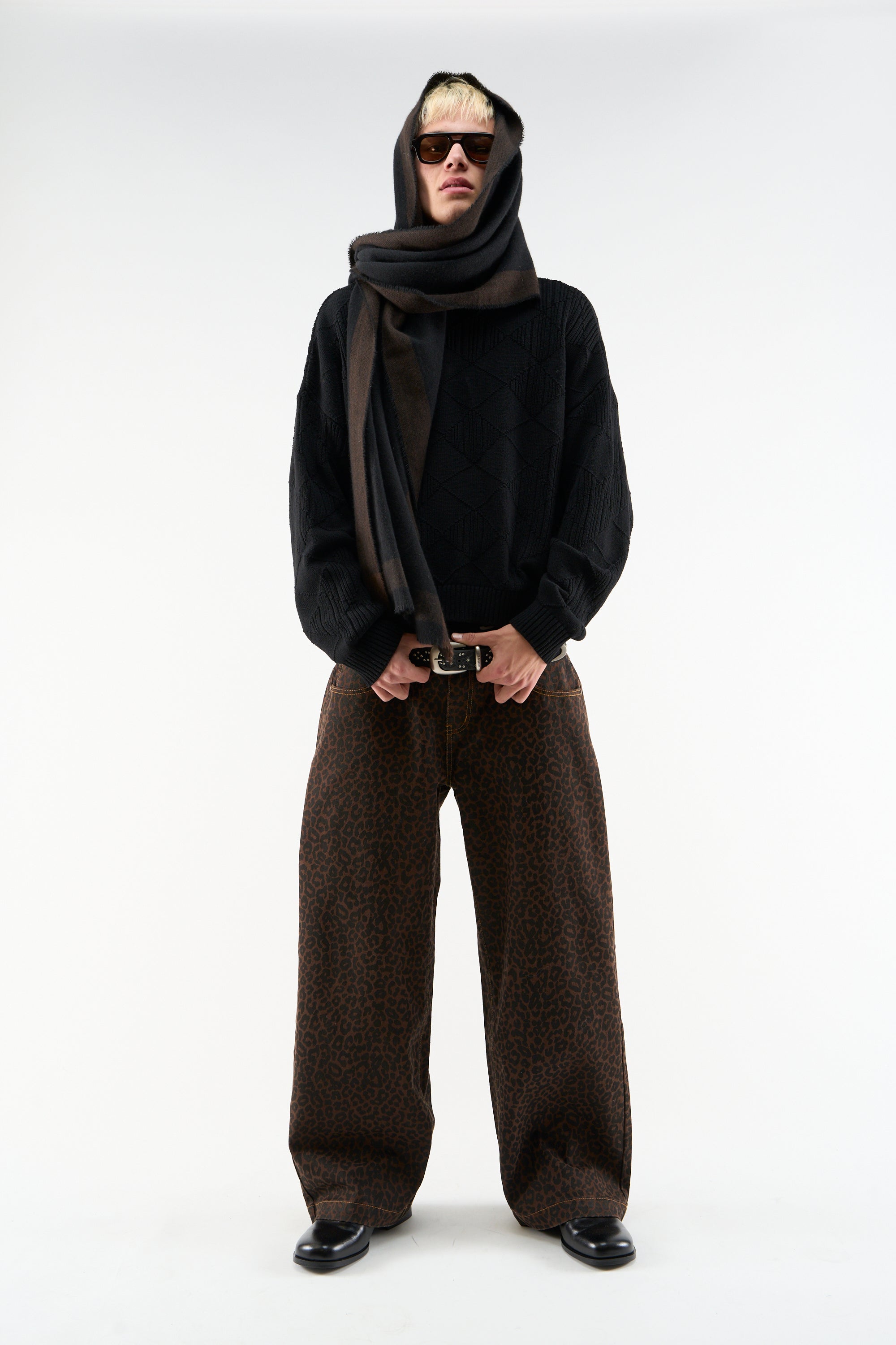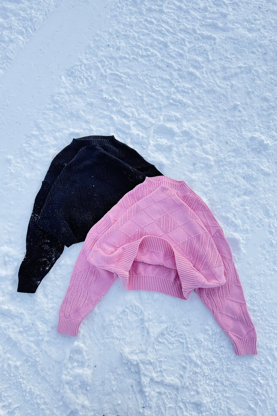 Black knit sweater made from soft cotton blend fabric. Features a diamond pattern woven throughout the front and sleeves. The sweater has a ribbed crew neckline, cuffs, and hem for a fitted finish. A small "Scuffers Studio" logo patch is stitched on the back. The back and sleeves maintain the same textured pattern as the front, with no additional design details.