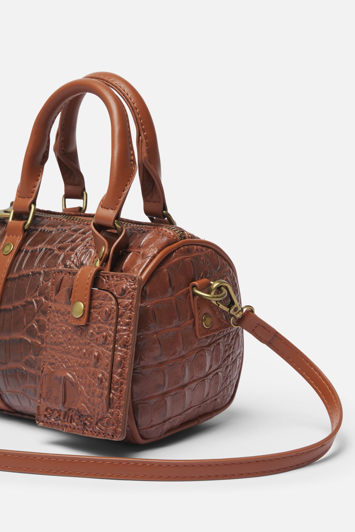 Brown croc-embossed polyurethane bag with top handles and a detachable shoulder strap. Features a front leather tag with embossed "Scuffers" logo and brass-tone hardware details. The structured design includes a zip closure and rounded edges for a sleek, compact silhouette. Finished with gold-tone rivet details at the base and leather straps.