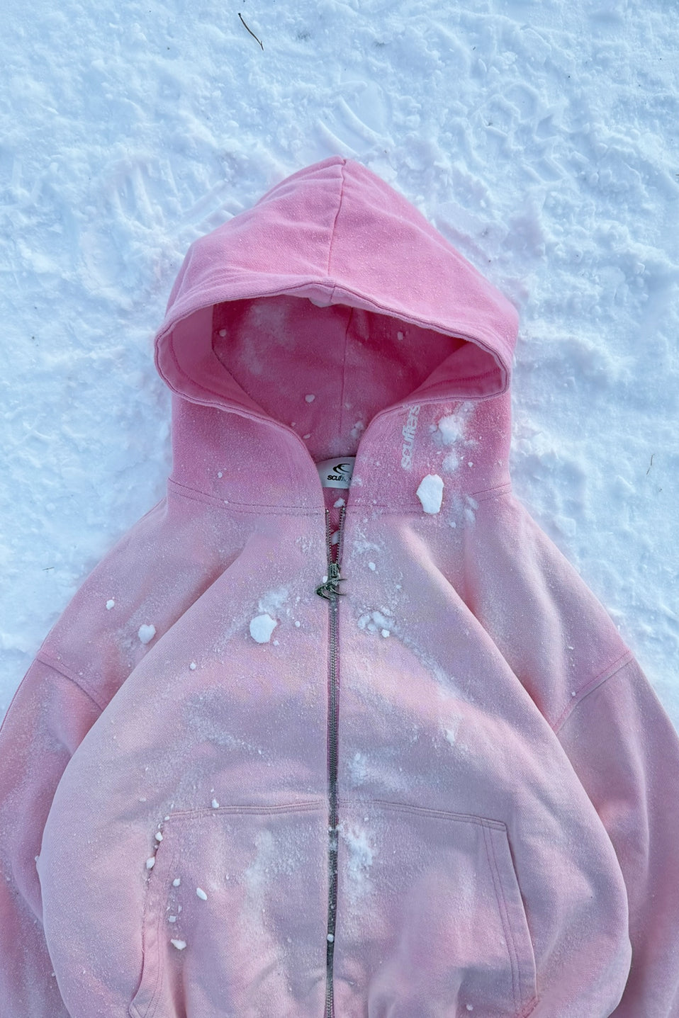 Pink zip-up hoodie made from soft cotton blend fabric with a smooth finish. Features a cropped fit with oversized front pockets and ribbed cuffs and hem. The hoodie has a full-length zipper with a silver-tone pull. The "Scuffers" logo is embroidered in white on the hood. The back is plain with no additional design details.