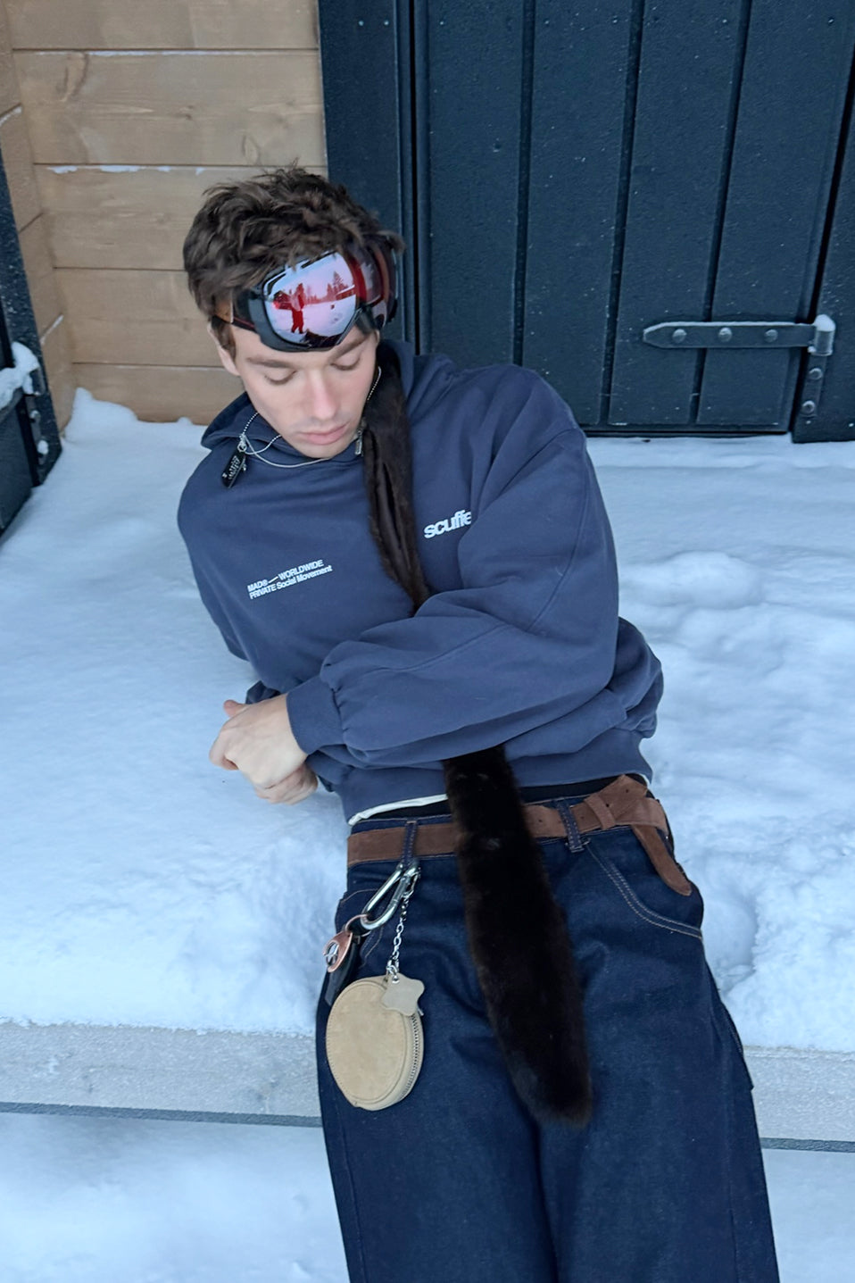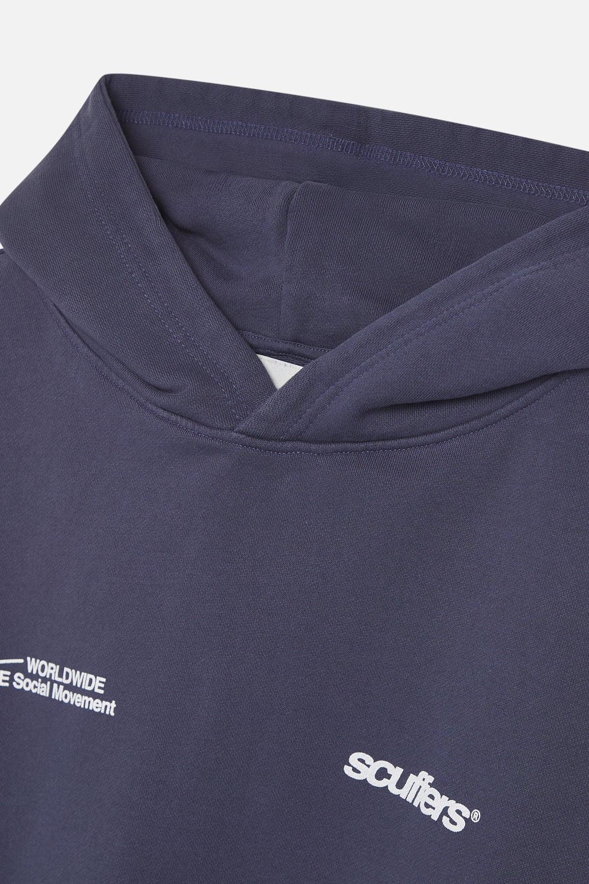 Blue hoodie made from heavyweight cotton fleece with a brushed interior. Features a bold "Scuffers" applique on the back in large, textured lettering, with a mix of stitching and metallic studs. The front displays "MADE WORLDWIDE PRIVATE Social Movement" in clean, minimal text, with a small embroidered logo at the back. Ribbed cuffs and hem provide a comfortable, fitted finish, and the front kangaroo pocket adds functionality. Relaxed fit with dropped shoulders for a casual, oversized silhouette.