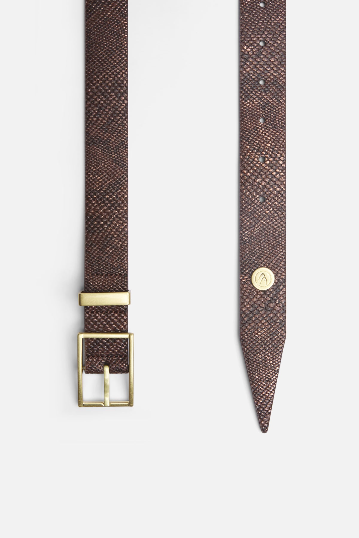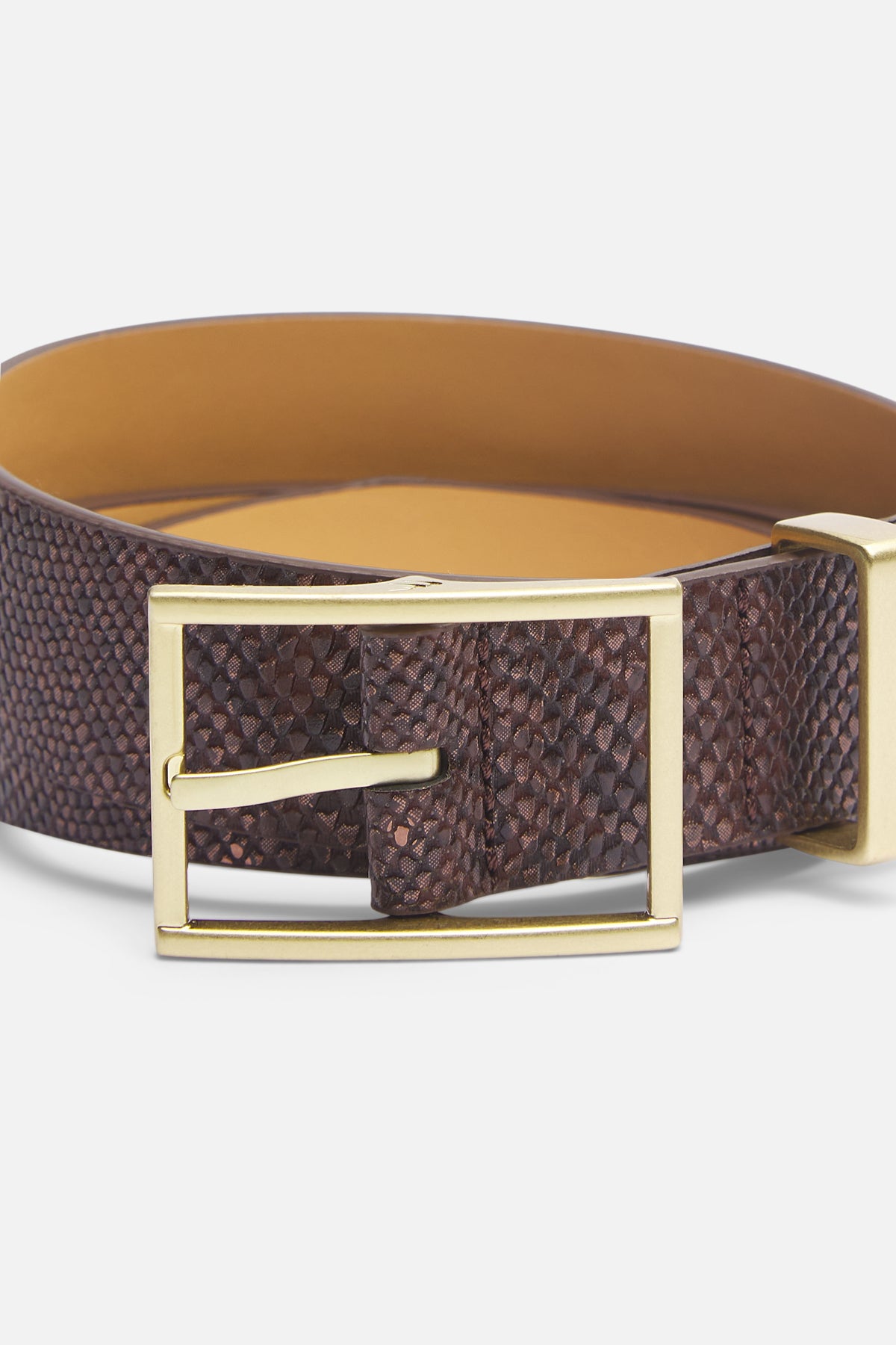 Snake-Print Leather Belt made from faux leather with a rich brown snake-like pattern. Features a polished gold metal buckle and matching metal tip. Structured design with multiple adjustment holes for a perfect fit.