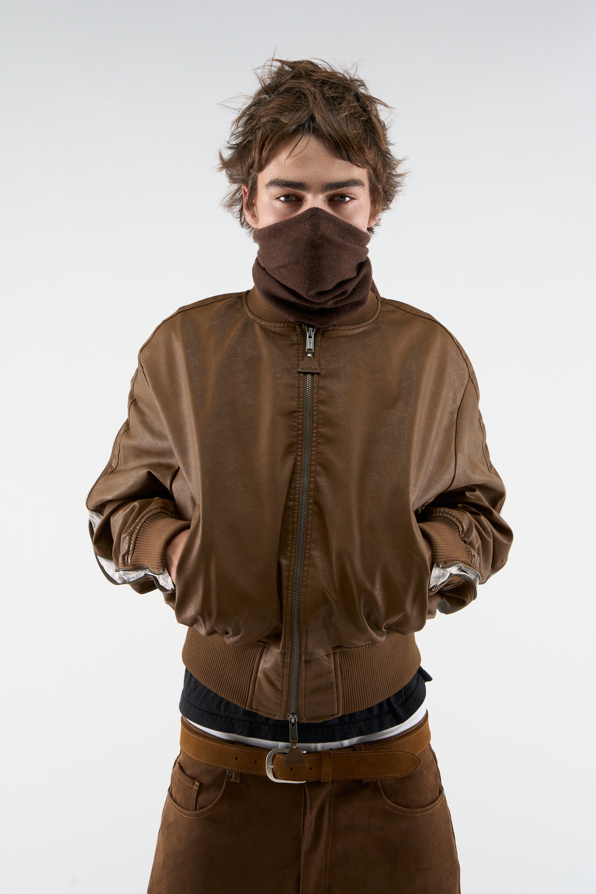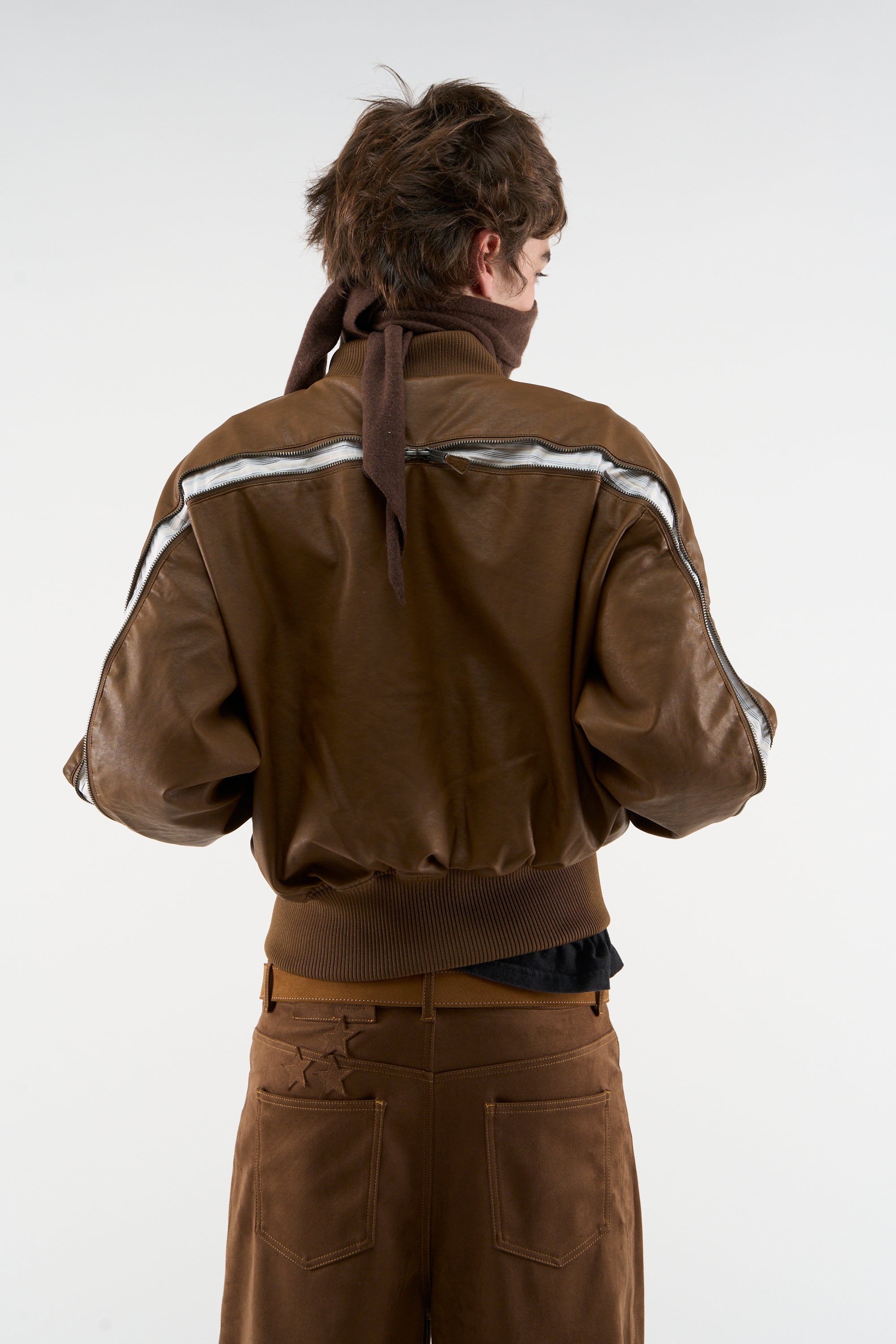Bomber Jacket made from a faux leather material in a rich brown tone. Features a ribbed collar, cuffs, and hem for a snug fit. The jacket has a zip-up front with a metal zipper and side pockets for added functionality. The back includes a unique zipper detail that allows the back portion to be opened, adding a relaxed, stylish touch to the design.