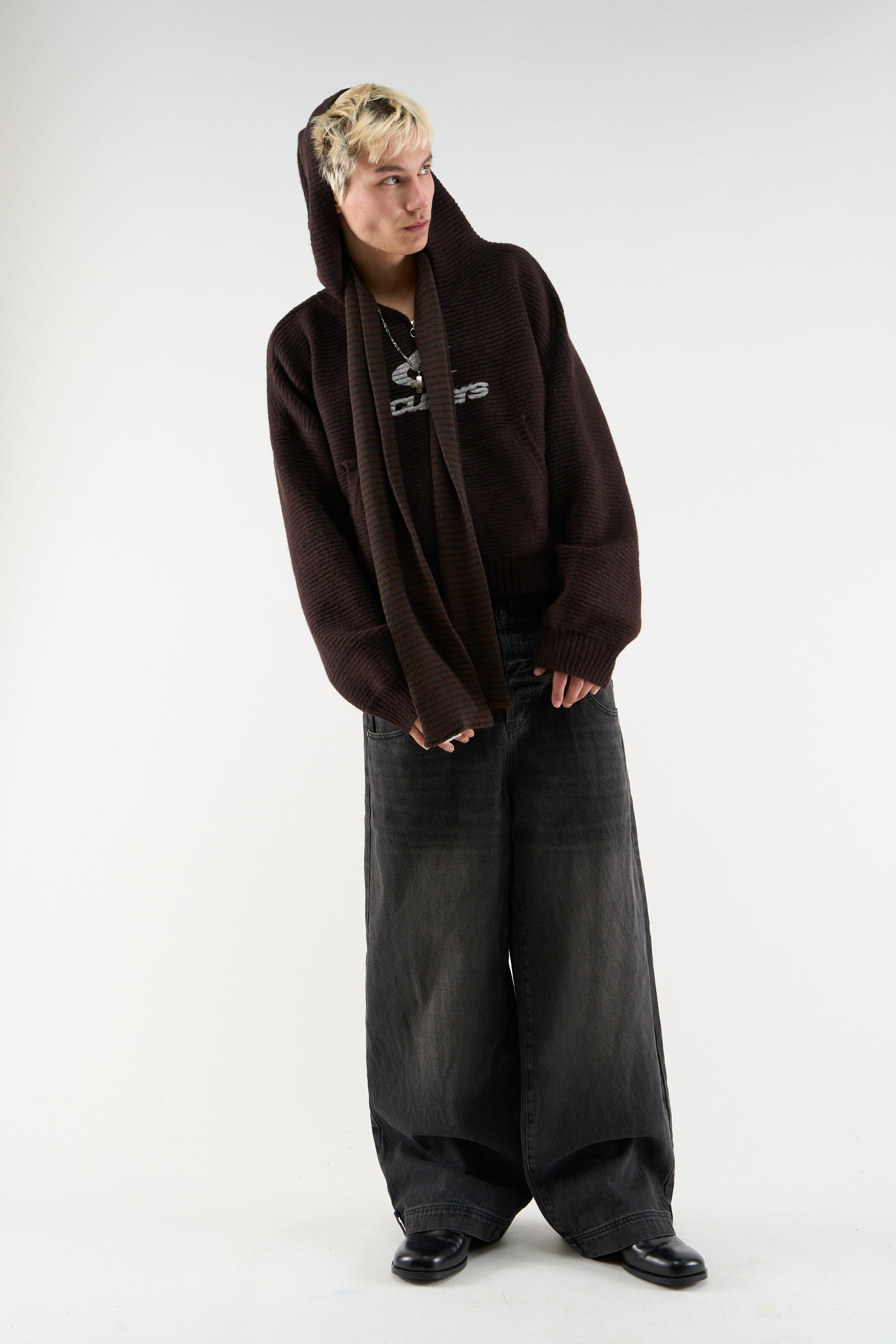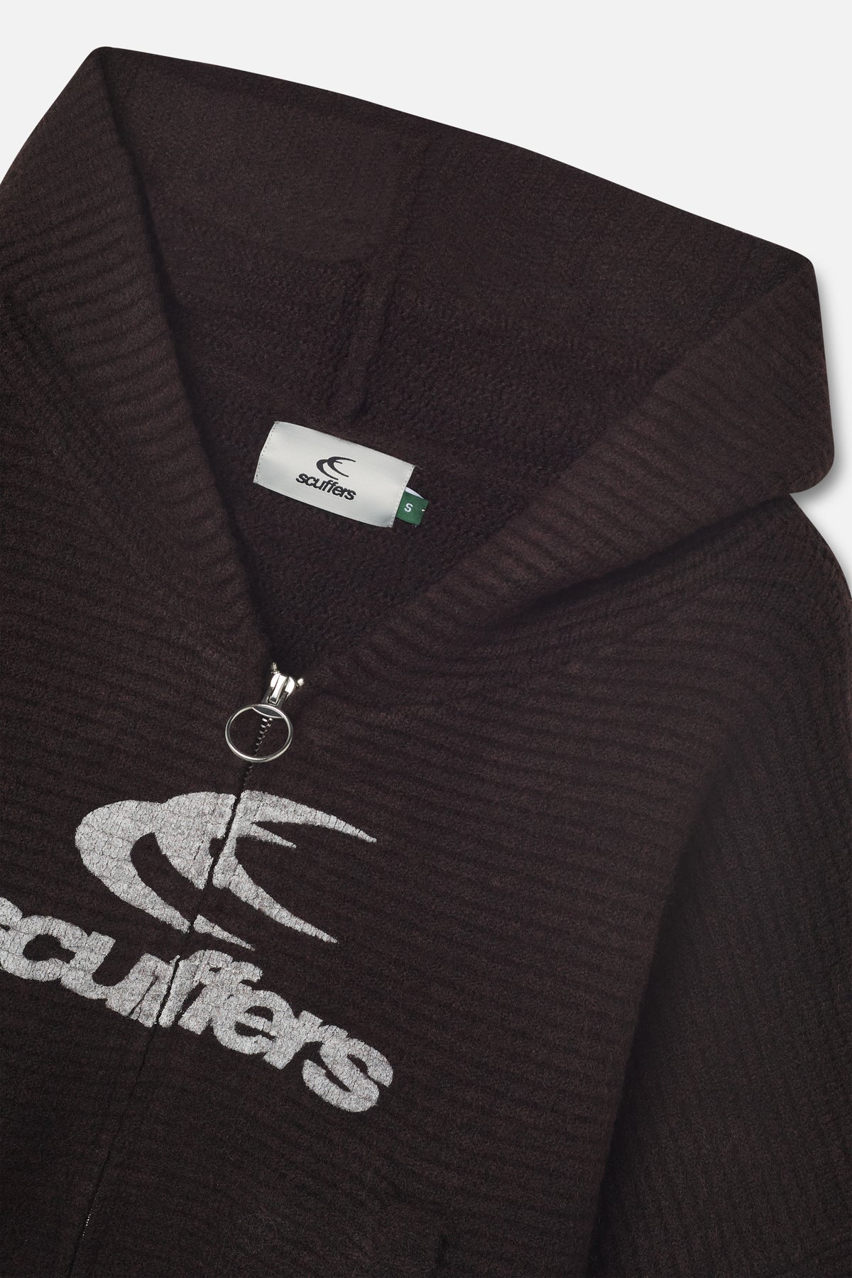 Ribbed Sweater made from a mainly polyester blend. Features a large white "scuffers" logo on the front, a hood with a drawstring, and a full-length zipper closure. The design includes front pockets and ribbed detailing at the cuffs and hem.