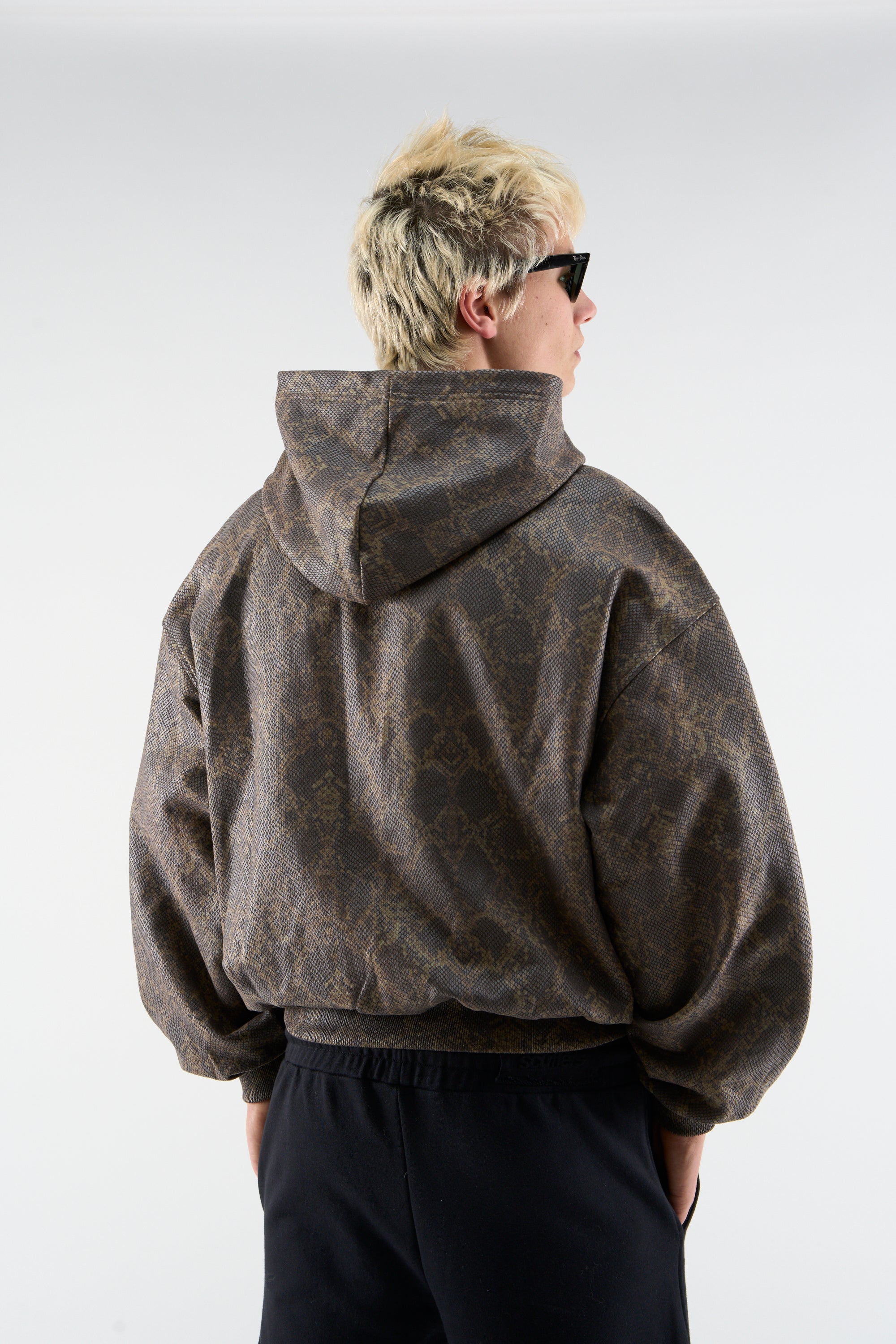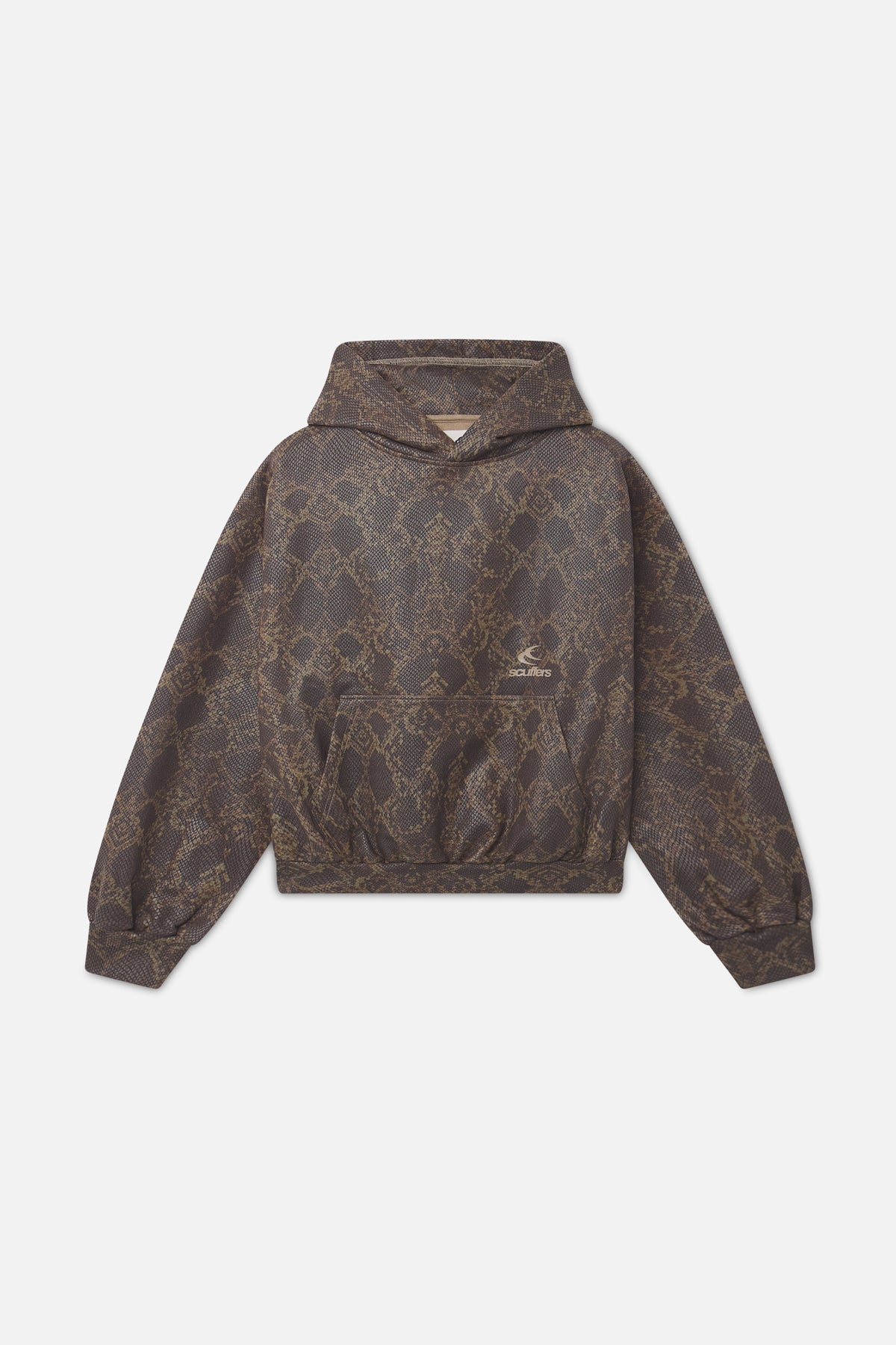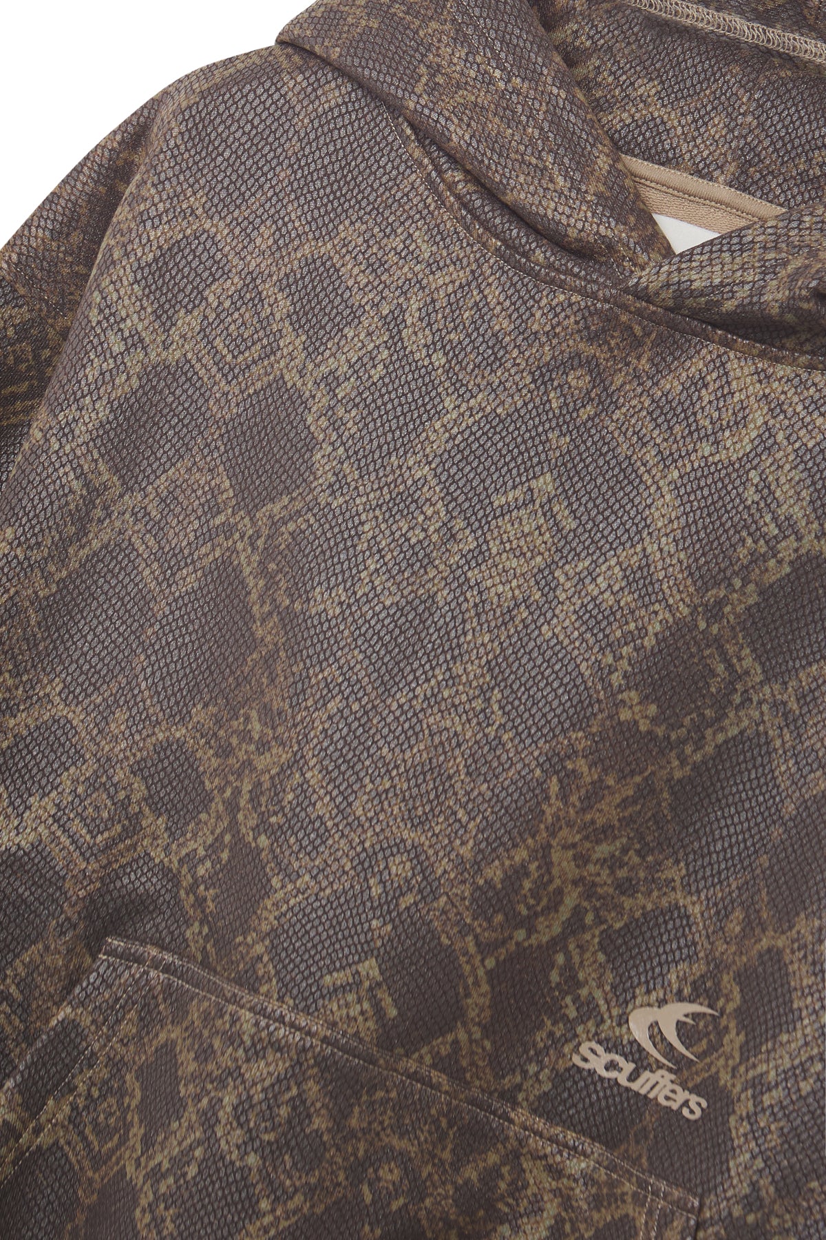 Cotton Hoodie featuring a snake pattern in a brown tone. The hoodie has a relaxed, oversized fit with a drawstring hood, ribbed cuffs, and a ribbed hem for a secure fit. It includes a front kangaroo pocket and a subtle tonal "scuffers" logo printed on the chest.