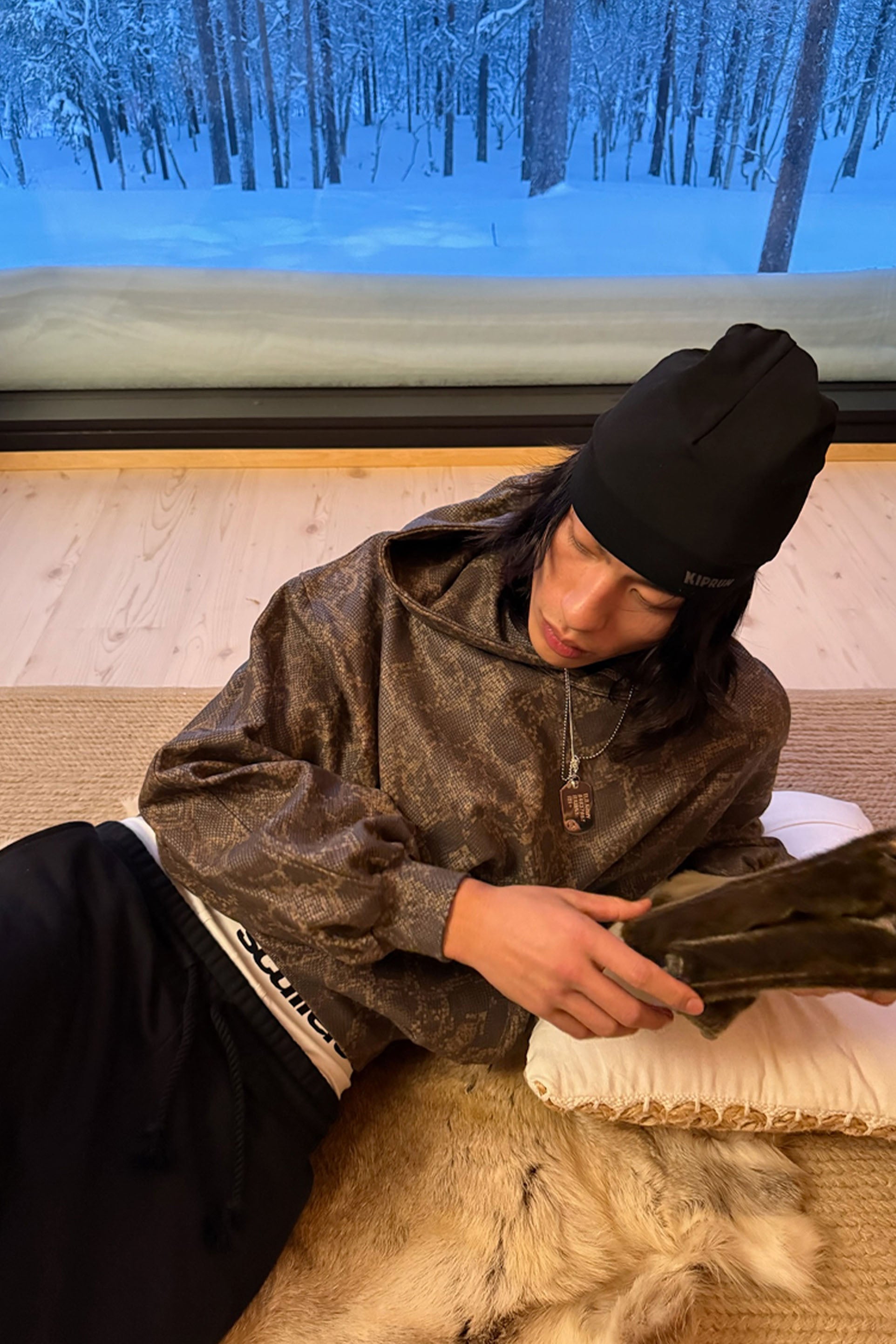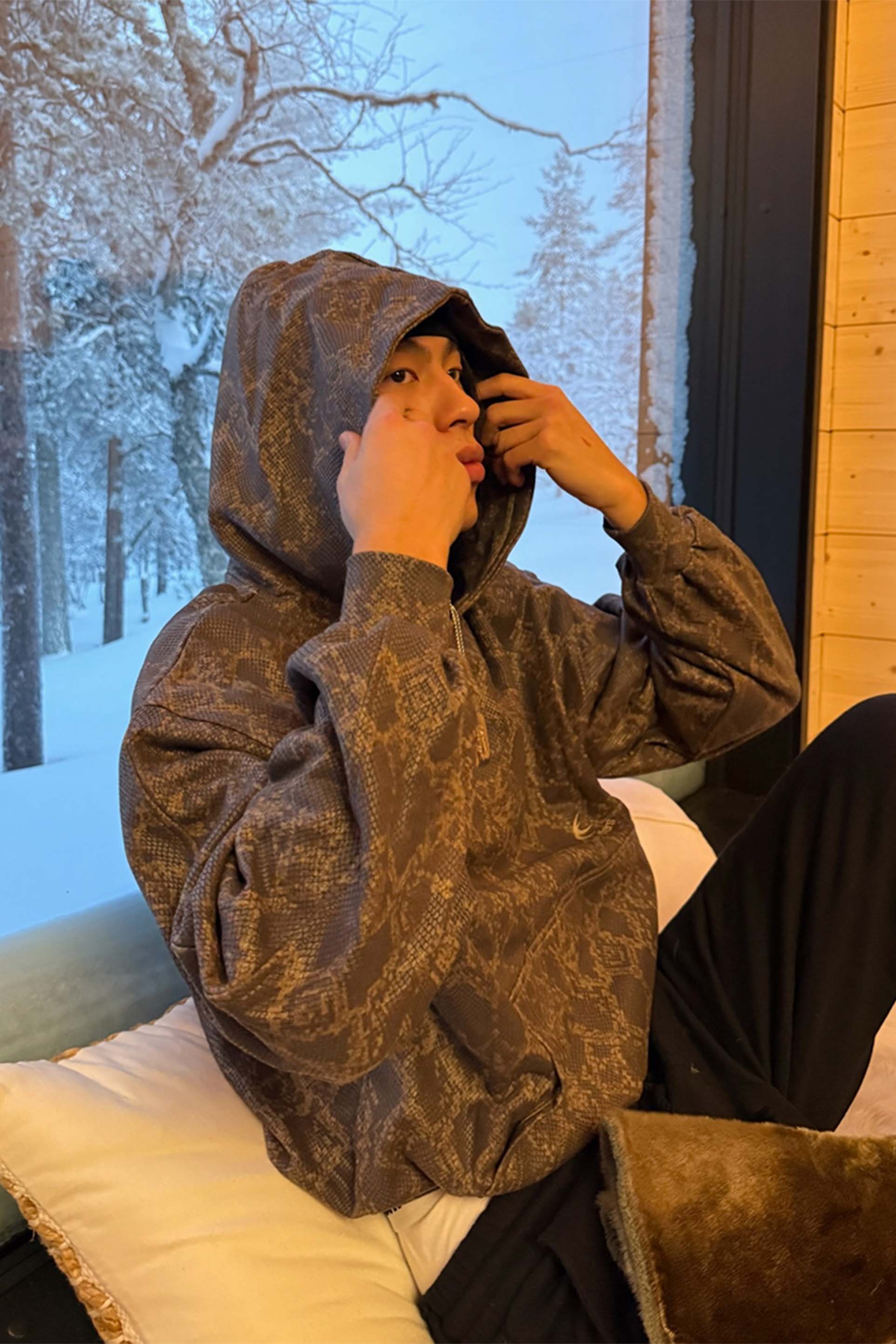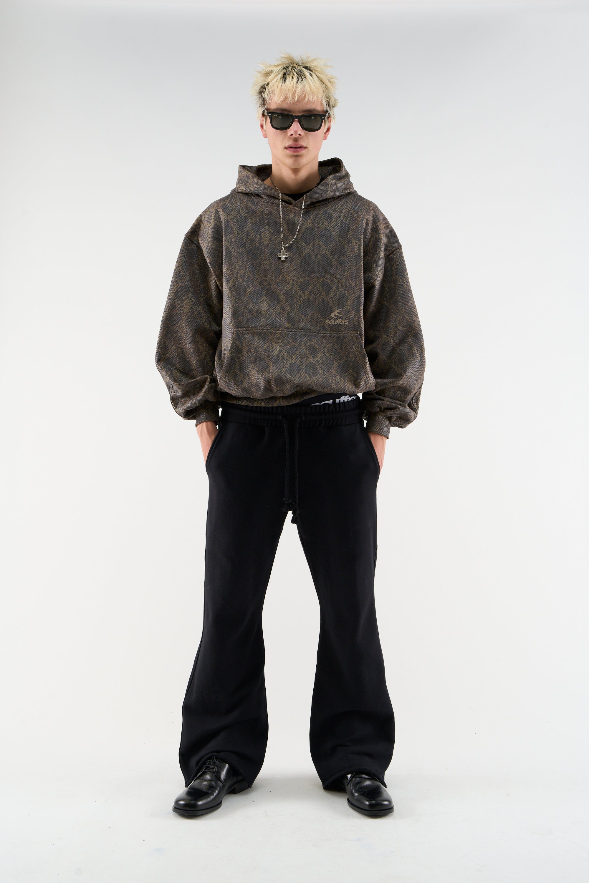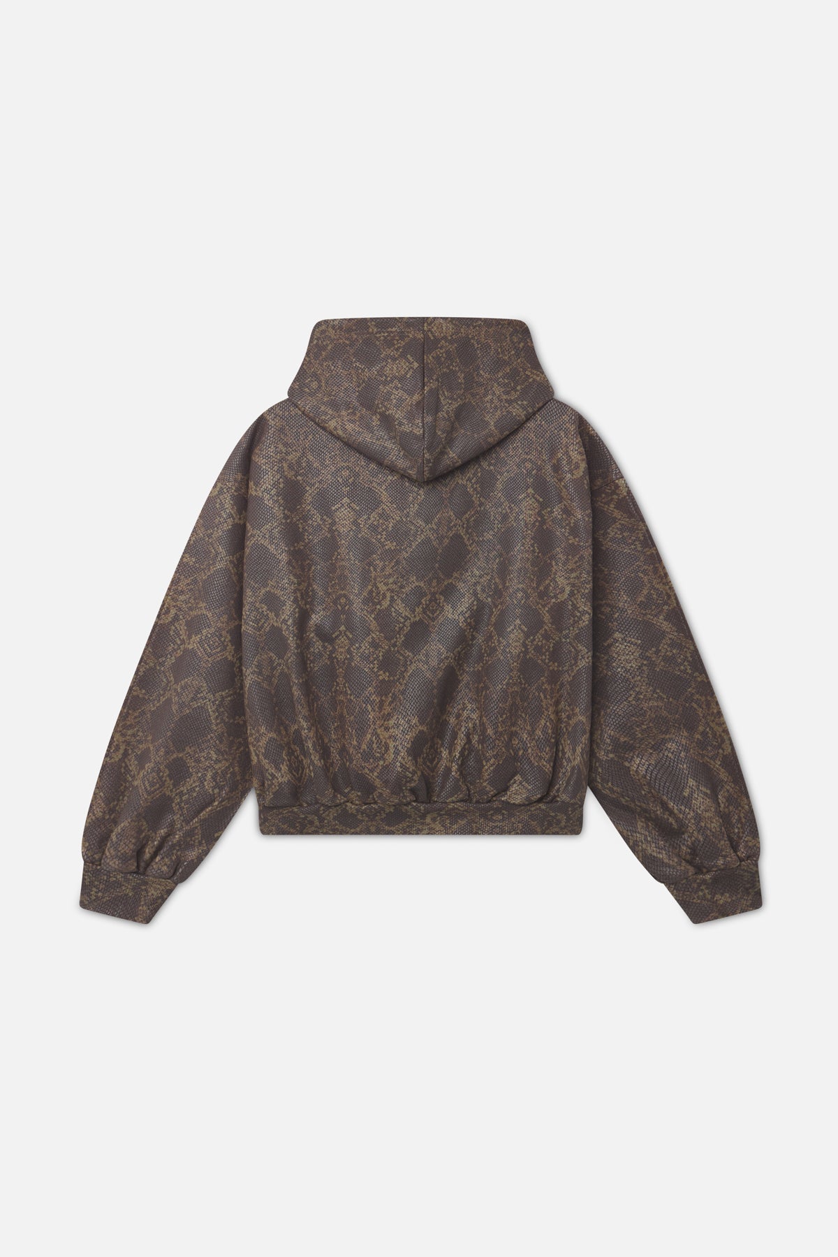 Cotton Hoodie featuring a snake pattern in a brown tone. The hoodie has a relaxed, oversized fit with a drawstring hood, ribbed cuffs, and a ribbed hem for a secure fit. It includes a front kangaroo pocket and a subtle tonal "scuffers" logo printed on the chest.