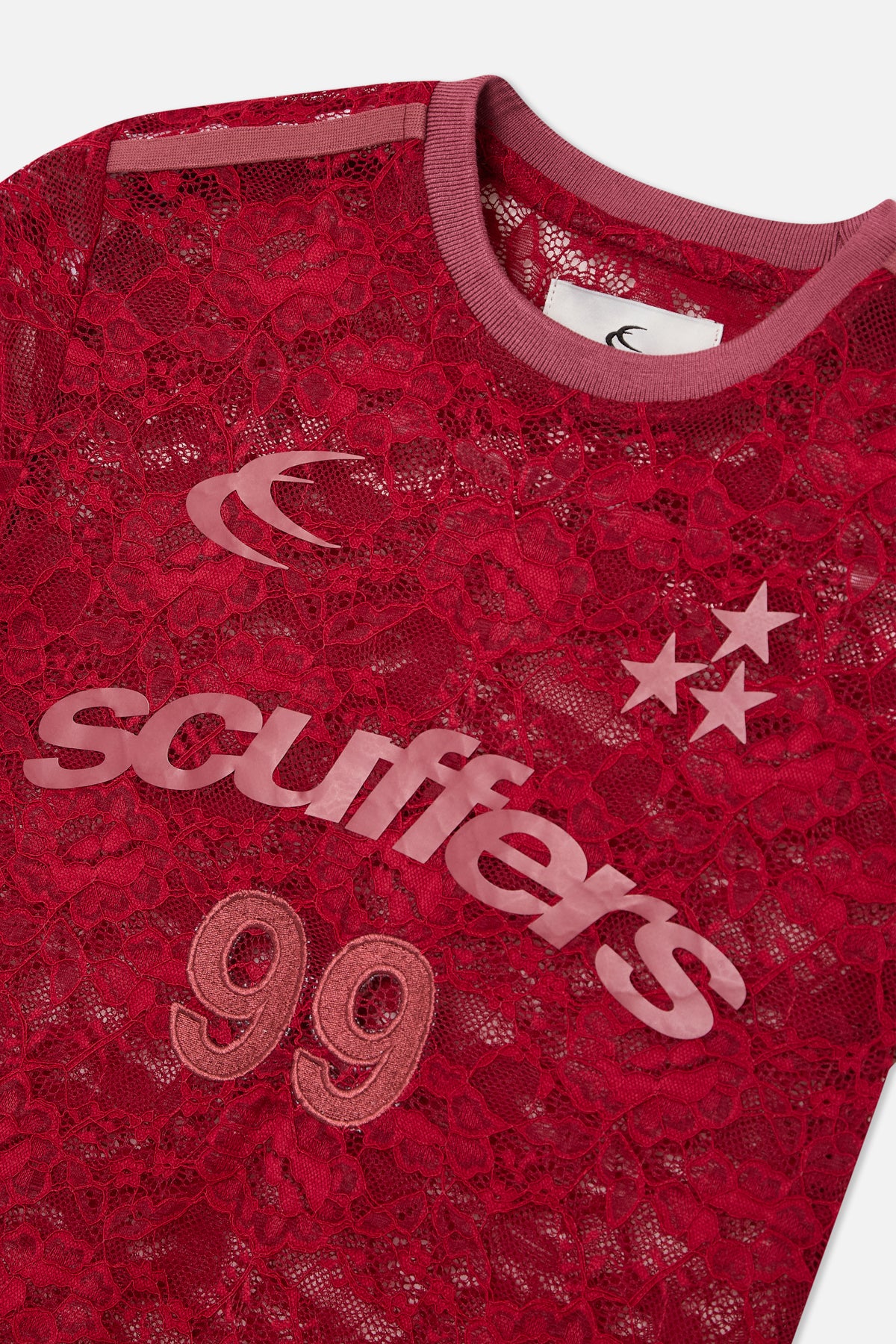 Lace Football Tee in Burgundy made from sheer floral lace with ribbed crew neckline. Features bold Scuffers logo and “99” patch on front, “withlove” print on back, and star graphics. Regular fit with short sleeves and contrast shoulder tape detail.