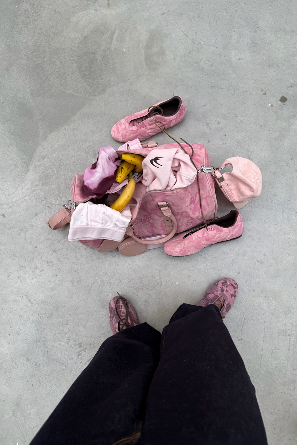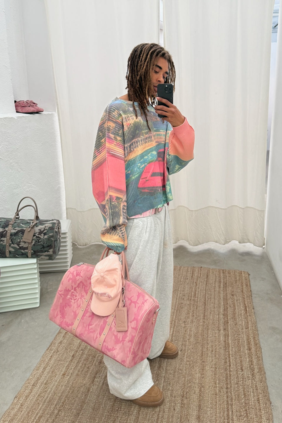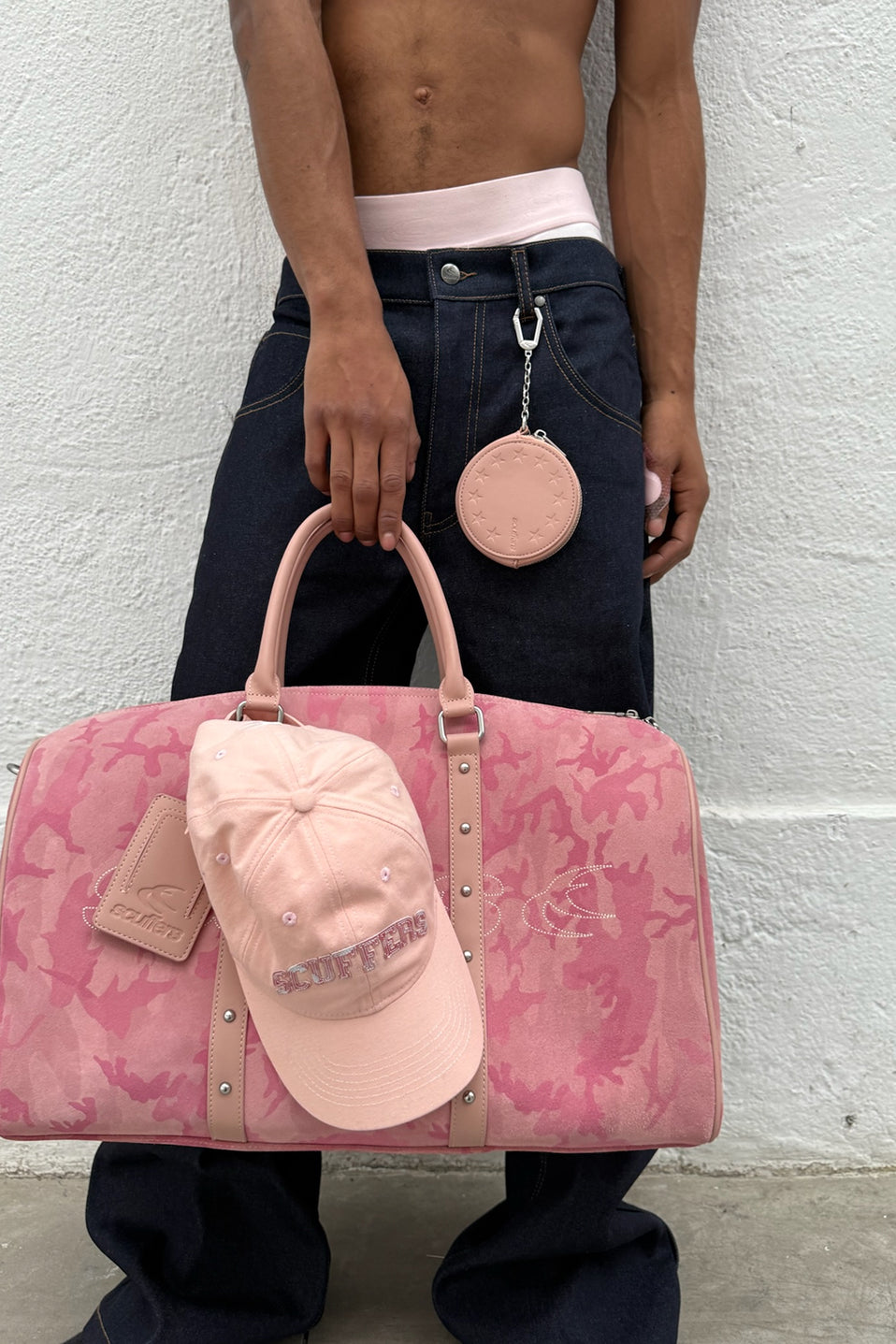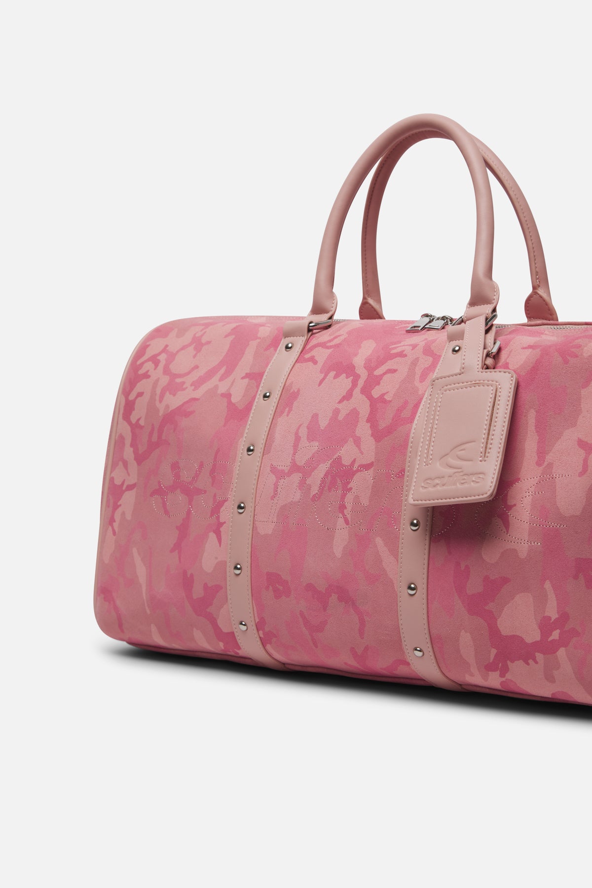 Pink Camo Duffel Bag made from genuine suede leather with an all-over tonal camouflage pattern. Features perforated Scuffers logo on front, twin leather handles, and detachable shoulder strap. Finished with metal rivet detailing, zip closure, and matching leather luggage tag. Structured silhouette with reinforced trim.